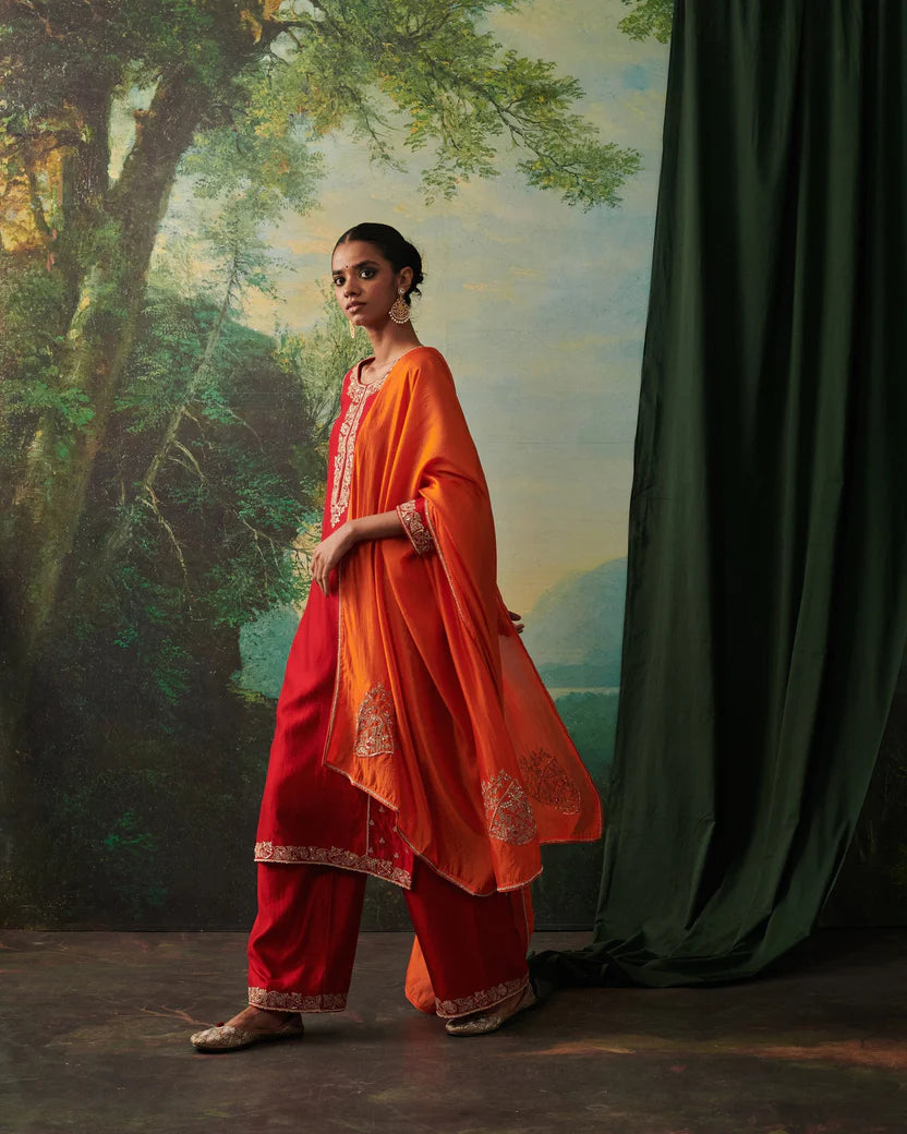 The ‘Meeka’ dupatta, seen here in a fiery orange, is crafted in organza silk. The vibrant hue flows gently over the shoulders, catching light with every movement. Panels of gota patti and marodi embroidery frame the corners-finished with hand-done thread and bead work in paisley-inspired motifs. Thoughtfully balanced in placement, the embellishments add depth without weighing down the fluidity of the fabric.