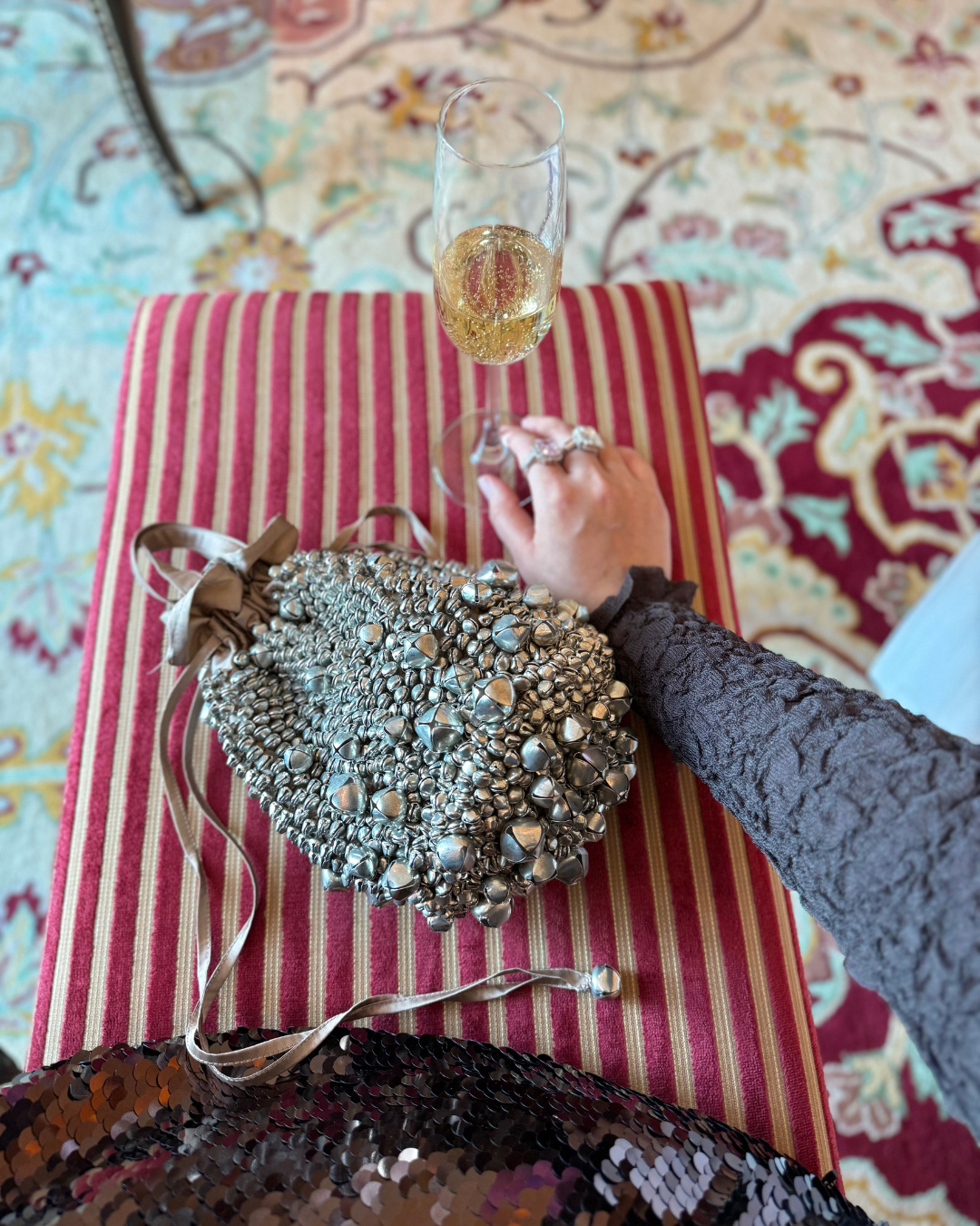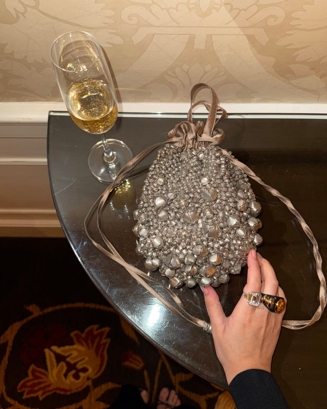 The Jhoom Rocky Bucket Bag, fashioned in nude taffeta and hand-embellished with hundreds of silver ghungroo of varying sizes that create a beautiful, undulating texture, is dramatic, dreamy, and all-consuming, with a 5" width and 10" height that comfortably fit all phones and every essential, though the actual product and its colors may vary slightly from the images due to device screen differences and variations in lighting during the shoot.t