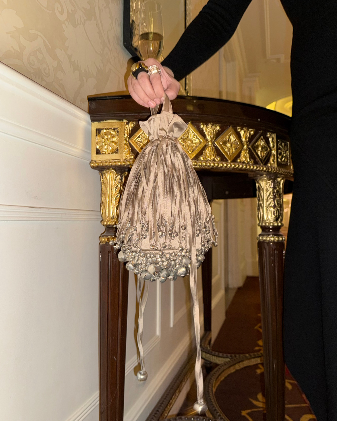 The Lennon Rocky Bucket Bag, fashioned in nude taffeta, offers an irresistibly fun experience through the synchrony of silver ghungroo adorning its concave bottom and taffeta fringes finished with ghungroo endings, while its 5" width and 10" height provide ample space to fit all phones and every essential, though the actual product and its colors may vary slightly from the images due to device screen differences and variations in lighting during the shoot.