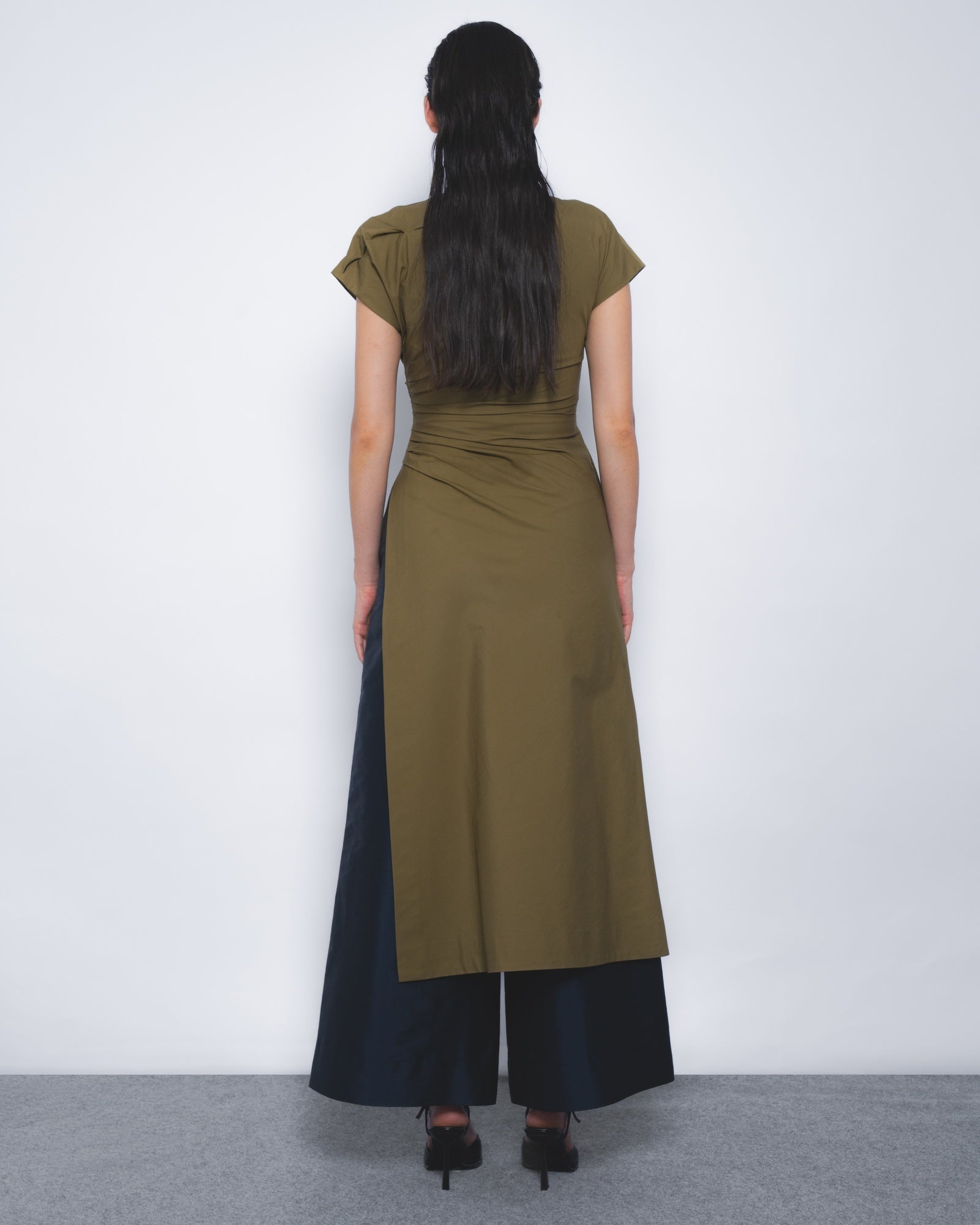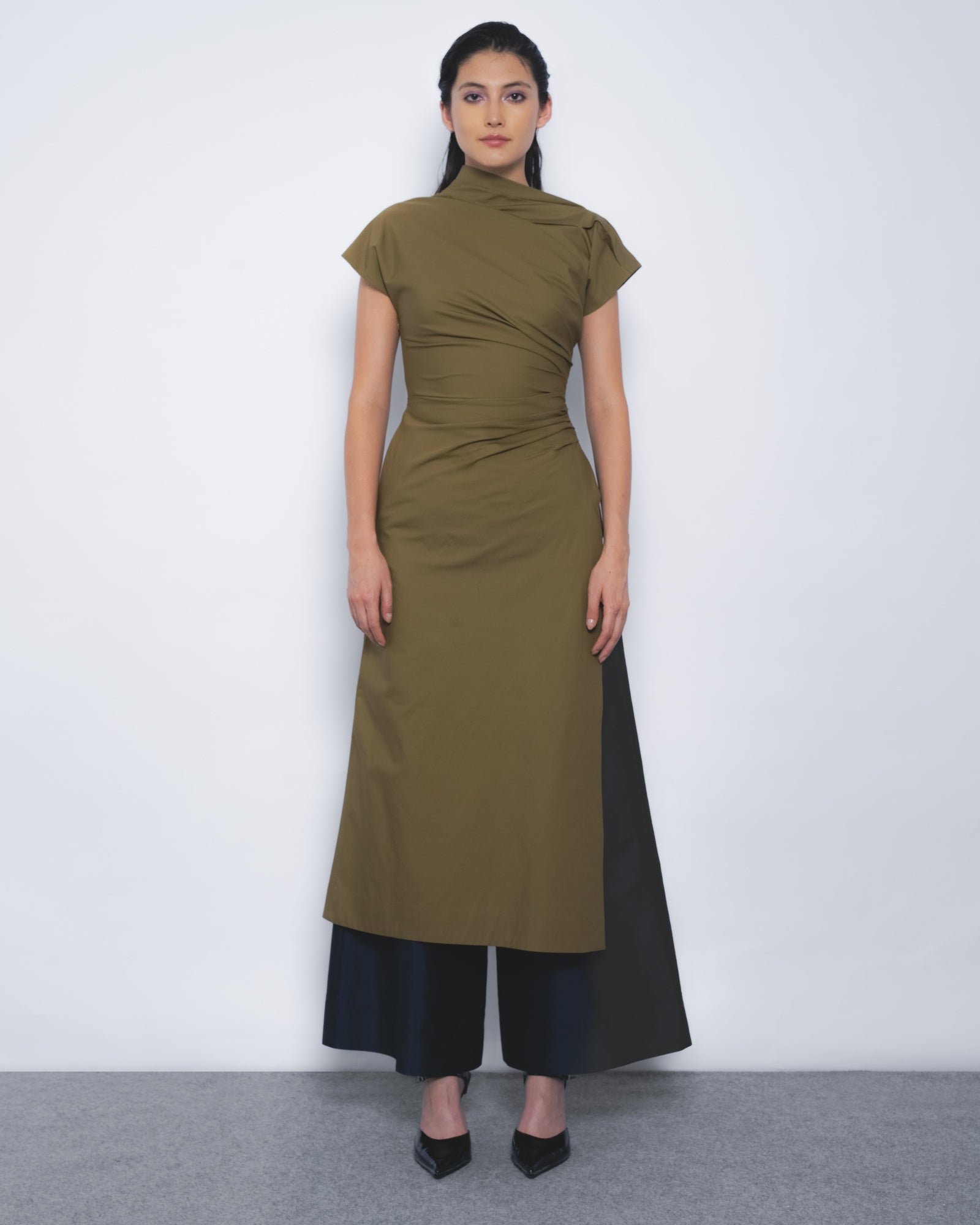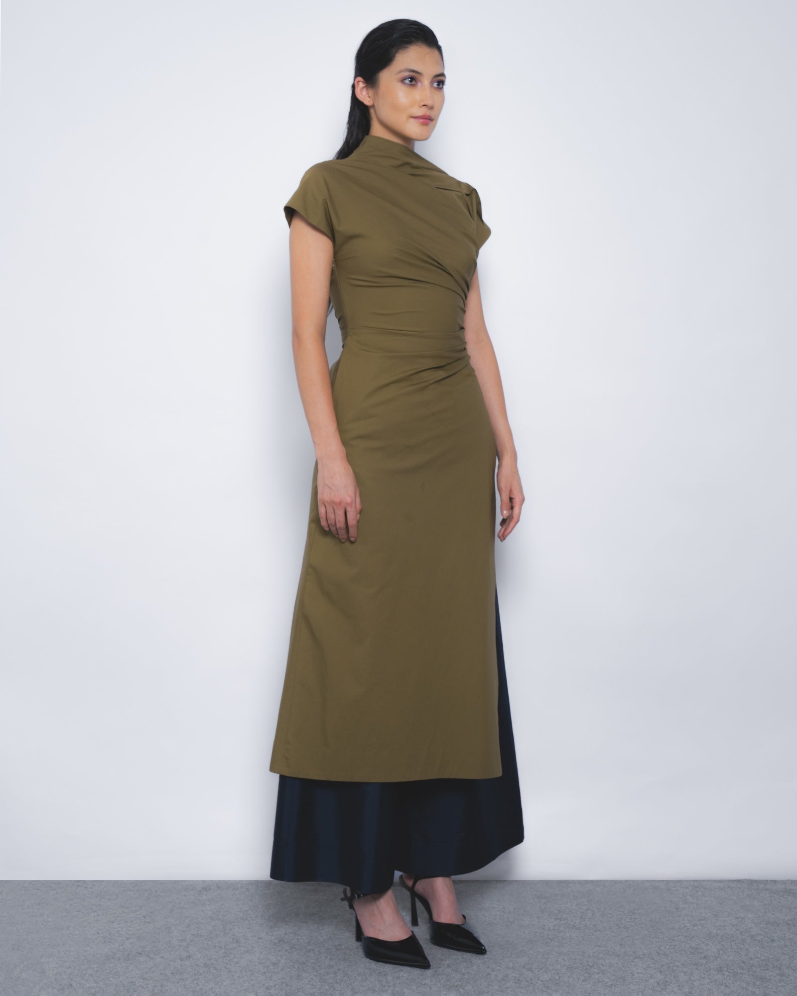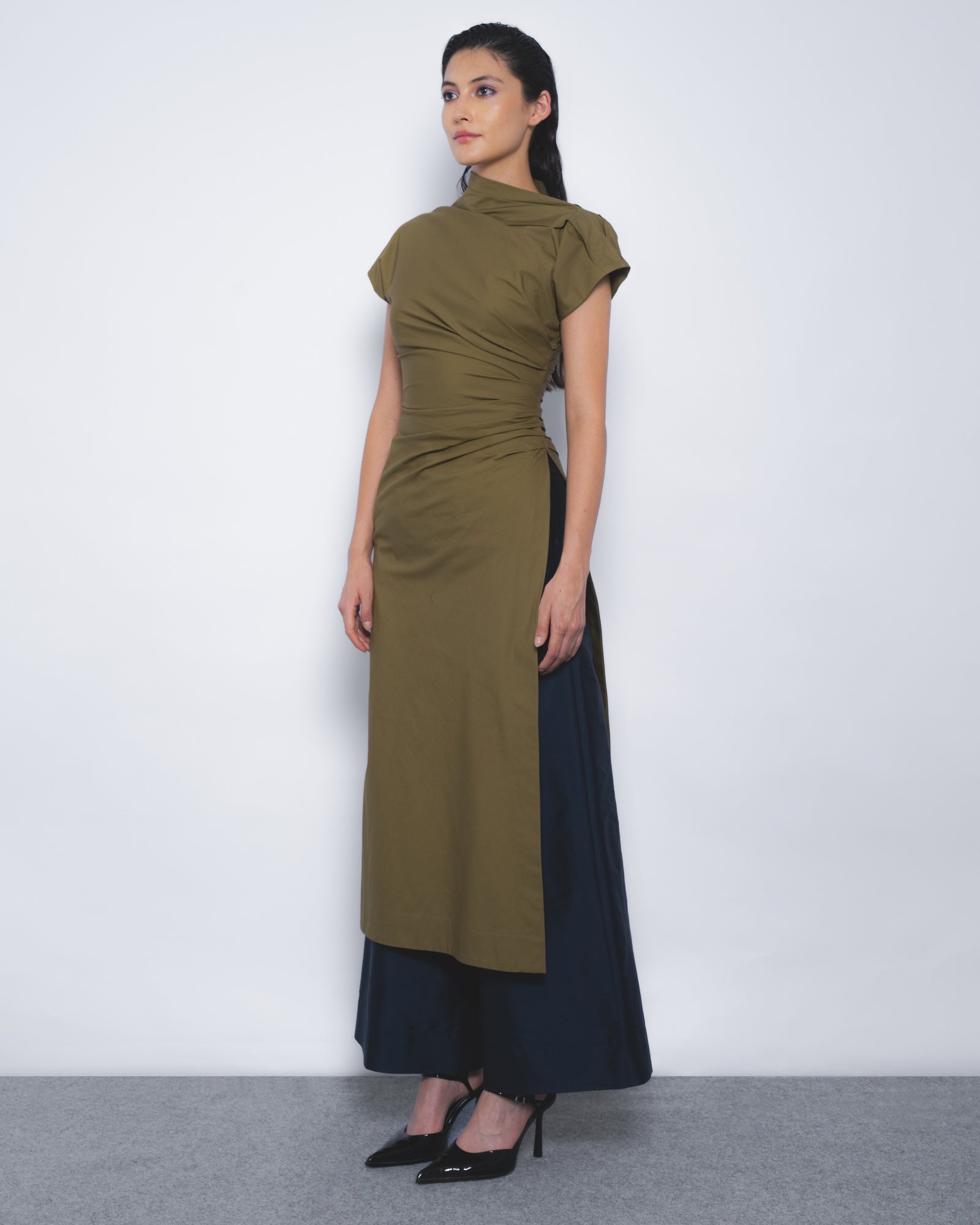 This asymmetrical silhouette explores fabric manipulation, draped to contour the torso and detailed with side pleats. A slit from the waistline adds, shaping an elegant yet contemporary style.