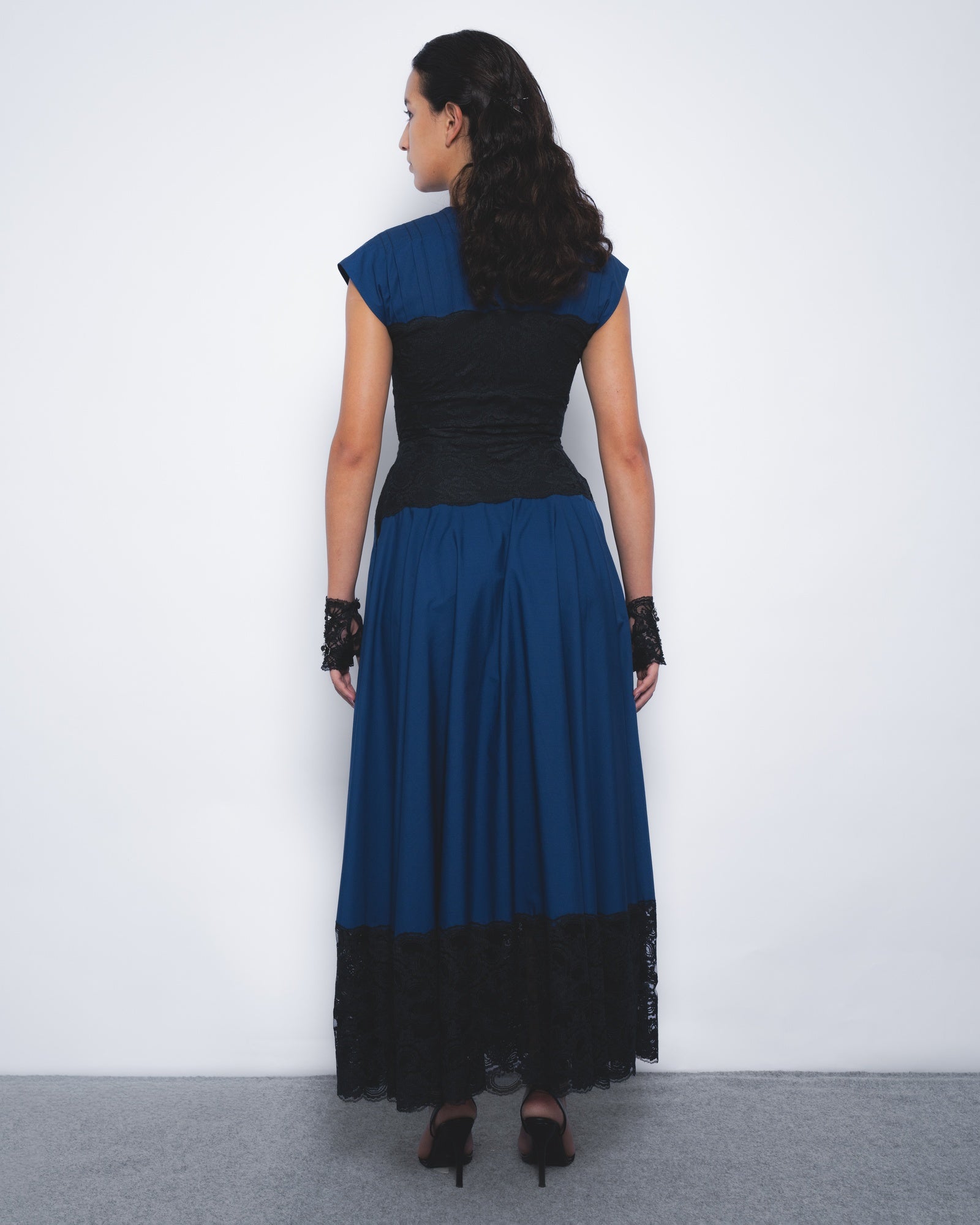 An imterplay of materials, this fit and flare silhouette with minimalistic details evokes elegance and grace, hifhlighted with lace at the bodice and across the hemline.