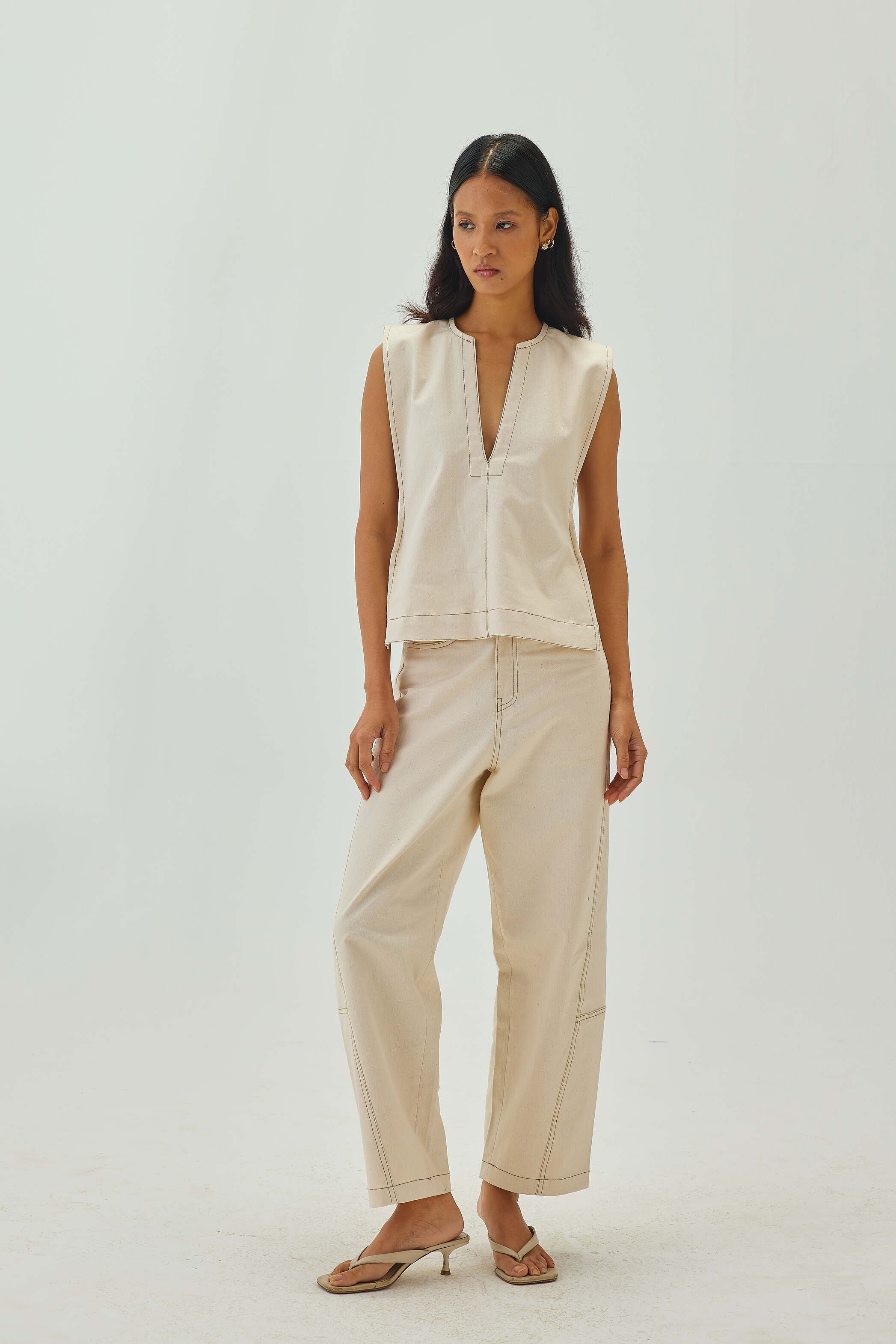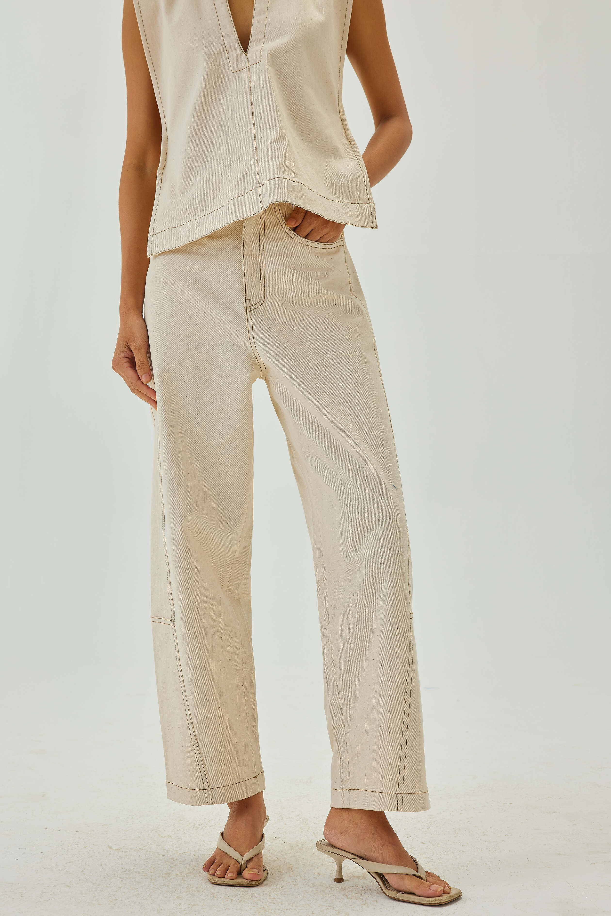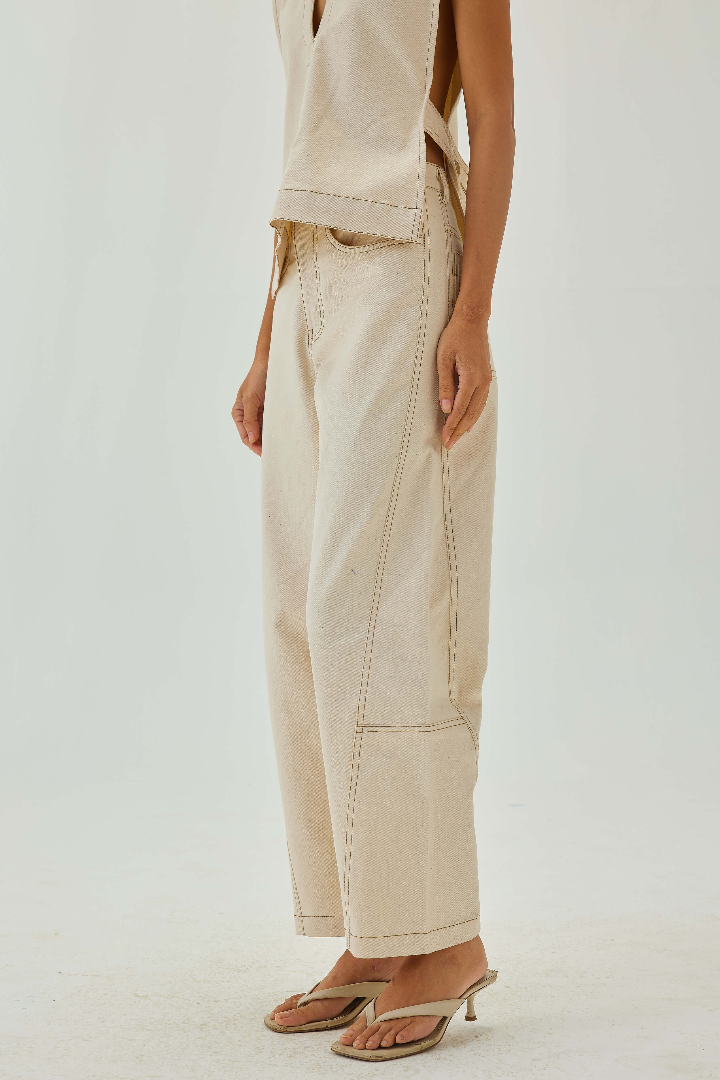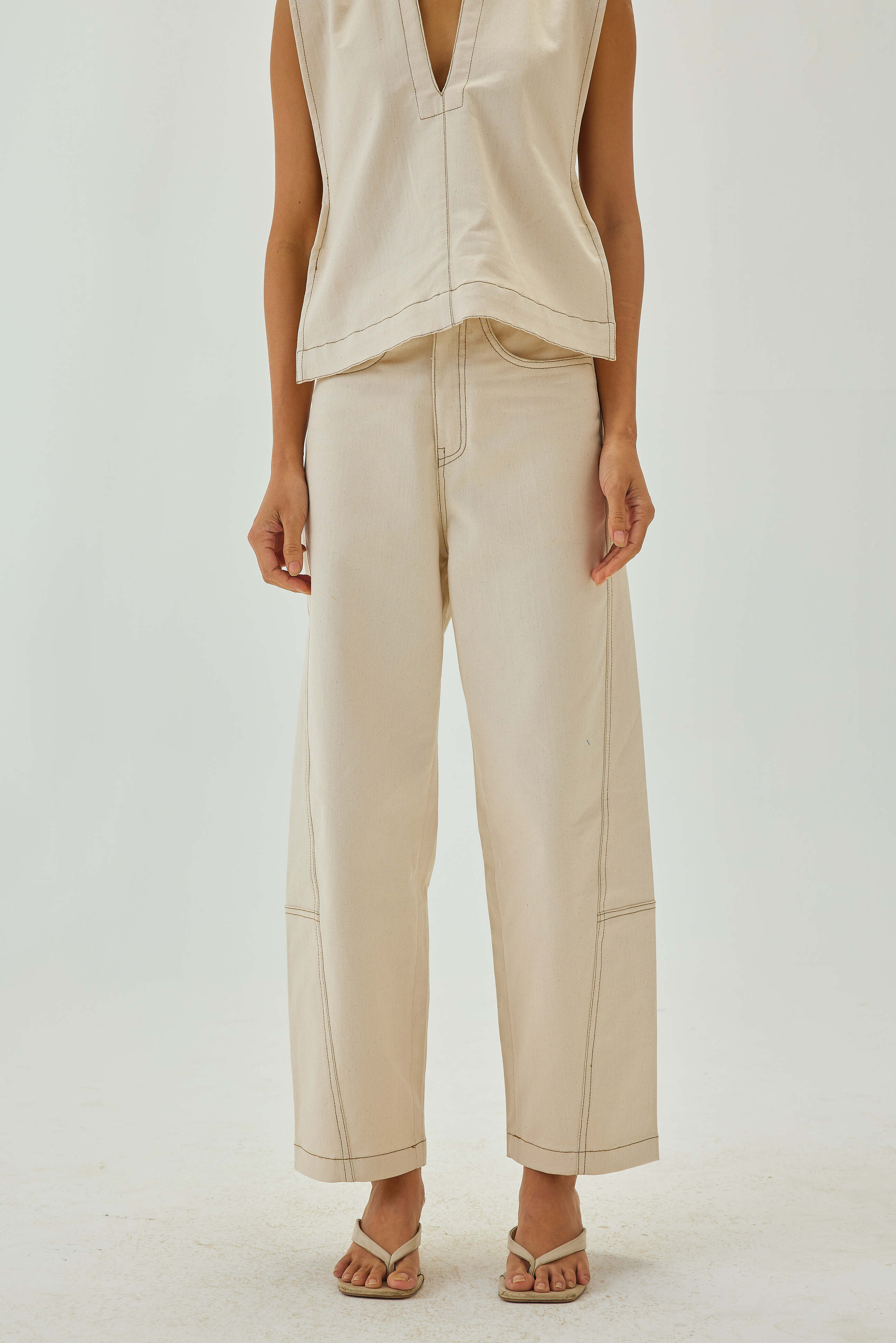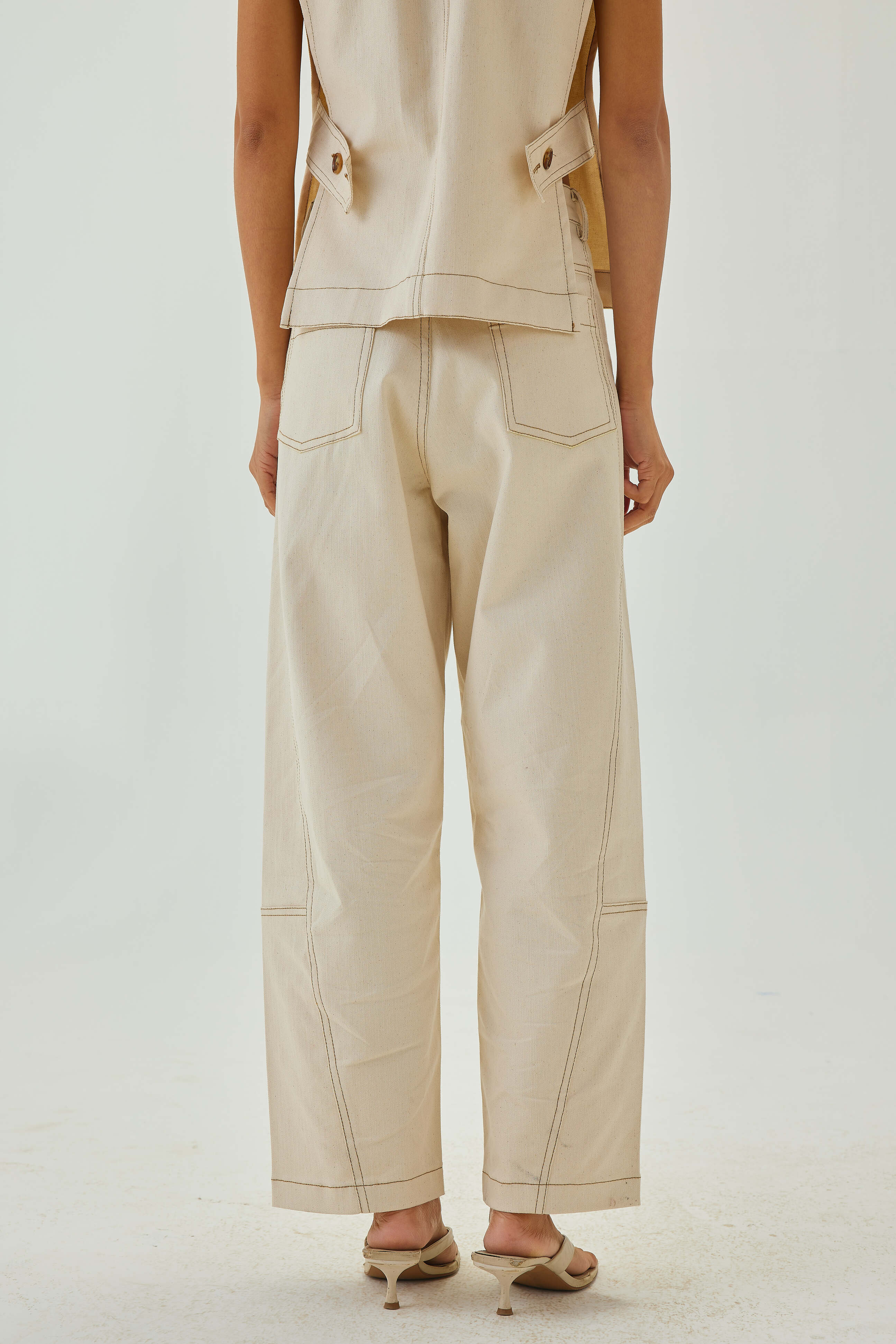 High-waist off-white barrel pants with full length, structured panel seams, and contrast stitching; the model is 5'8" and wearing size XS, and the product will be dispatched in 3–4 days with a 7-day return/exchange policy.