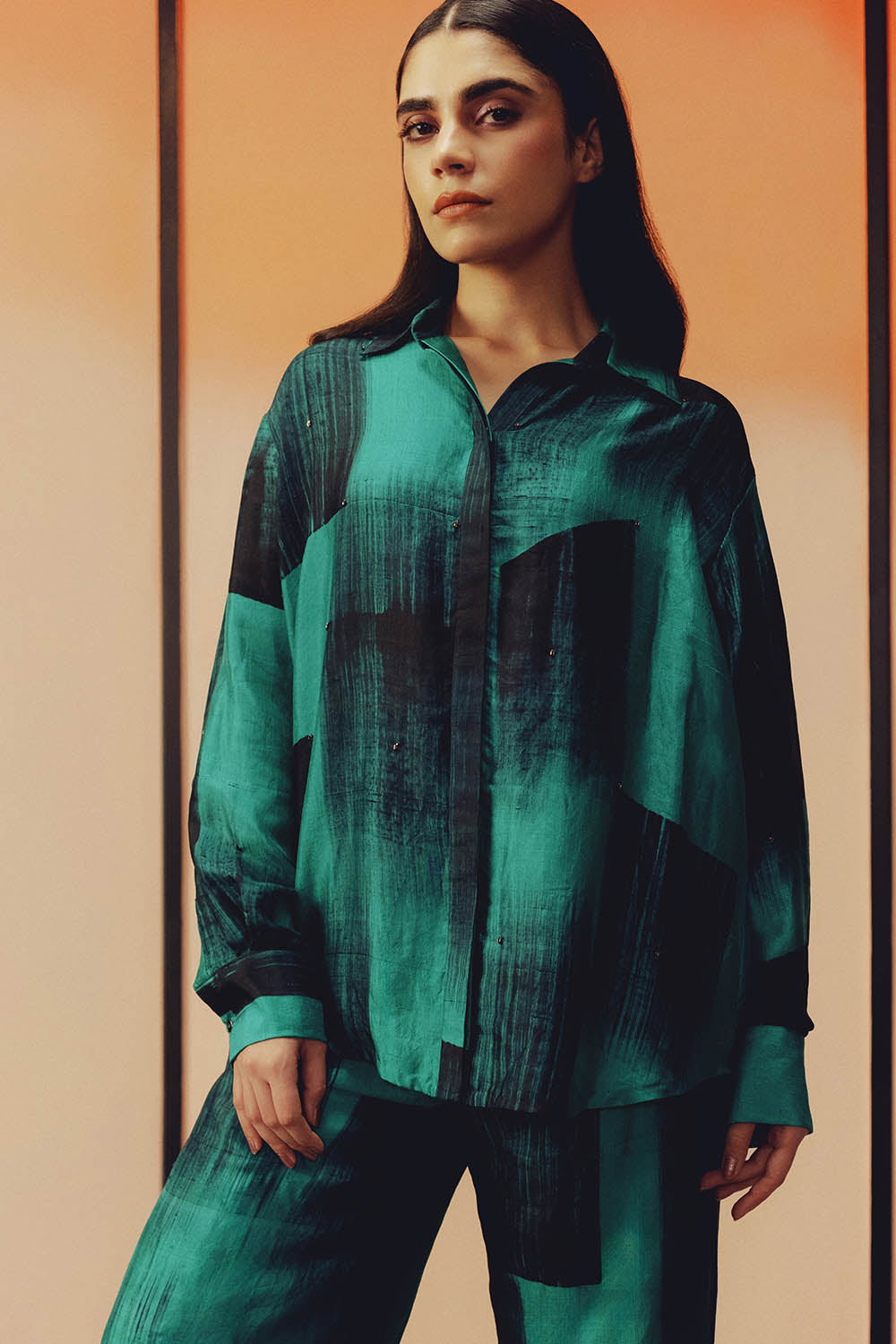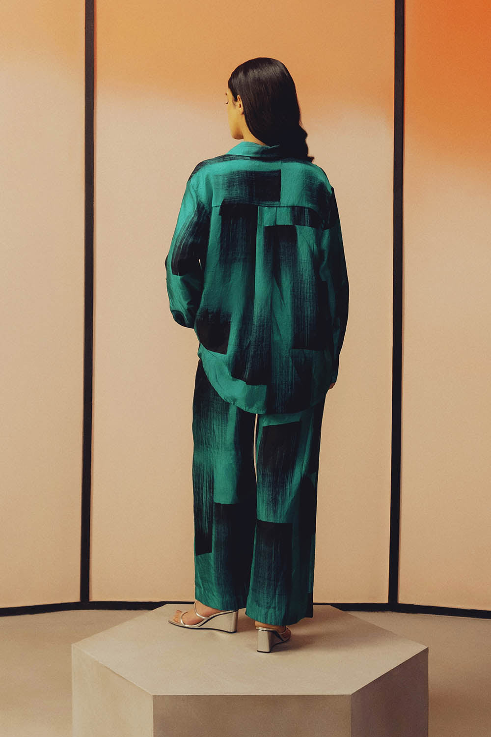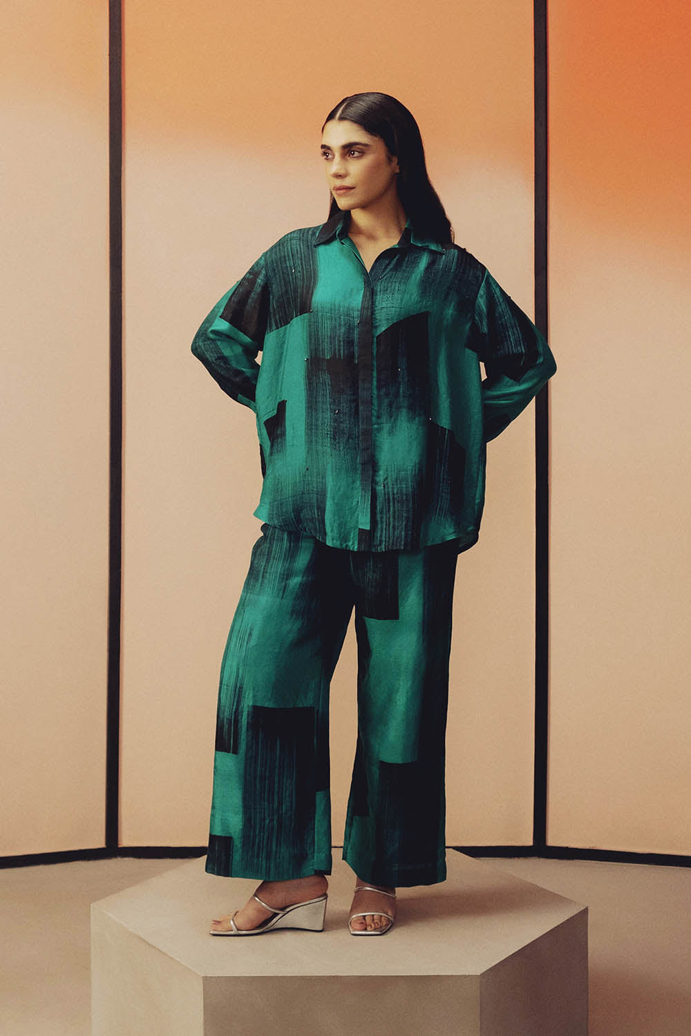 This handwoven mulberry silk shirt set features a hand painted print highlighted with glass beadwork detailing on the shirt. Designed in classic relaxed fit silhouette, it is paired with high waisted straight leg pants featuring an elastic waistband pockets on both the sides.