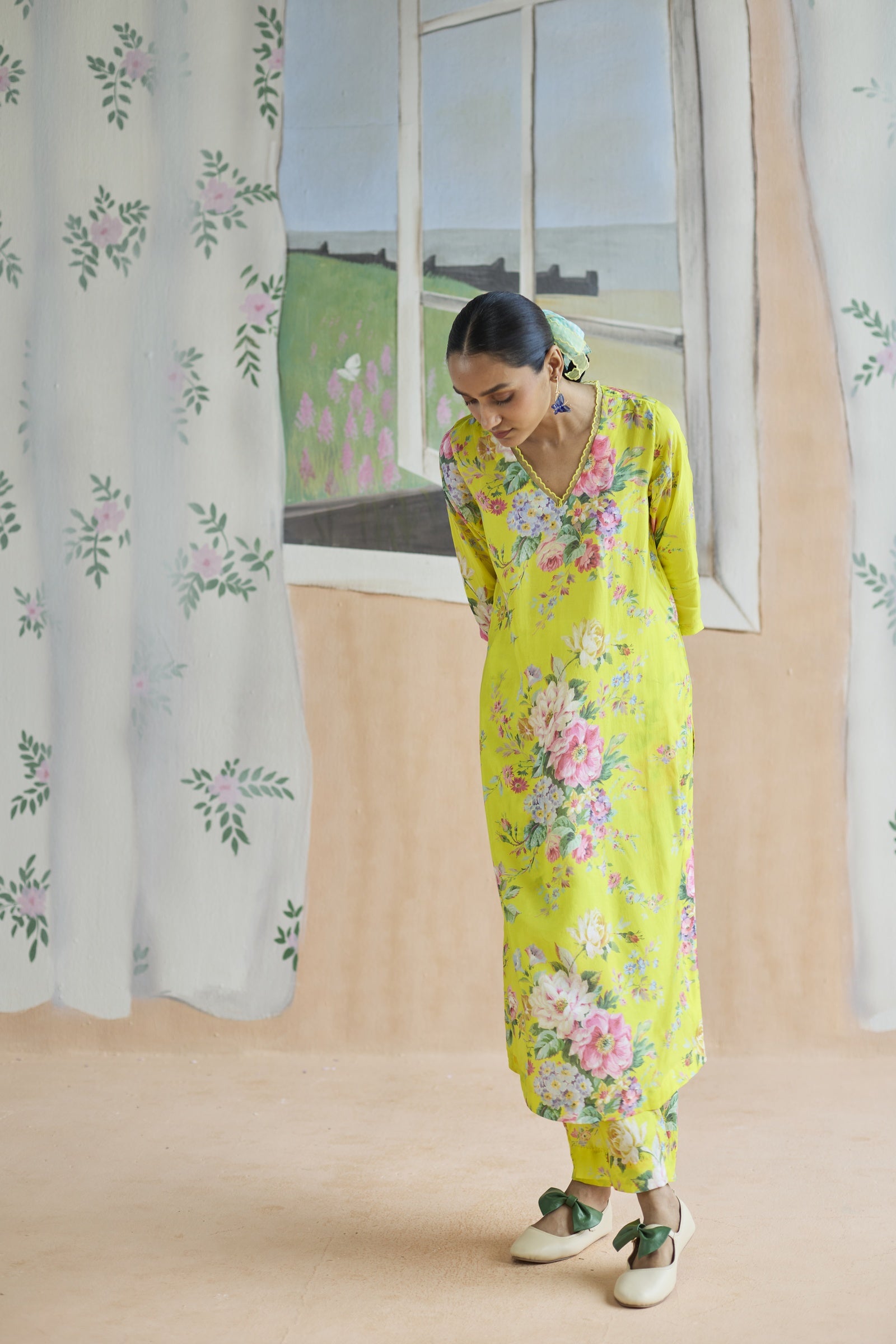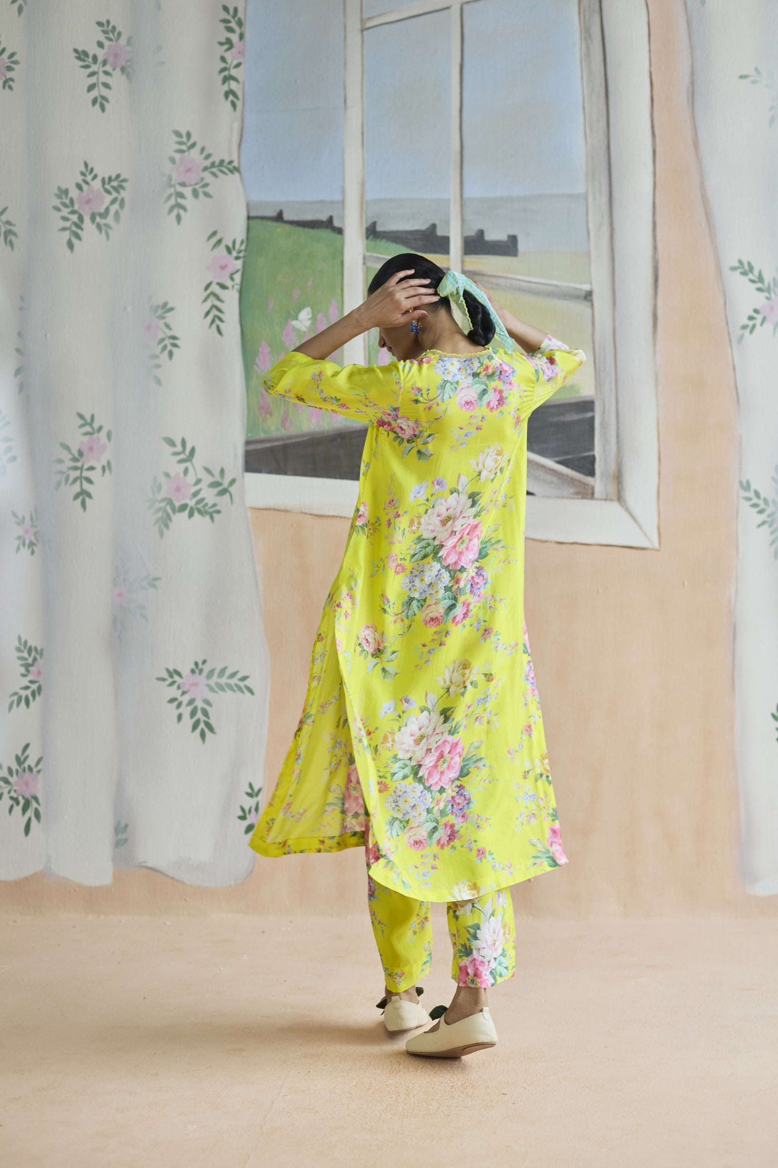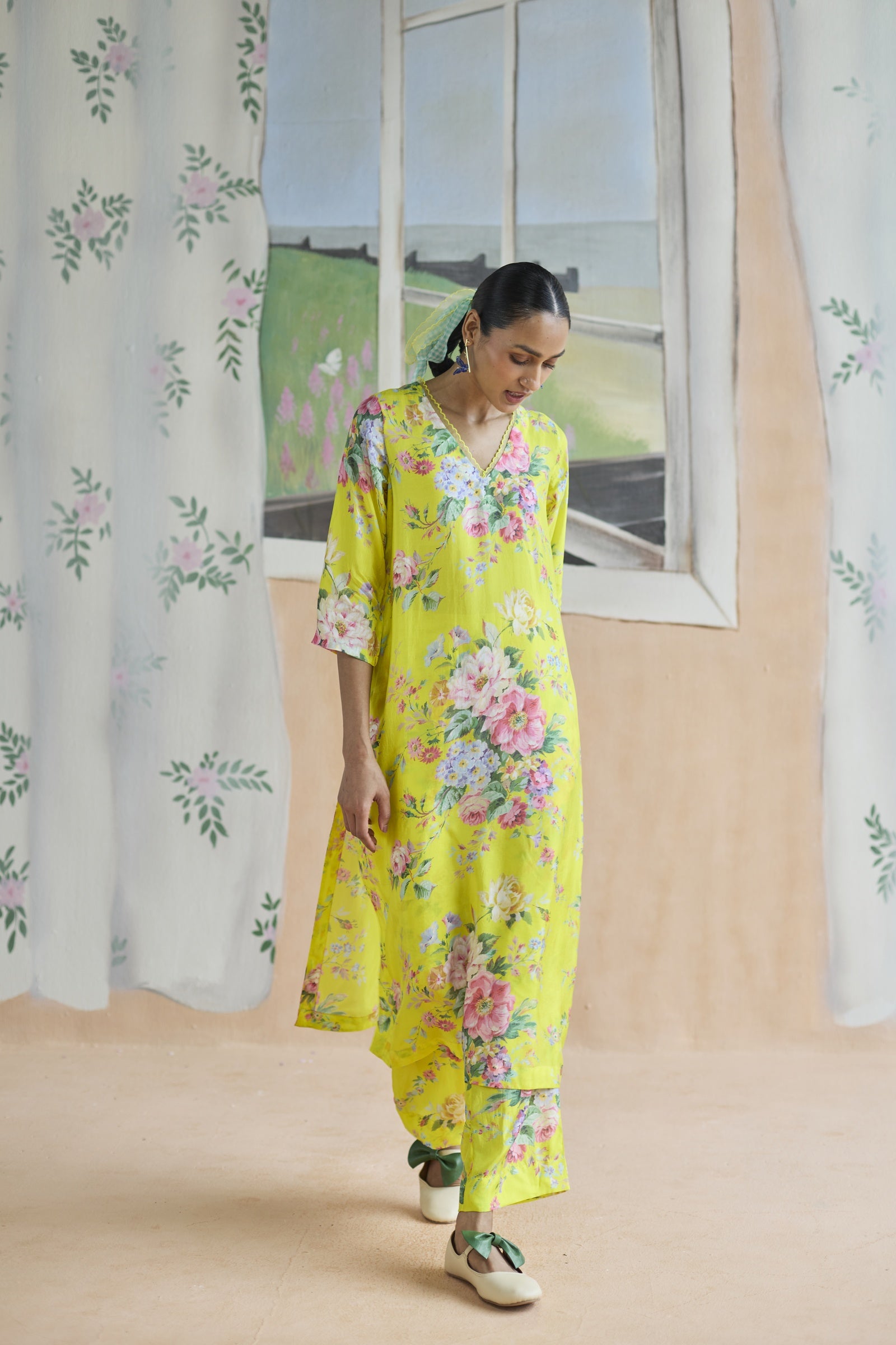 The Yellow Roses Long Kurta Set in bamboo silk makes a bold statement, allowing the ever-romantic roses to come alive with richness and depth. These blooms command presence, lending the ensemble an artful grandeur while maintaining a quiet sophistication. The silhouette features a relaxed fit that flows effortlessly, ensuring comfort without compromise. Its ease of movement, paired with tailored refinement, allows the outfit to transition seamlessly from day to evening. The model is 5 feet 7 inches tall and is wearing a size Small. Kurta length is 42 inches, and pant length is 36 inches.