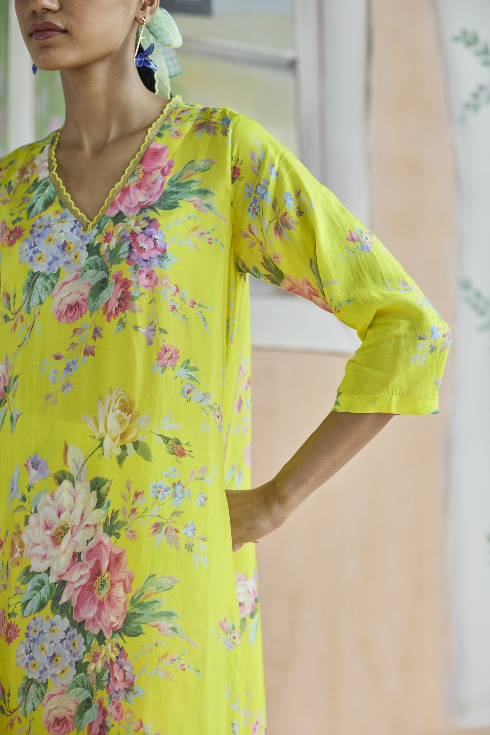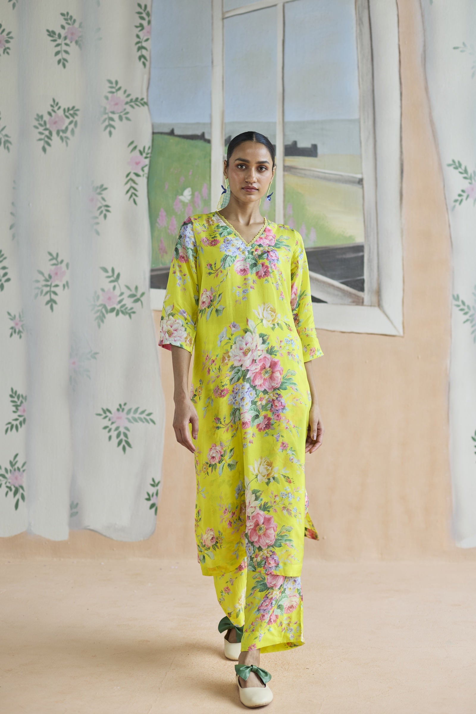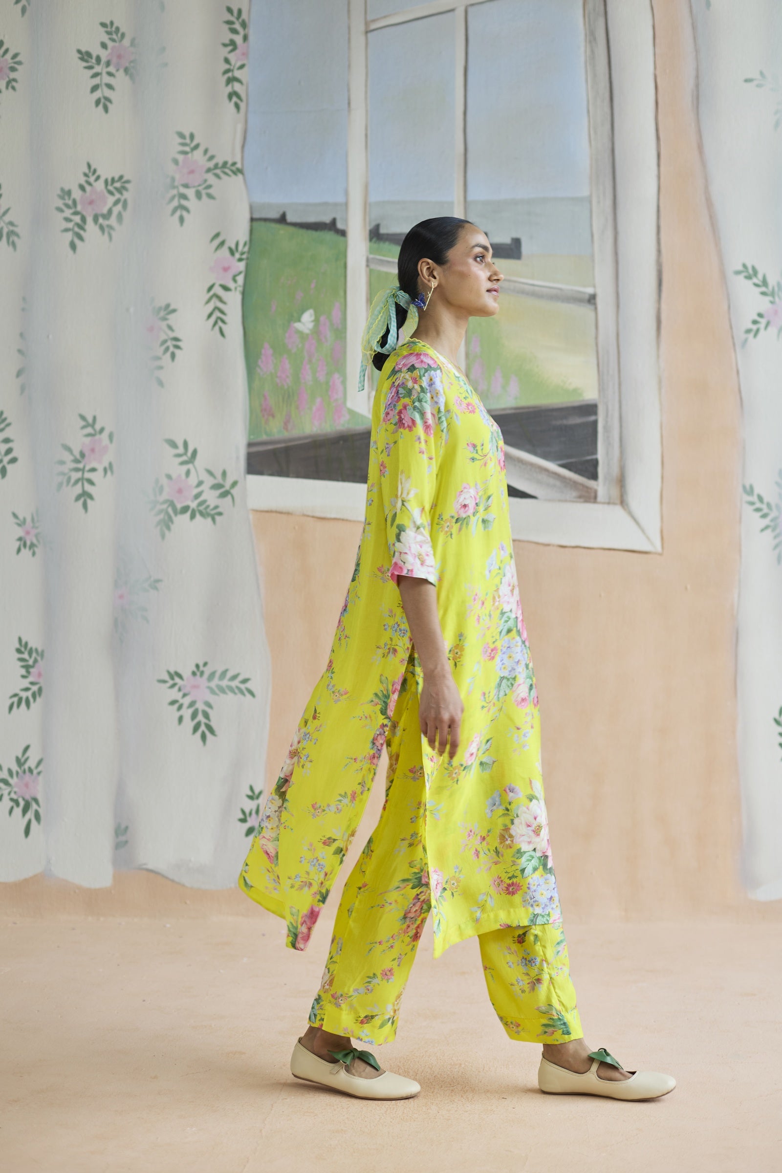 The Yellow Roses Long Kurta Set in bamboo silk makes a bold statement, allowing the ever-romantic roses to come alive with richness and depth. These blooms command presence, lending the ensemble an artful grandeur while maintaining a quiet sophistication. The silhouette features a relaxed fit that flows effortlessly, ensuring comfort without compromise. Its ease of movement, paired with tailored refinement, allows the outfit to transition seamlessly from day to evening. The model is 5 feet 7 inches tall and is wearing a size Small. Kurta length is 42 inches, and pant length is 36 inches.