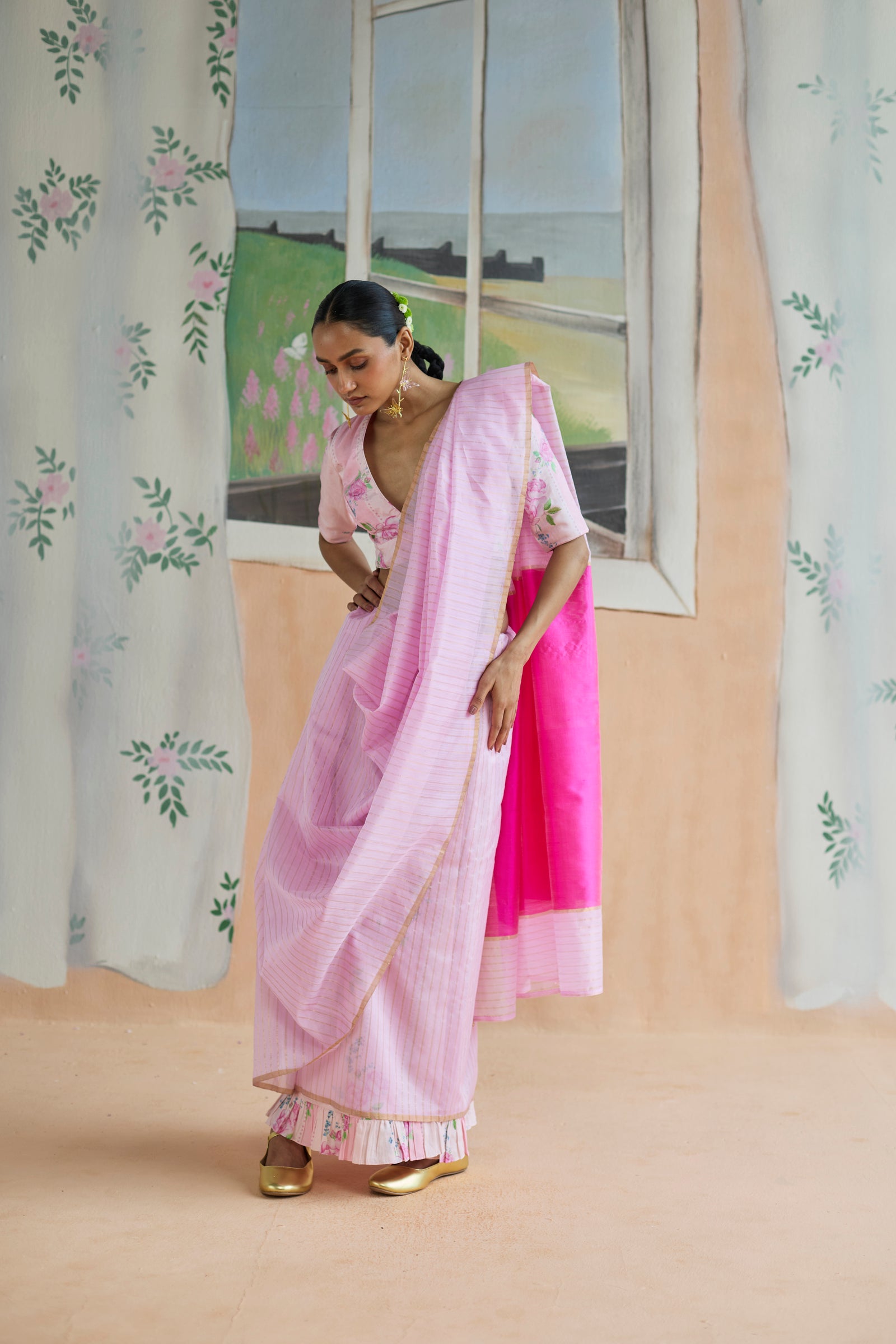 This pink sari in handwoven silk-cotton chanderi is playful take on minimalism with a bold, yet understated elegance. The solid colour is a study in quiet sophistication. But what truly sets this look apart is the styling narrative: paired with a pink rose stripe blouse piece and matching underskirt that peeks through, revealing a striking duality. It’s a play of texture, contrast, and layering—a modern interpretation of traditional fabric that balances restraint with expressive detail. The drape offers a graceful fluidity—perfect for moments that call for elegance without excess, making it perfect for brunches or a formal evening.