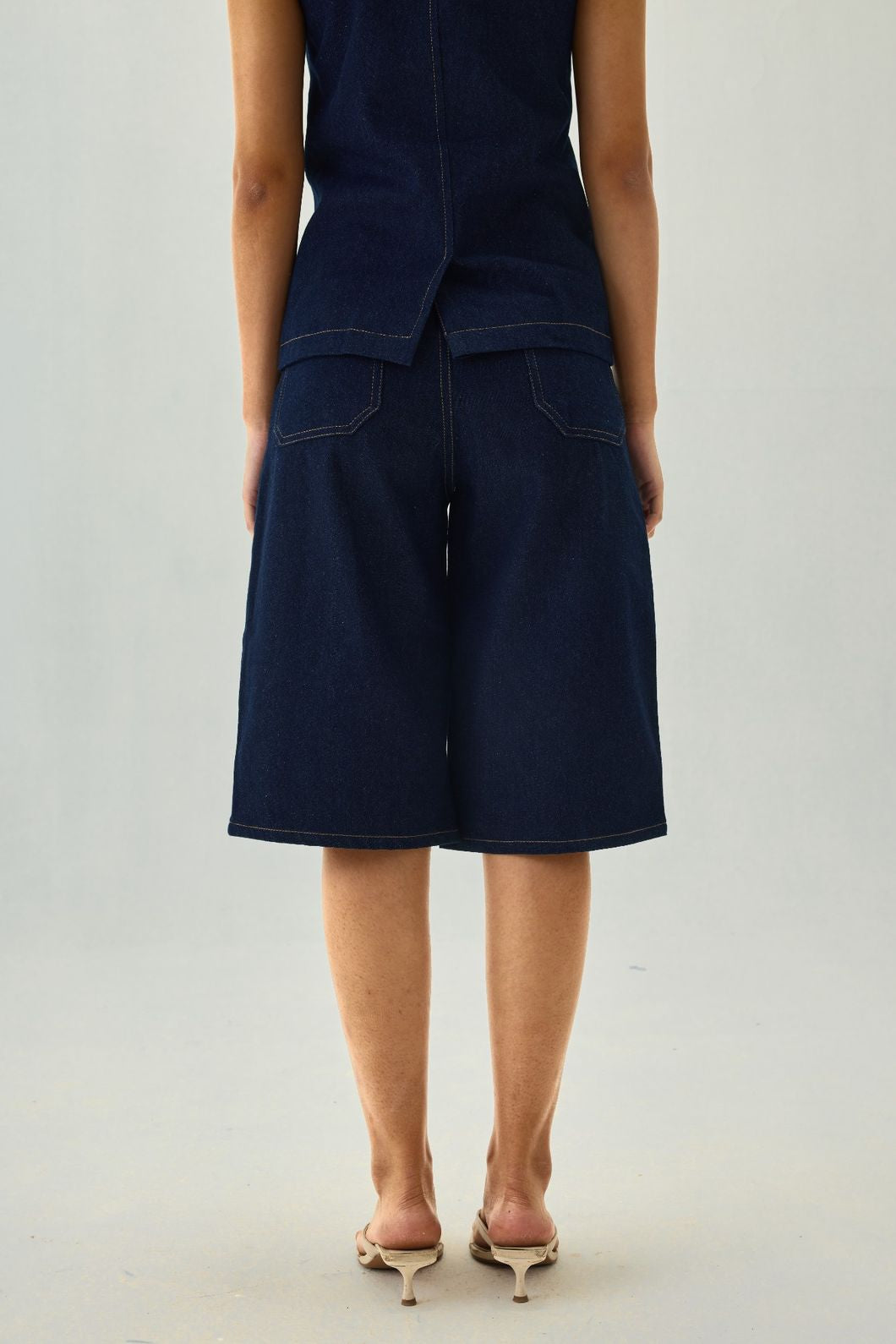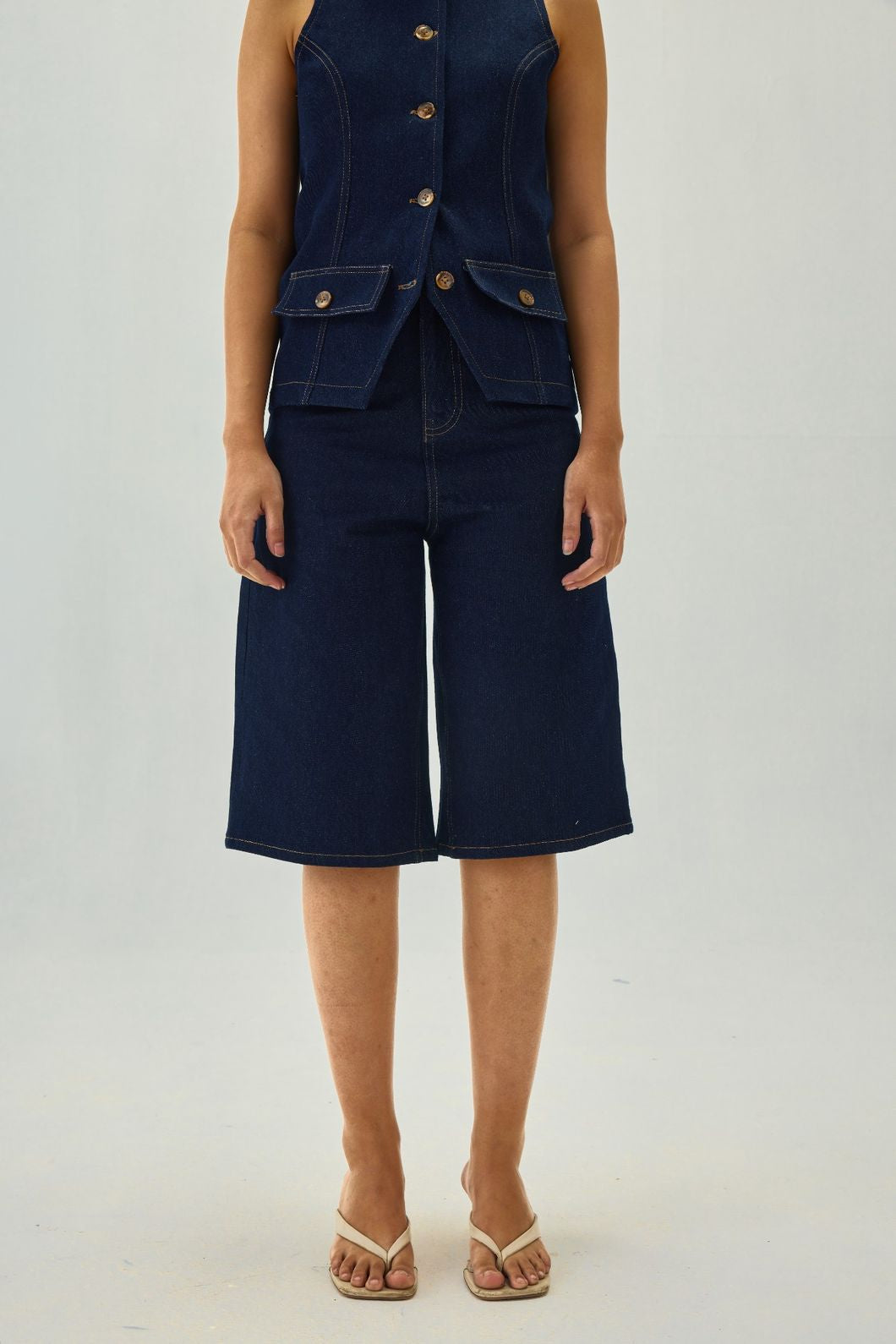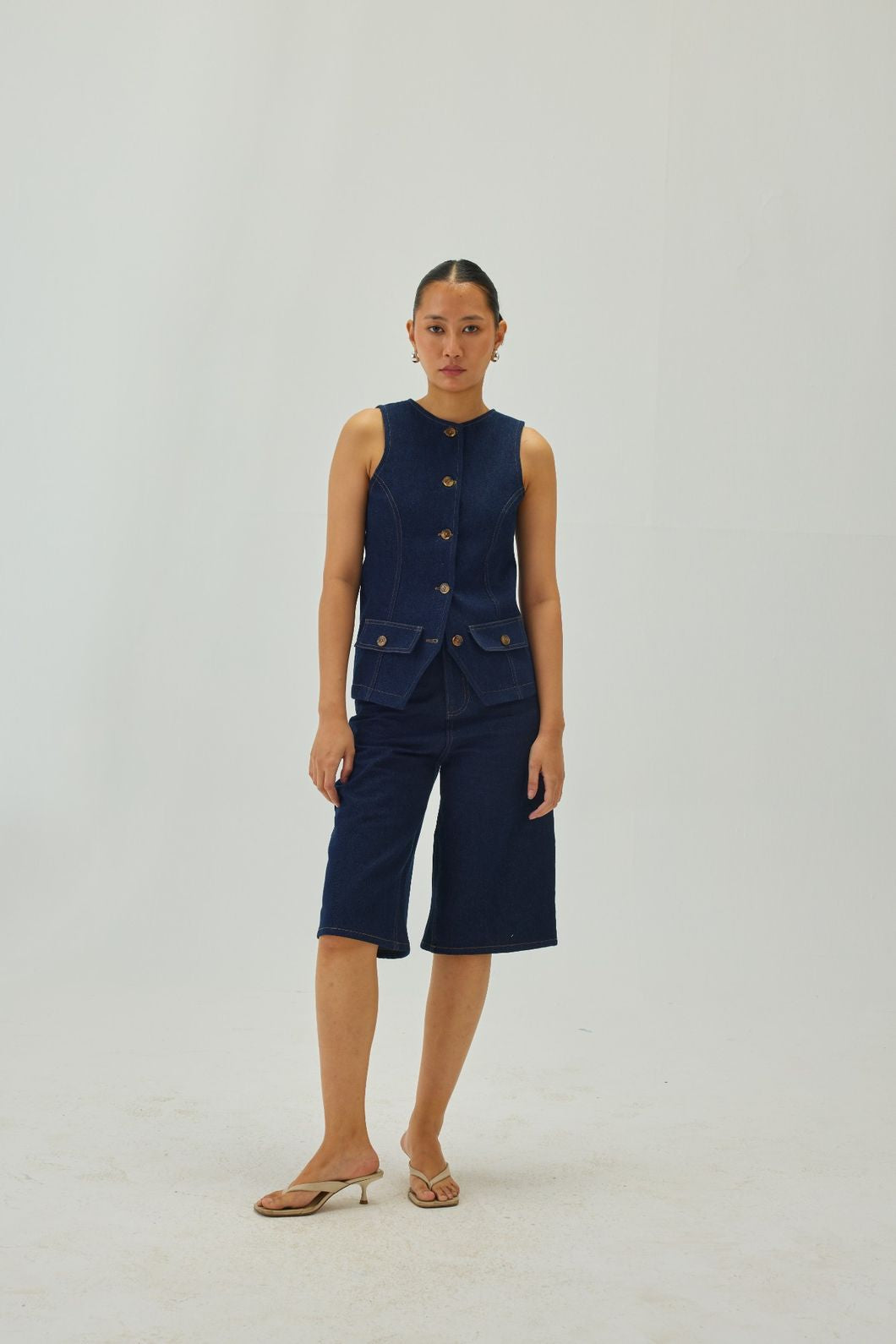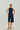Dark blue denim button-down jacket with a collared neckline, relaxed A-line silhouette, front patch pockets, waist-snatch detailing on the inside, and wide three-quarter sleeves; the model is 5'8" and wearing size XS, and the product will be dispatched in 3–4 days with a 7-day return/exchange policy.