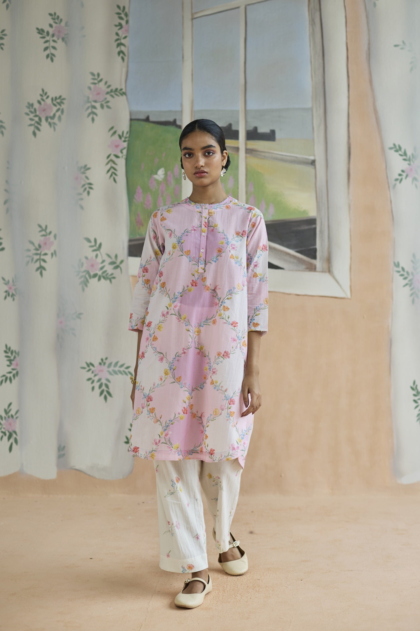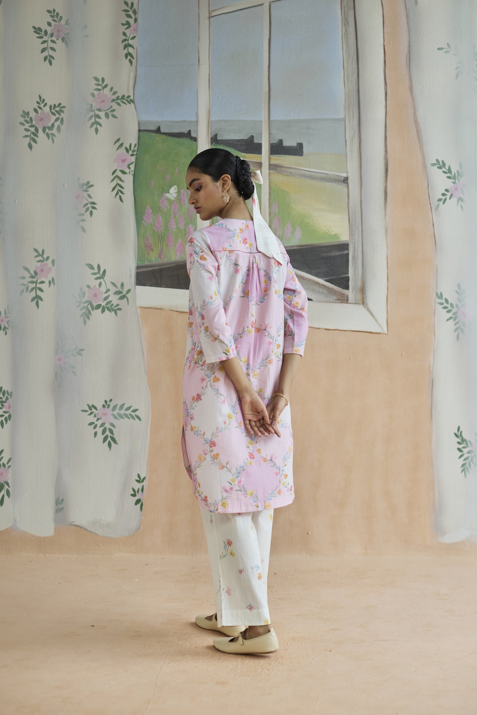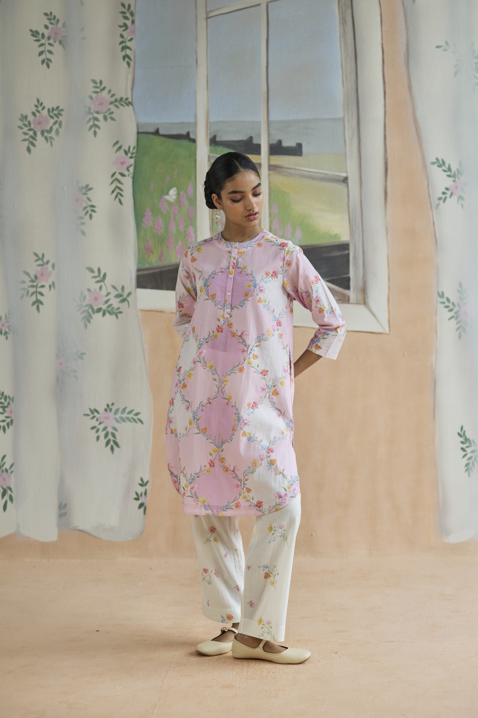 Evoking the poetry of architecture, this set draws inspiration from the timeless trellis, a motif where structure meets romance. The lattice-like geometry forms a delicate framework, allowing florals to unfurl with effortless grace, making it both timeless and strikingly modern. A relaxed fit and crafted from 100% cotton, the fabric lends grace and form to the silhouette. Meticulous hand-finishing adds a touch of individuality. Pockets for convenience.
