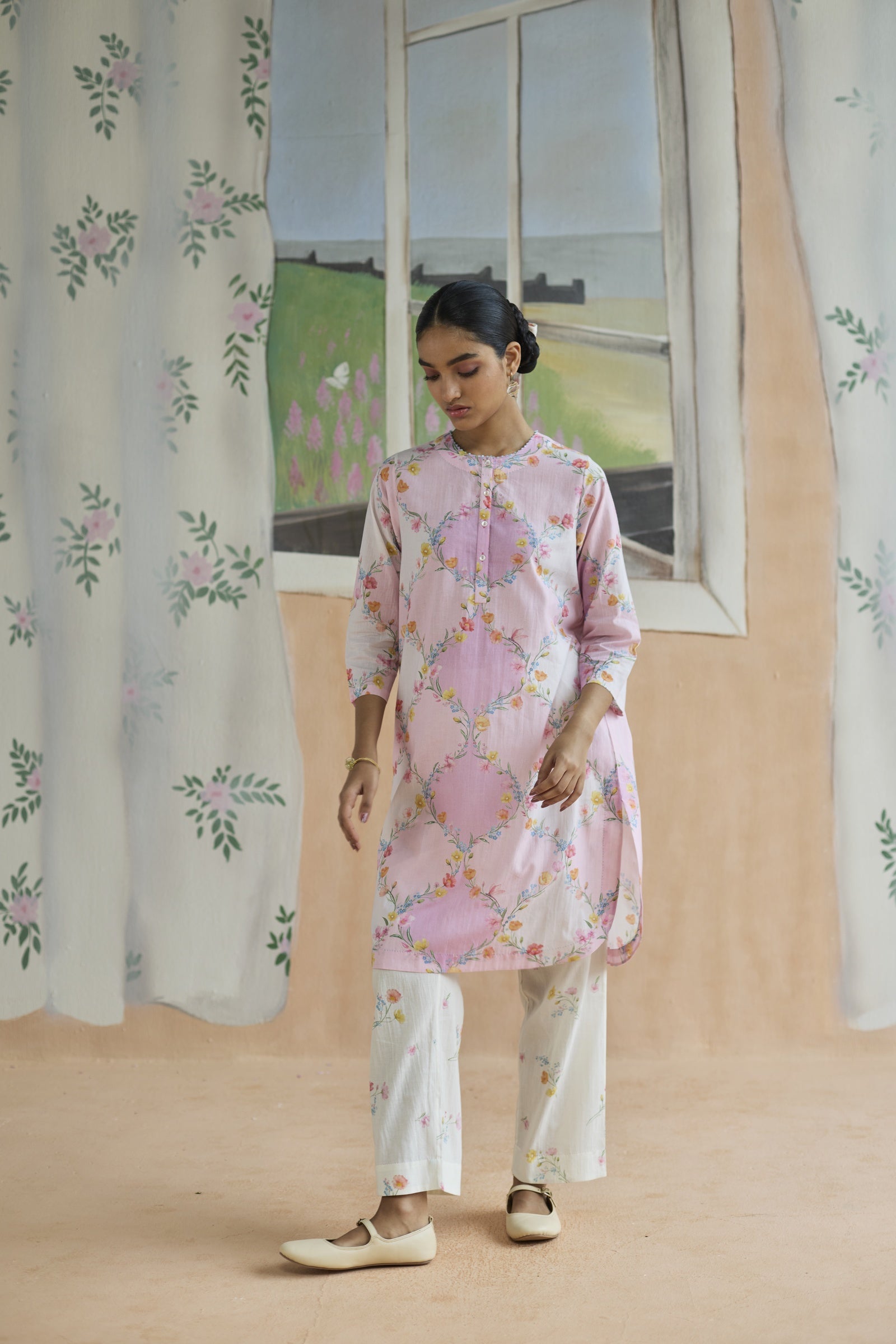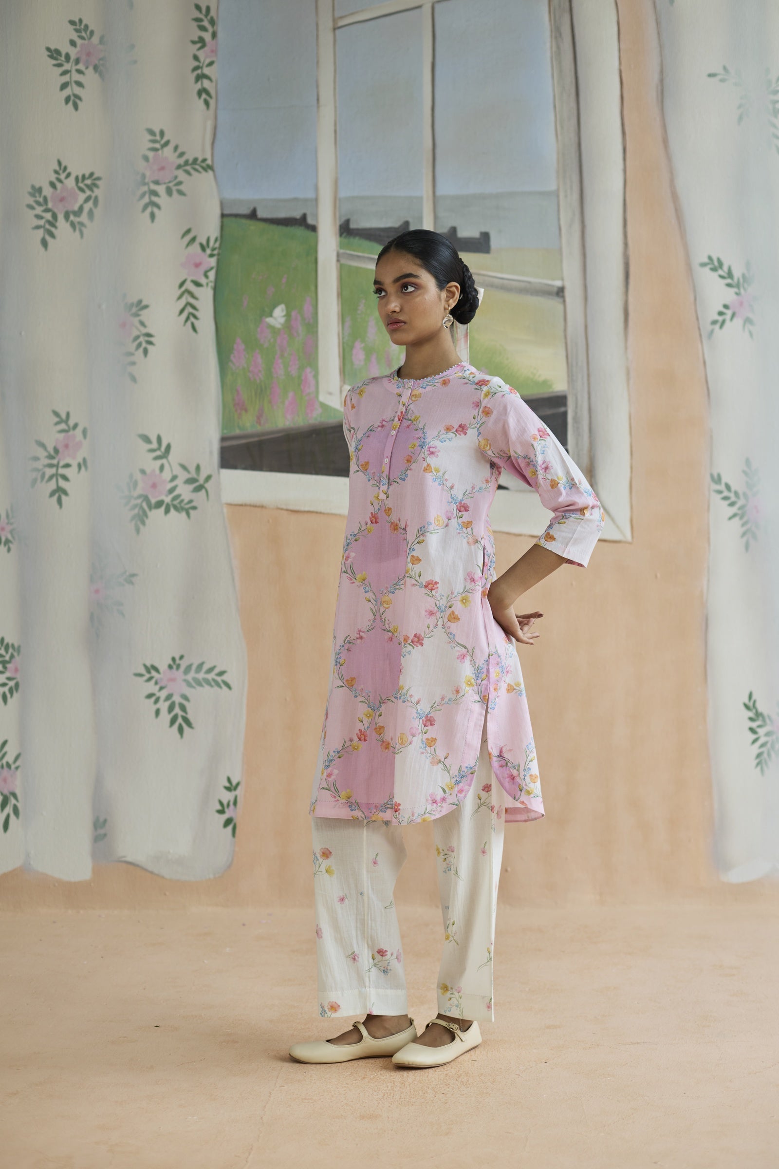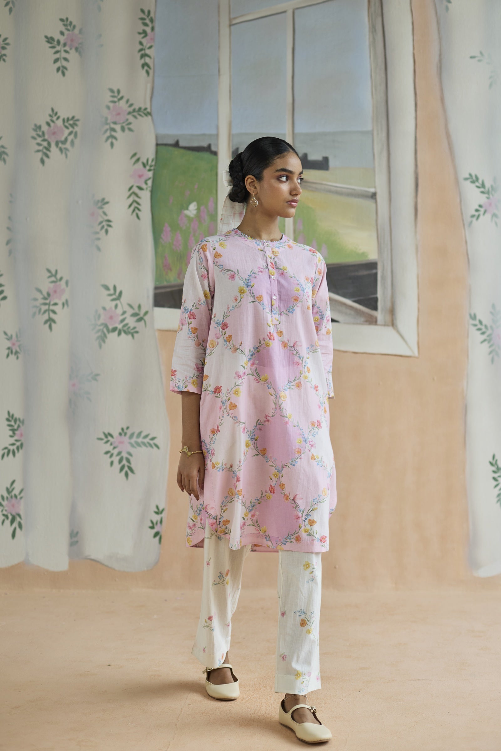 Evoking the poetry of architecture, this set draws inspiration from the timeless trellis, a motif where structure meets romance. The lattice-like geometry forms a delicate framework, allowing florals to unfurl with effortless grace, making it both timeless and strikingly modern. A relaxed fit and crafted from 100% cotton, the fabric lends grace and form to the silhouette. Meticulous hand-finishing adds a touch of individuality. Pockets for convenience.