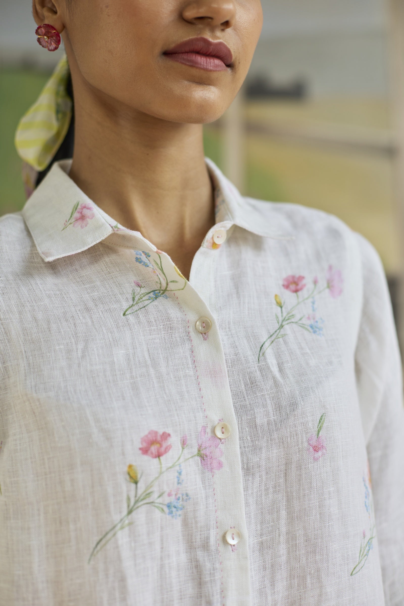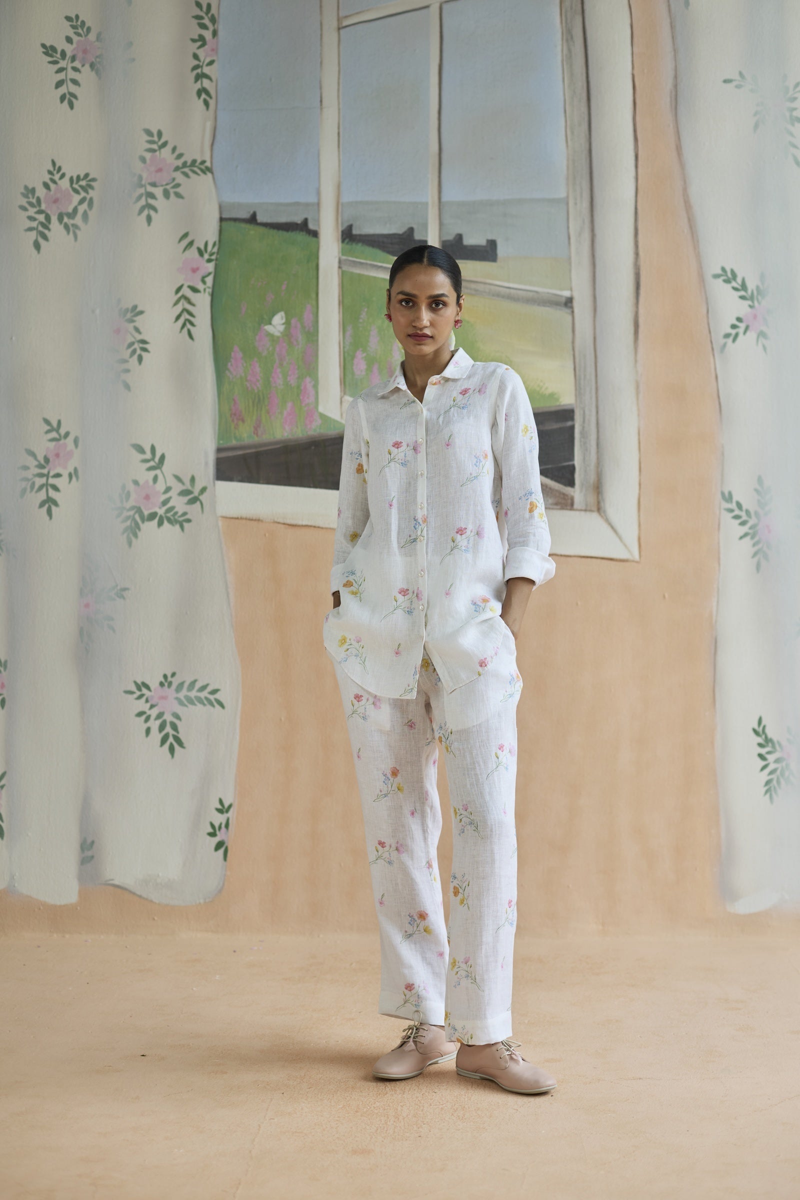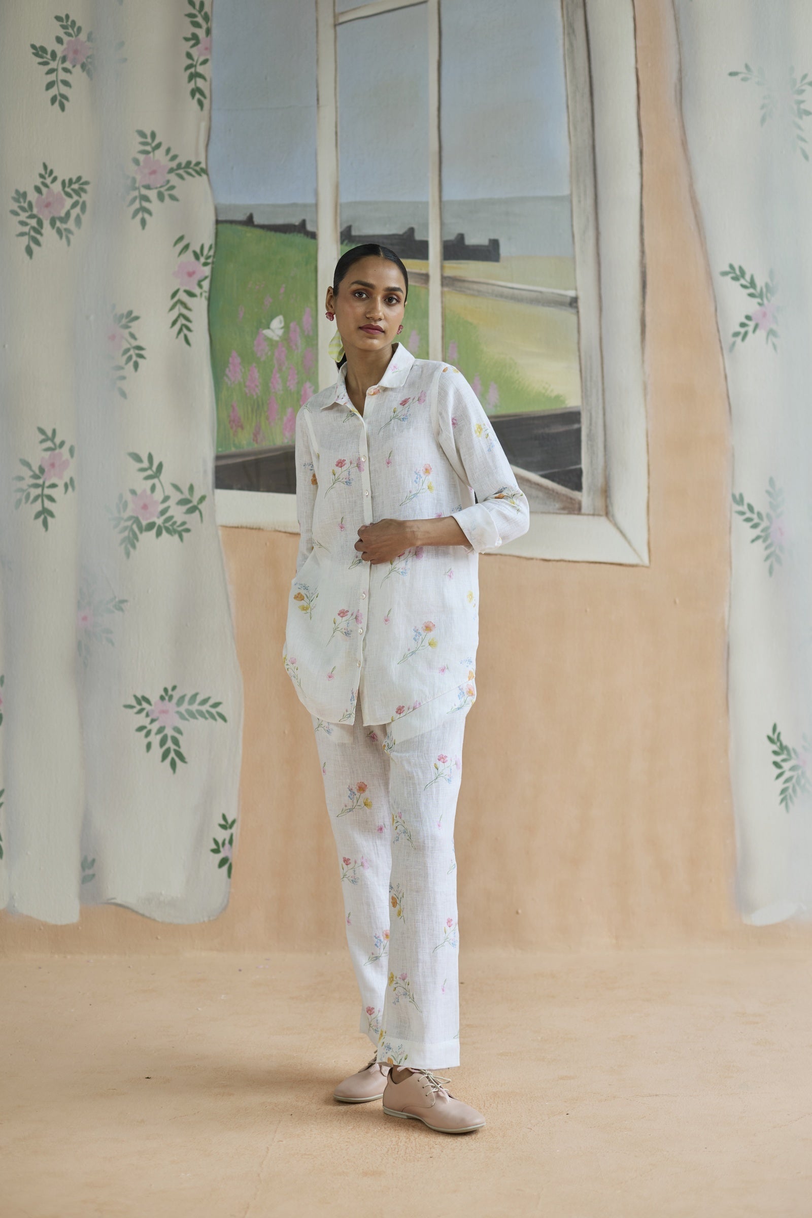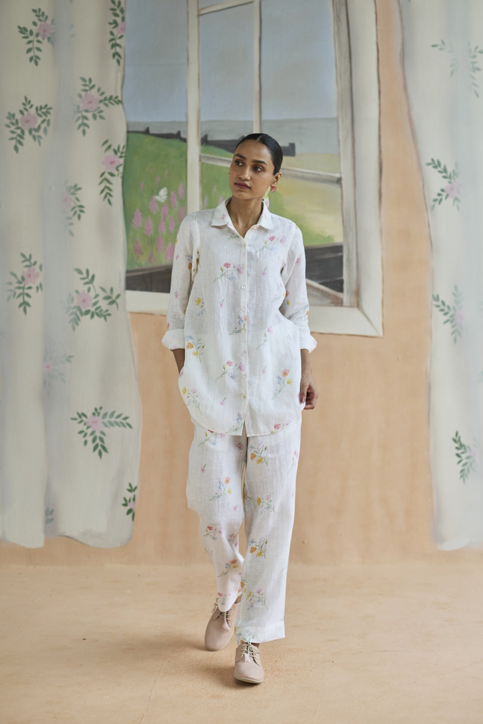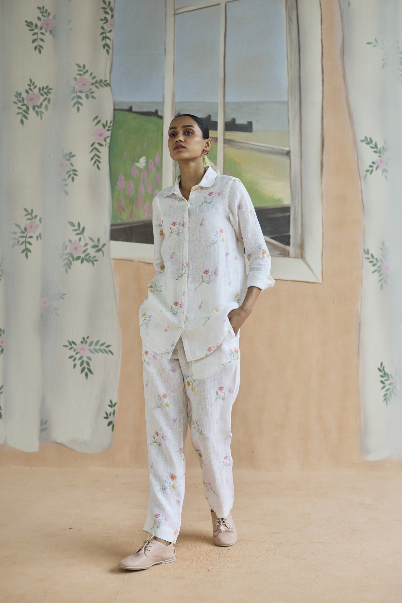 100% linen shirt-pant set embodies the elegance of ease, designed for those who value both comfort and effortless grace. Scattered floral motifs, placed with intention to feel almost spontaneous. A relaxed fit, the shirt drapes fluidly, while the tailored yet easy pant completes the set, creating a balance of structure and softness that feels modern yet timeless. Pockets add an essential convenience.