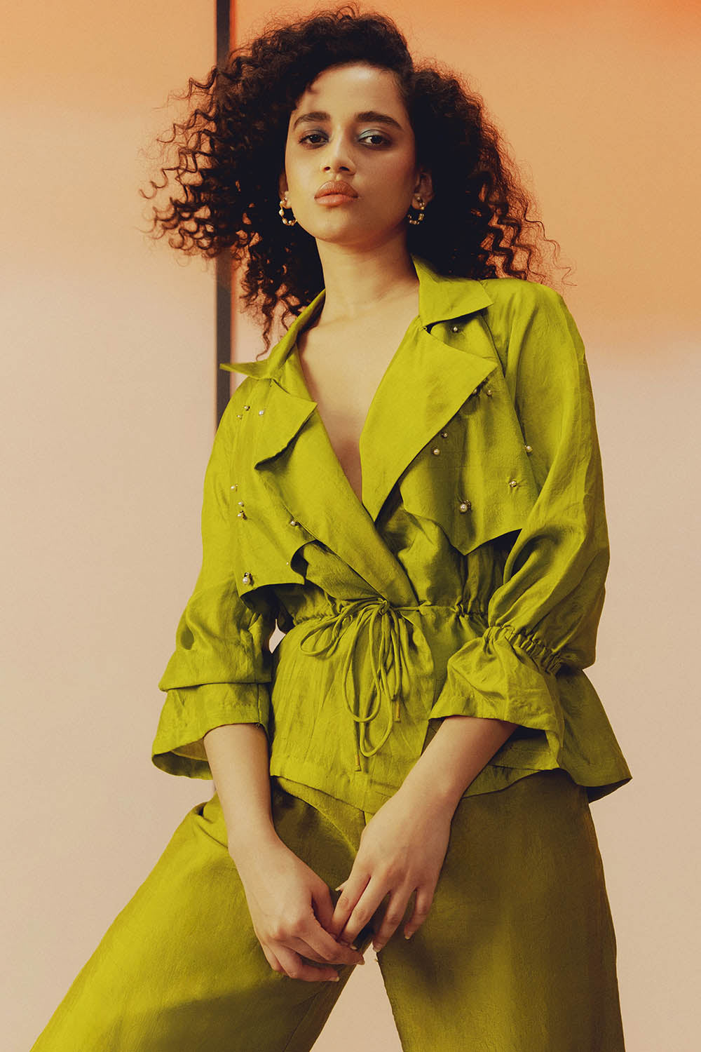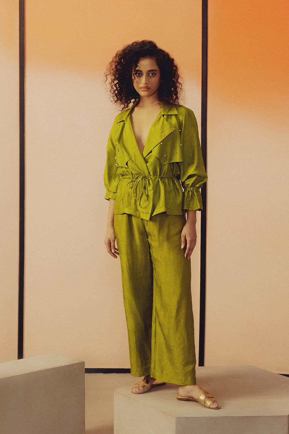 This handwoven mulberry silk tie up shirt features hand embroidered pearl and bead work. Designed with drawstring waist, elasticated cuff and a statement lapel collar. It pairs effortlessly with high waisted pants featuring an elasticated wasitband.