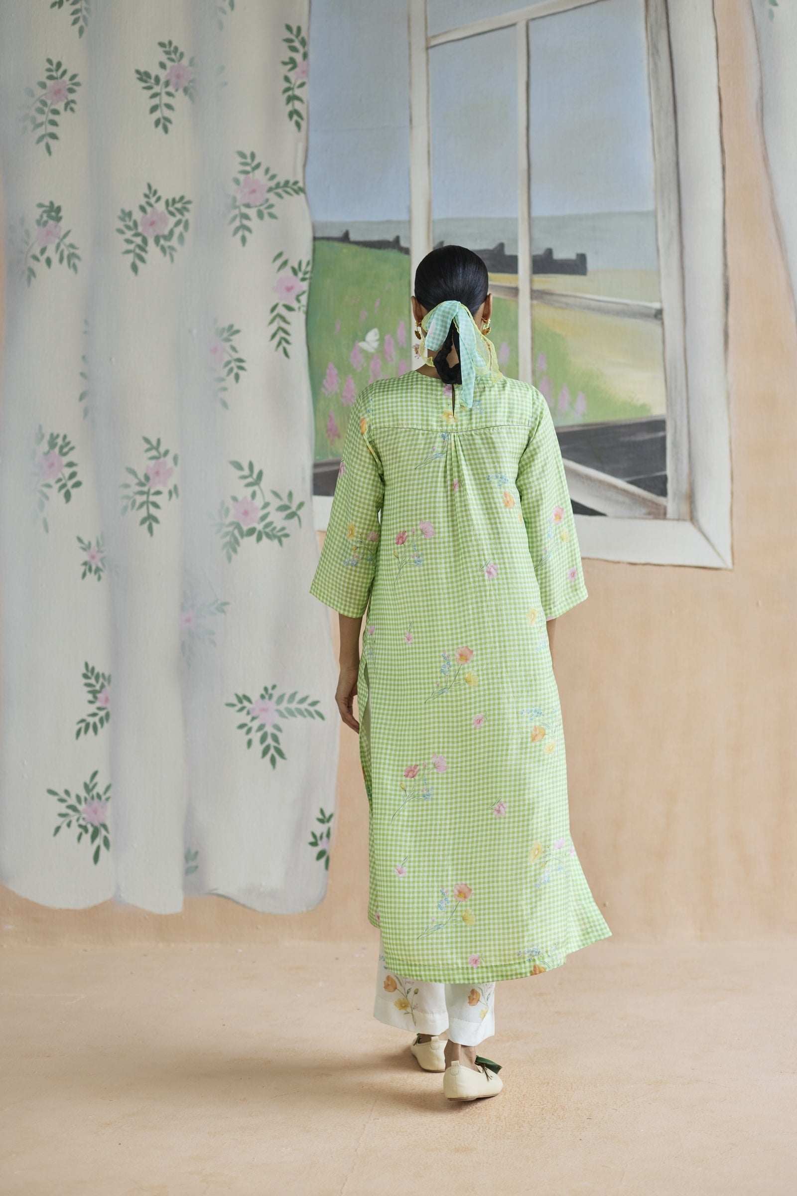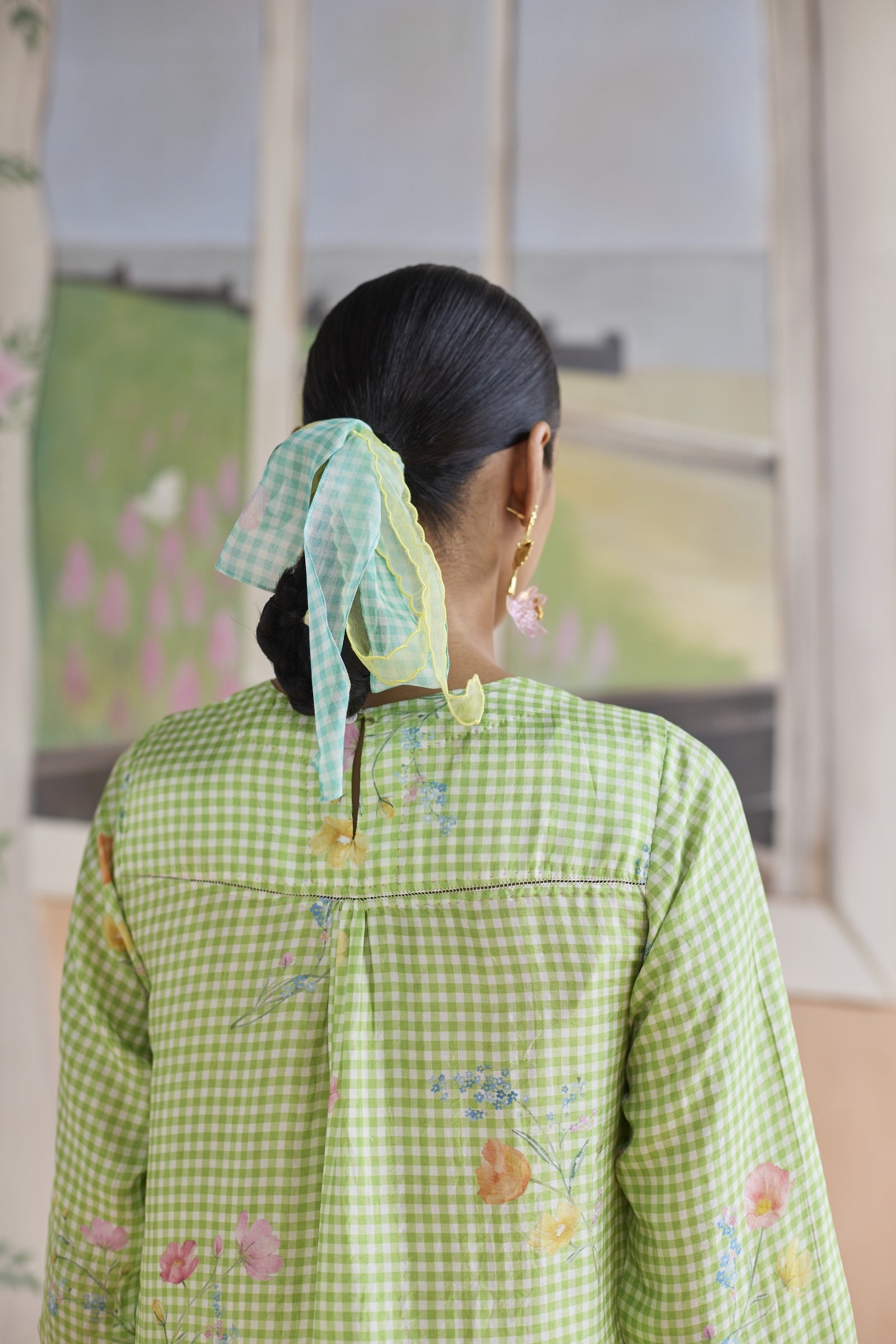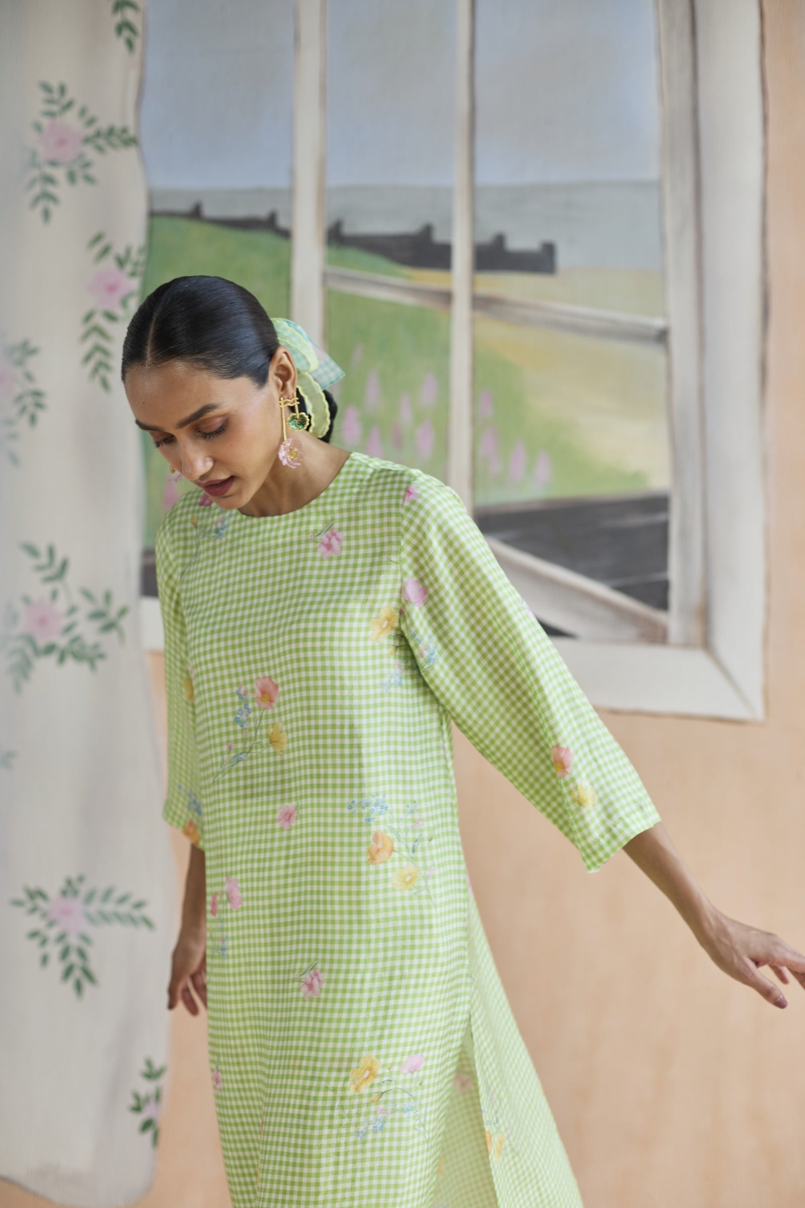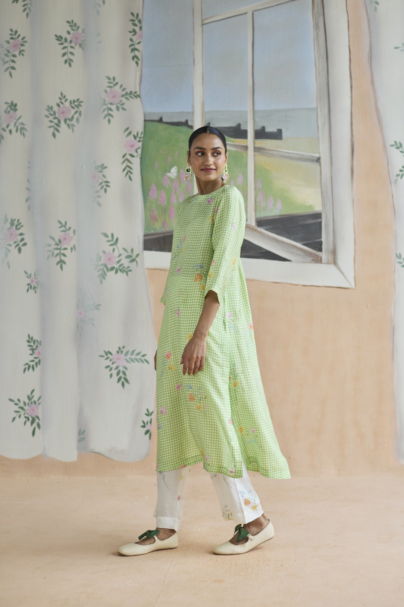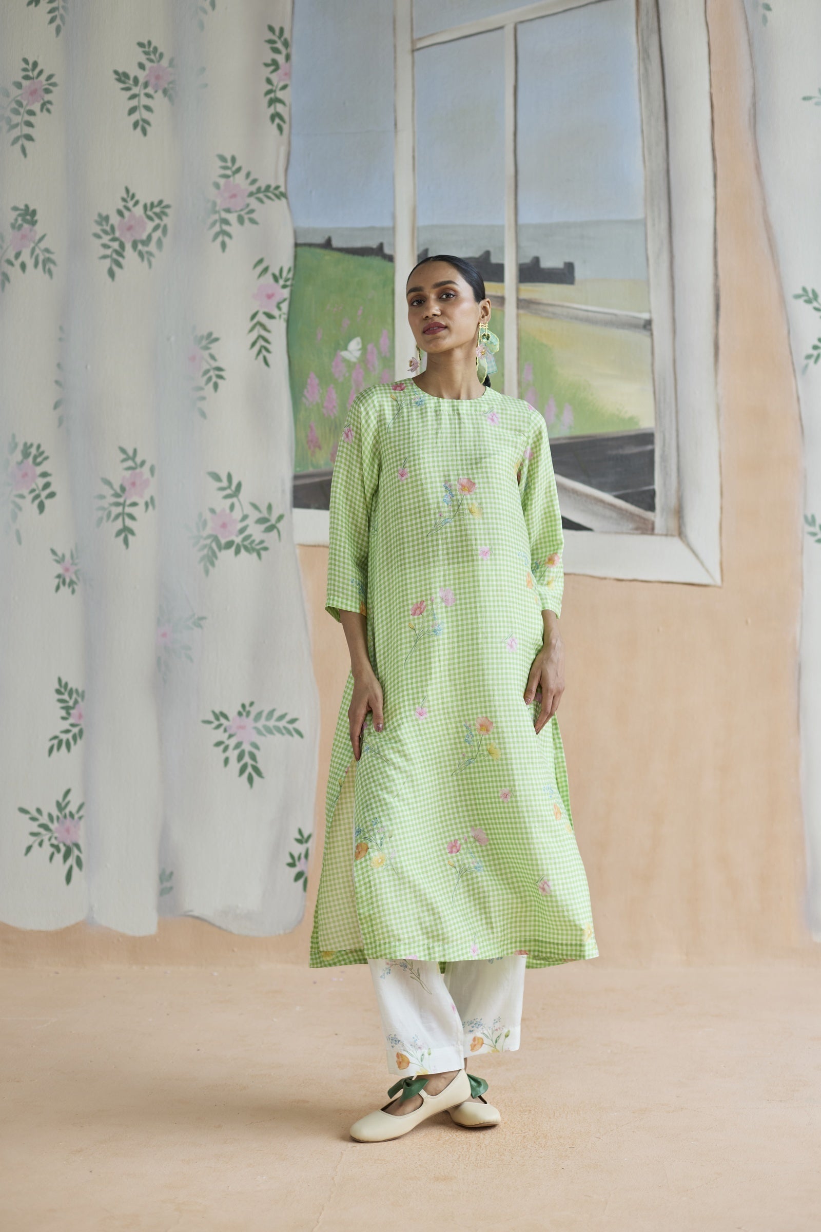 Green Checks and mallow flower long kurta set in handwoven mulberry silk alludes to a romance of checks with mallow flowers from Kashmir Valley. A reimagined classic checks with a poetic twist. Gathered blooms appear almost alive in contrast to the grid of checks. A relaxed fit, it offers ease and comfort while maintaining elegance. The kurta drapes fluidly, complemented by coordinating trousers that complete the look with grace.