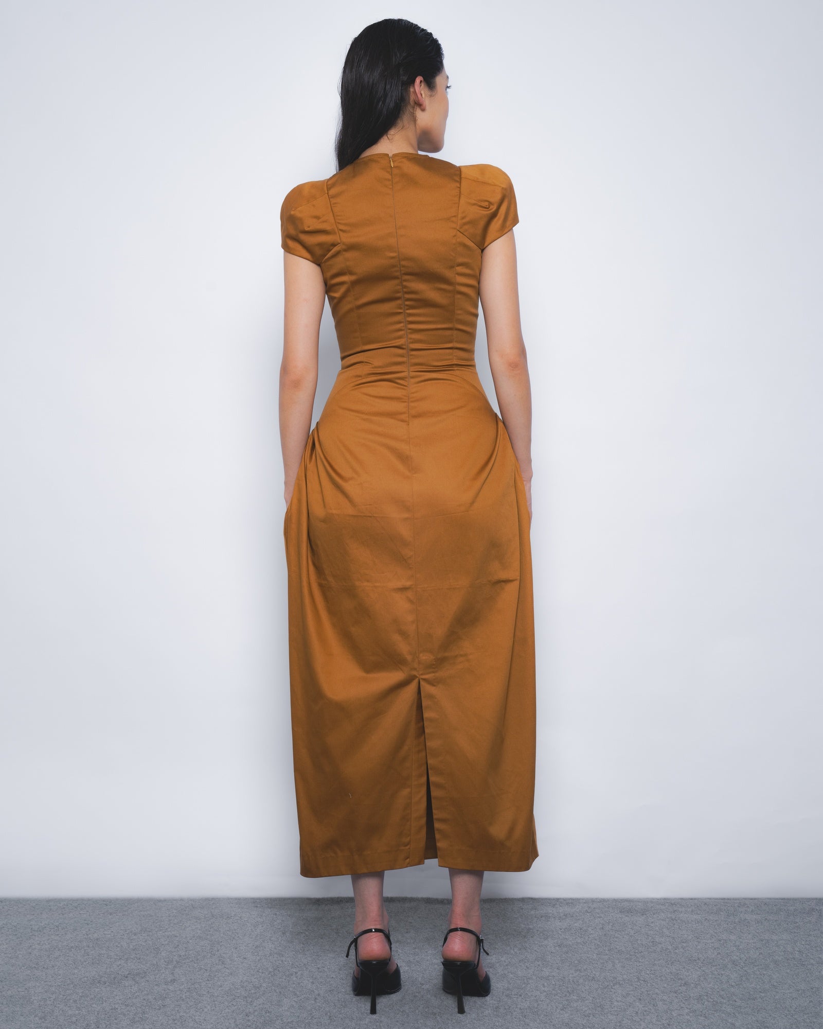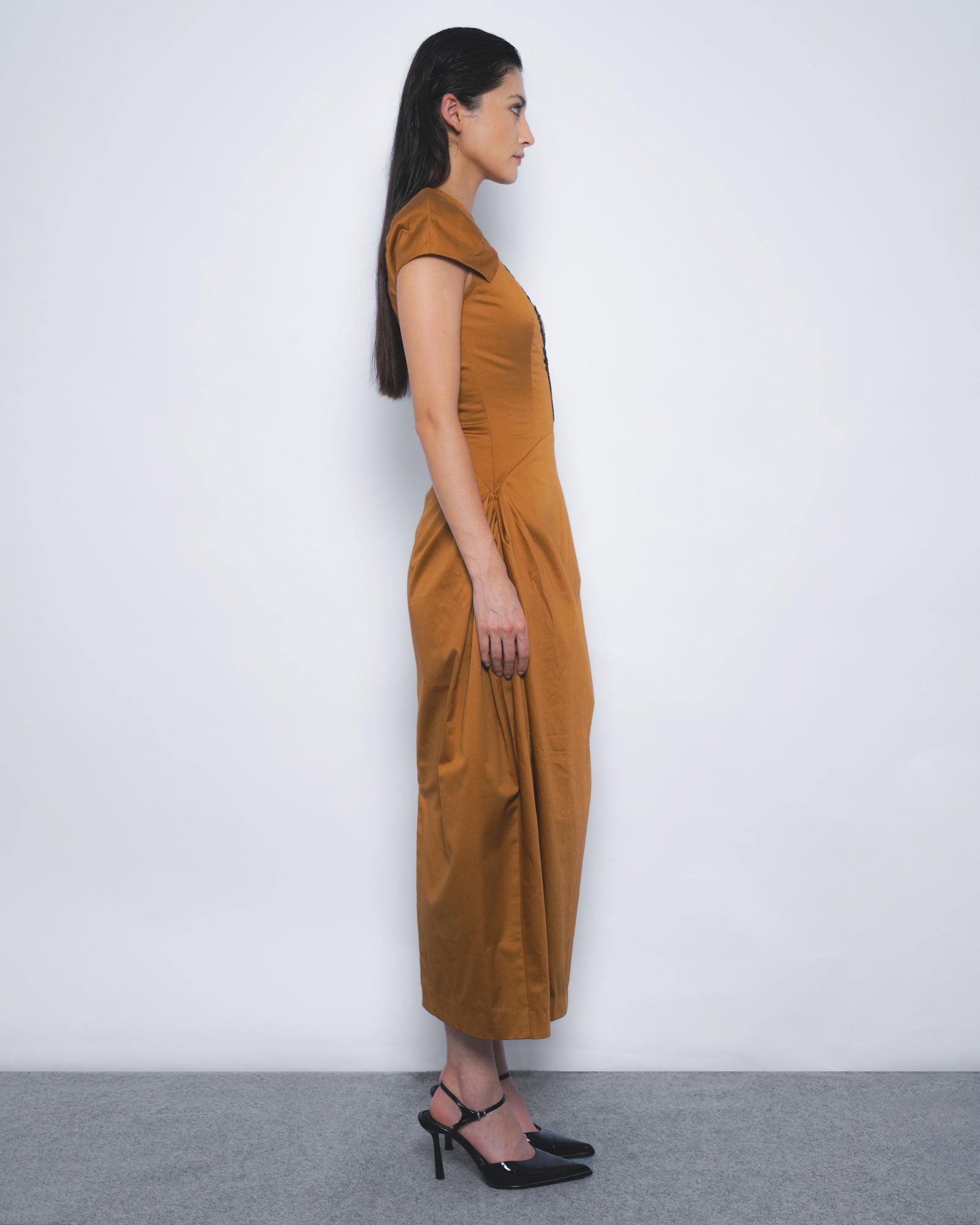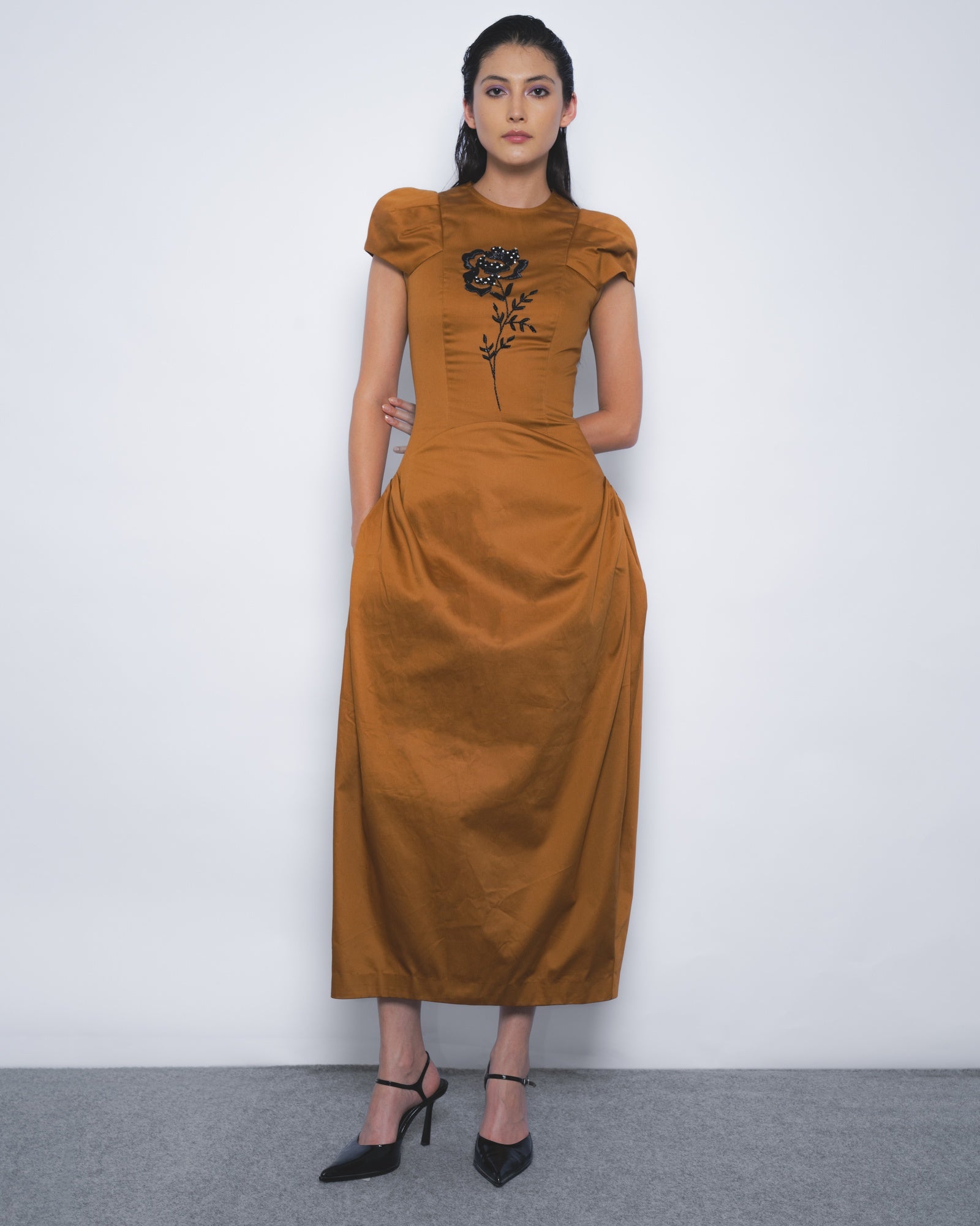 An architectural silhouette, a structured bodice sculpting the torso with a hand embroidered 'rose' with fine silver French bulion wires, finished with a capped sleeve with dart details defining the shouders. The lower half of the dress is cut in tafetta with pleats tucked at the sides creating an overall structured yet fluid garment silhouette.