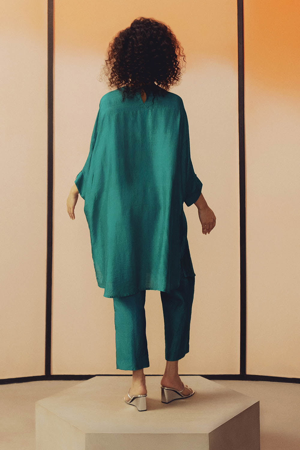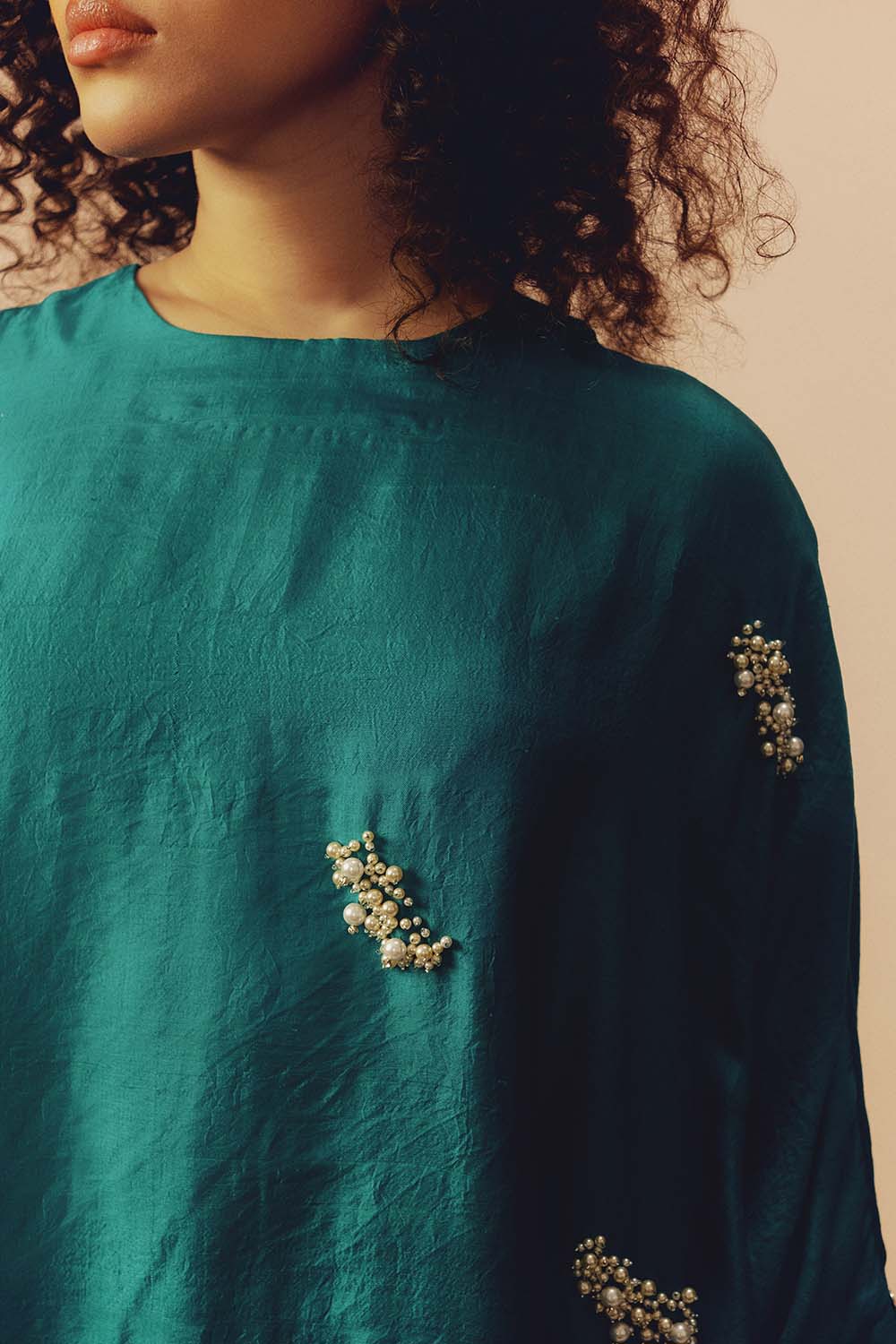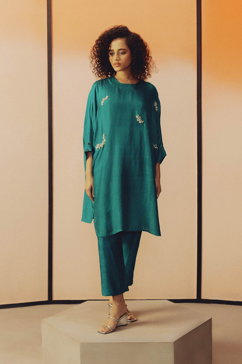 This handwoven mulberry silk tunic set features hand embroidered pearl detailing on the tunic. Designed in classic relaxed fit silhouette with a free size tunic, it is paired with narrow, ankle length pants featuring an elastic waistband and pockets on both the sides.