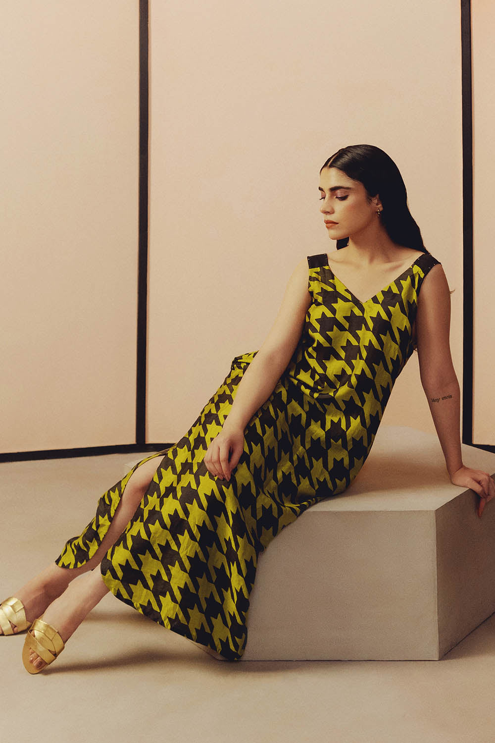 This handwoven mulberry silk slip dress features a handblock print and subtle glass beadwork on the shoulder straps. Designed in classic easy fit, straight cut silhouette with pockets on both the sides.
