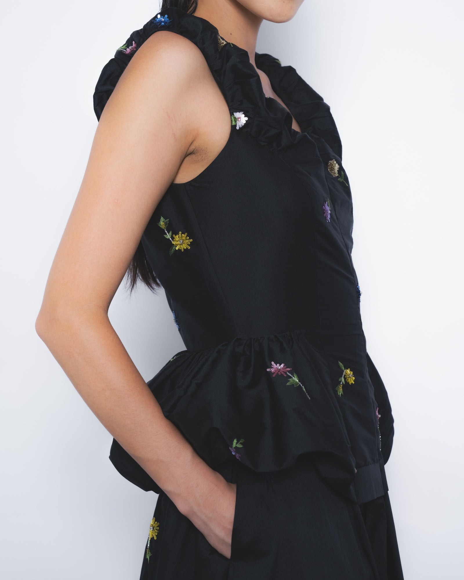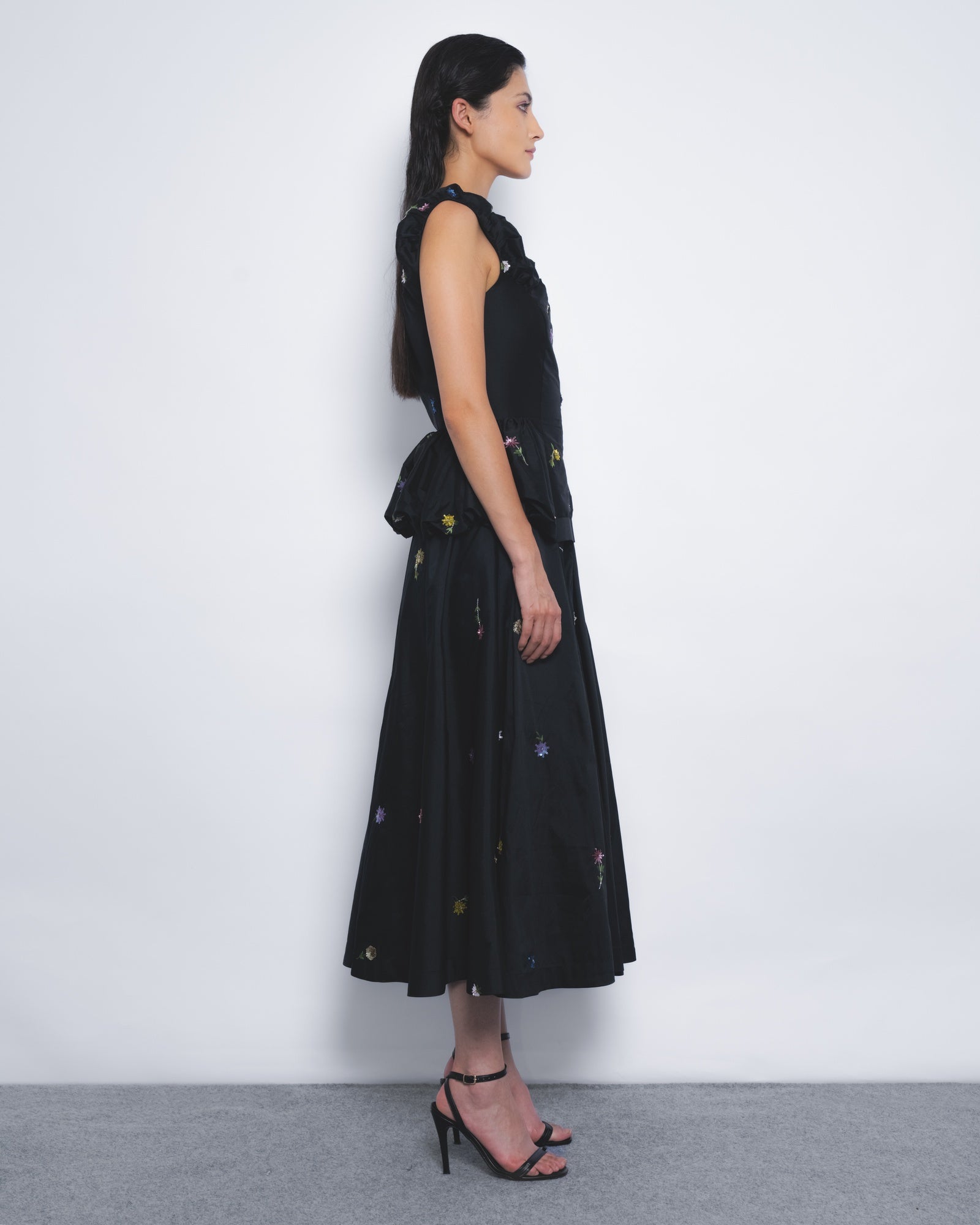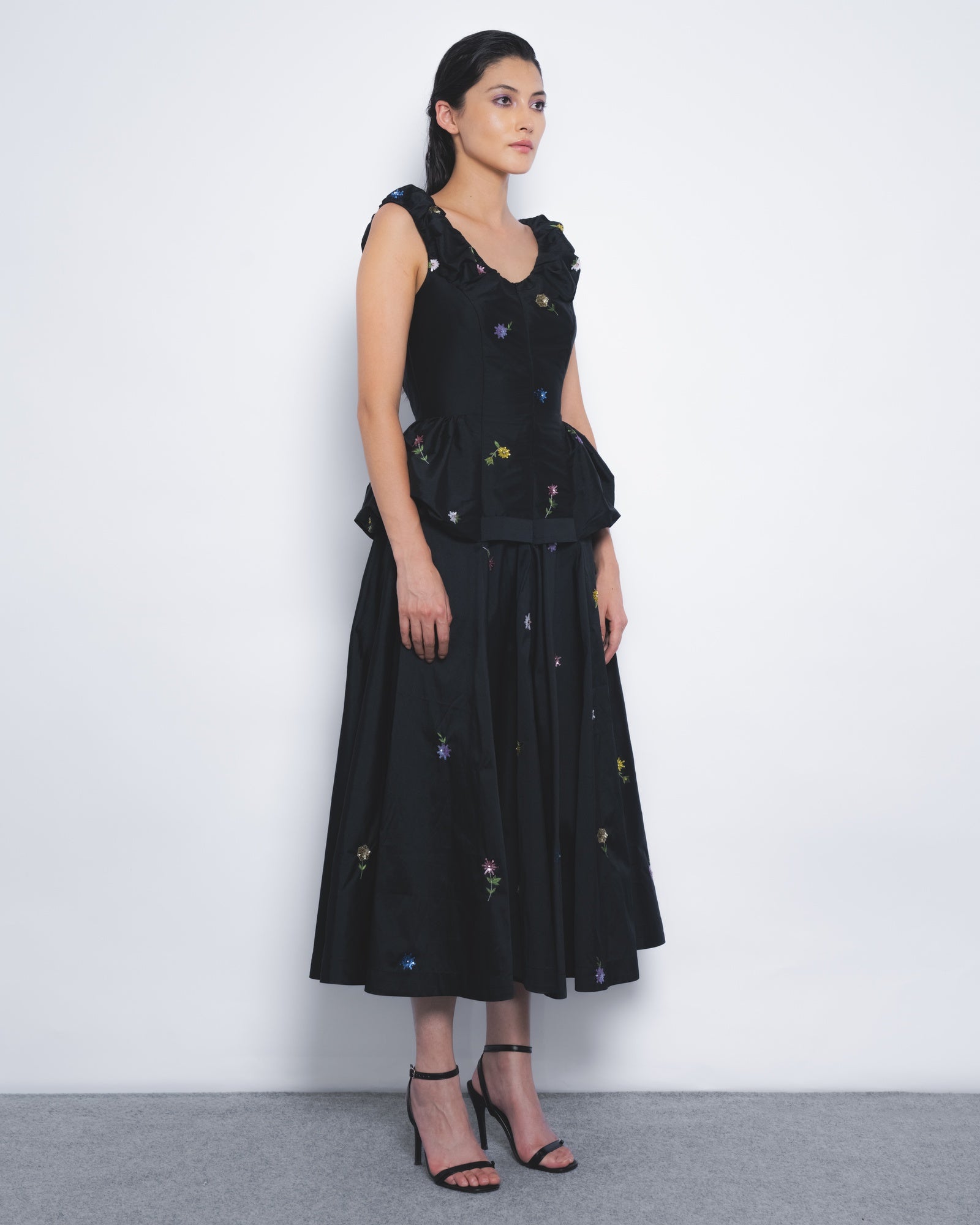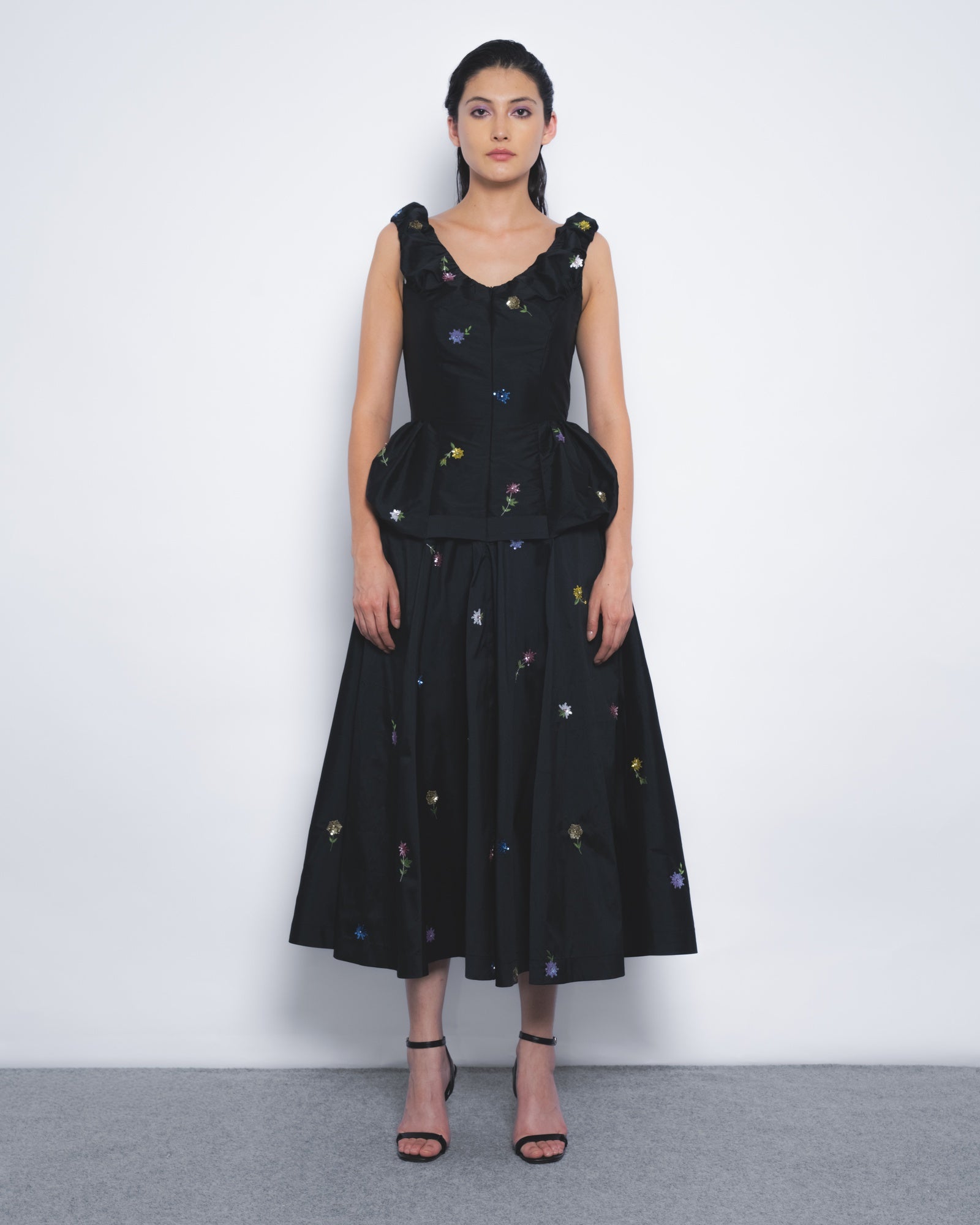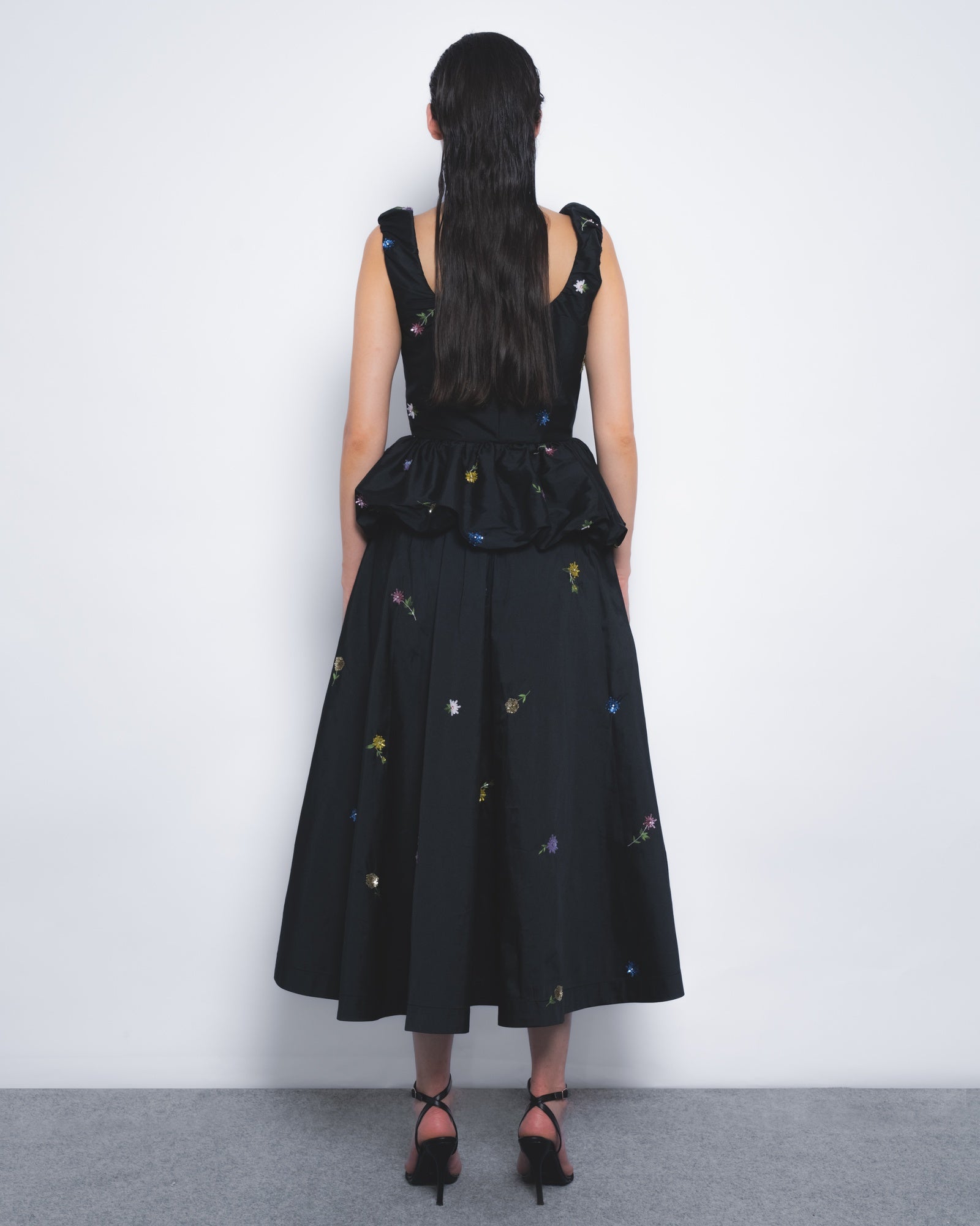 Delicately hand-embellished floral motifs in sequins define this elegantly playful evening silhouette. Fabric manipulation at the bodice creates puffed detailing at the top, while panelled tailoring contours the torso, flowing into a voluminous skirt for a refined yet dynamic presence.