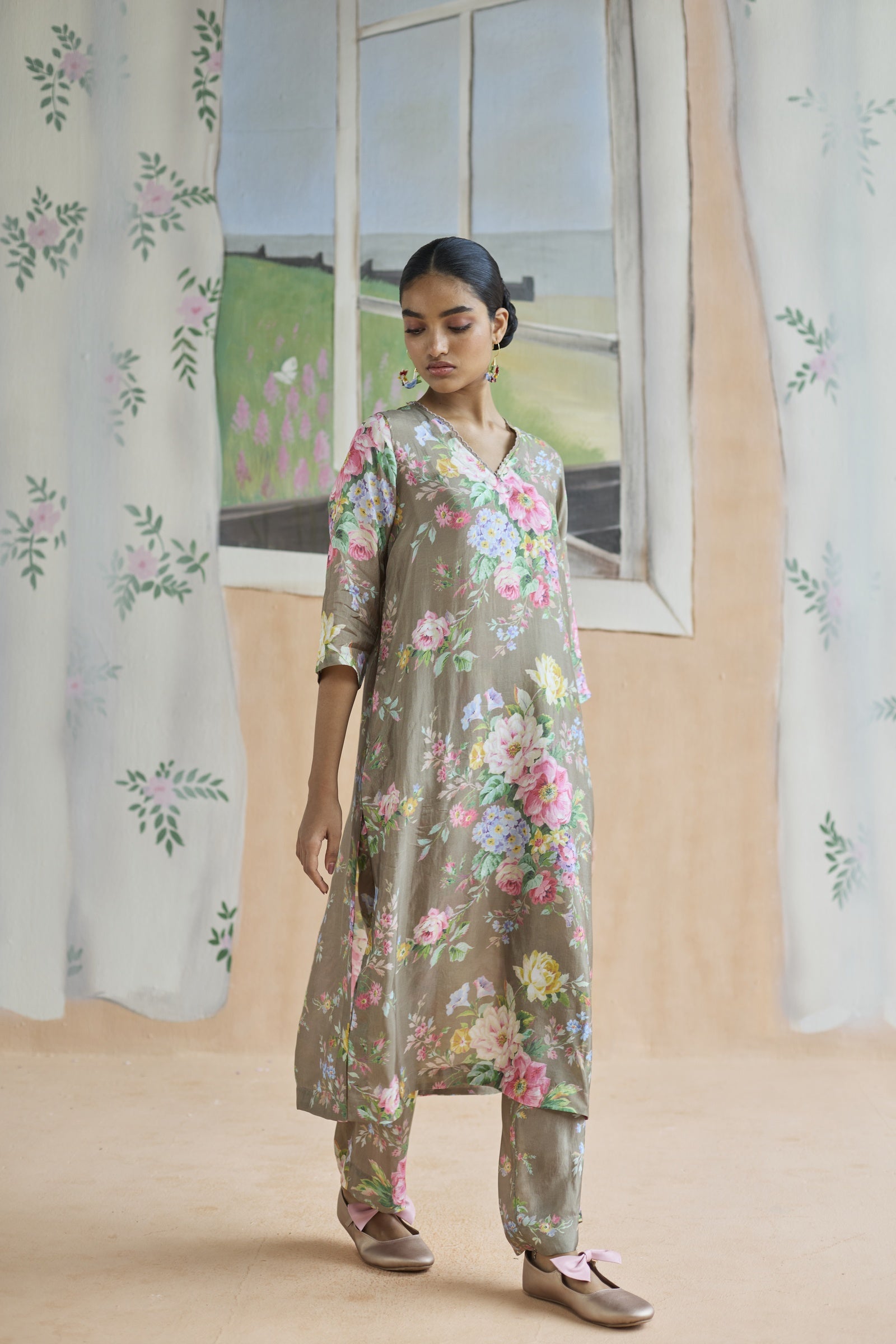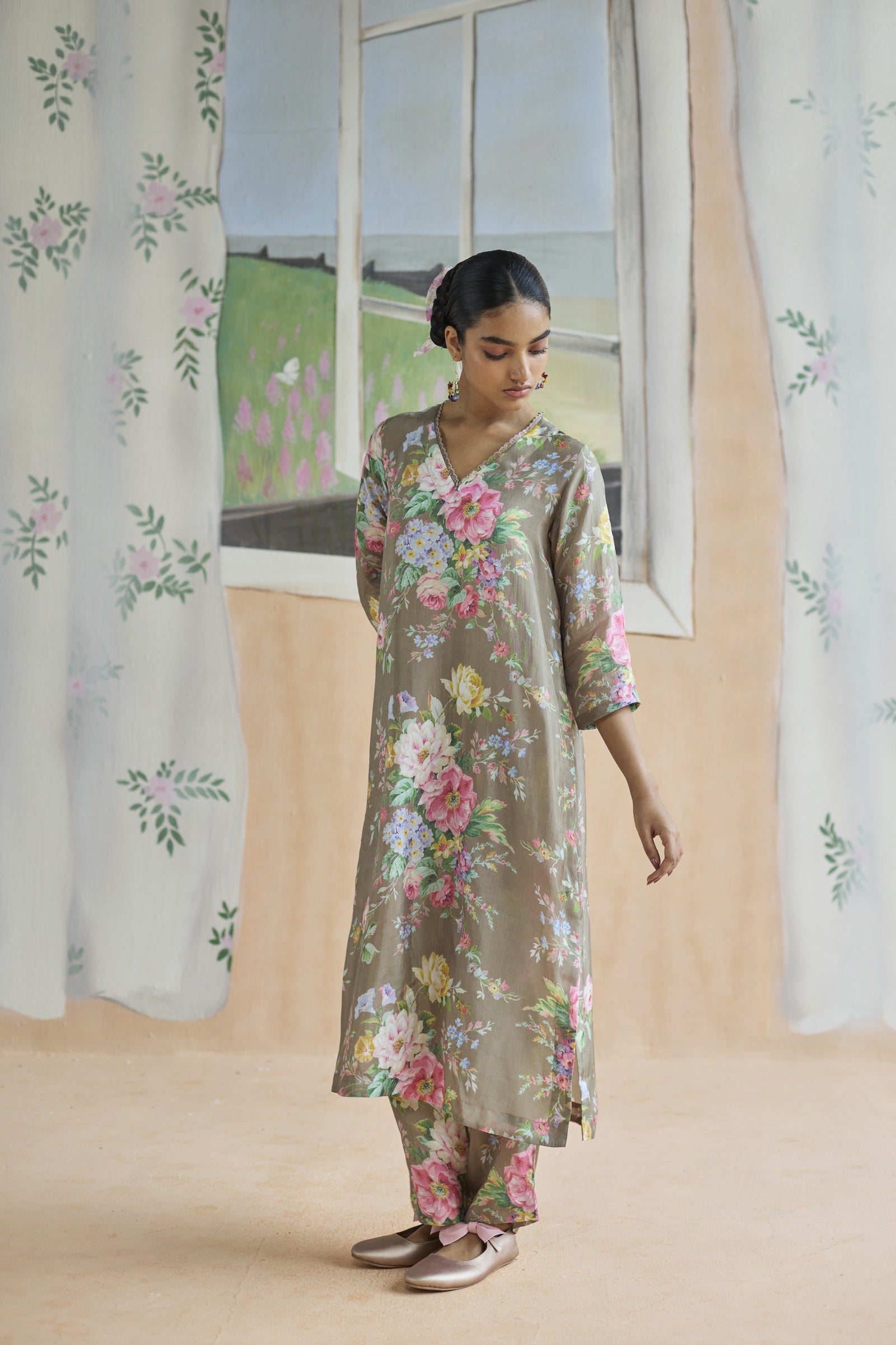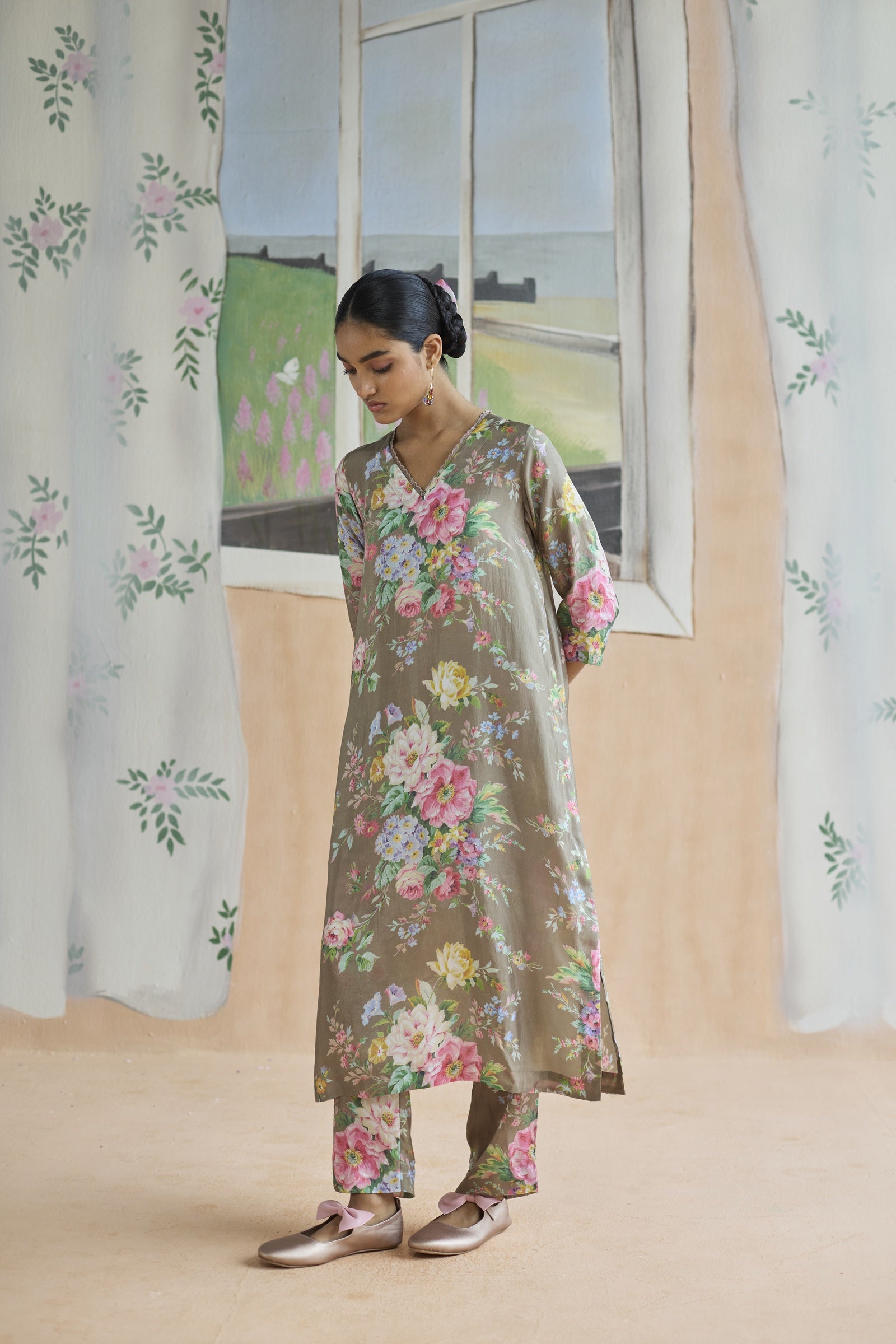 The Roses on an Earthy Brown Base Long Kurta Set in bamboo silk makes a bold statement, allowing the romantic rose print to come alive with richness and depth. The roses command presence, lending the ensemble an artful grandeur while maintaining quiet sophistication. The silhouette features a relaxed fit that flows effortlessly, ensuring comfort without compromise. Its ease of movement, paired with tailored refinement, allows the outfit to transition seamlessly from day to evening. The model is 5 feet 7 inches tall and is wearing a size Small. Kurta length is 42 inches, and pant length is 36 inches.