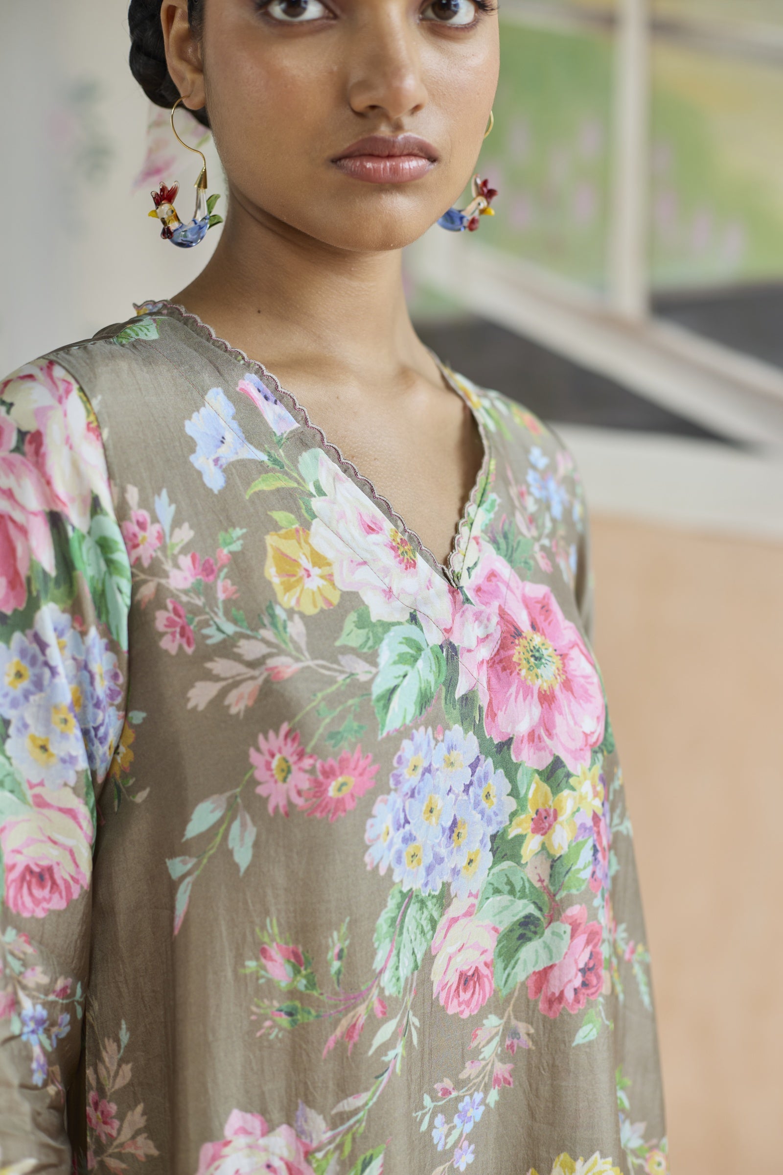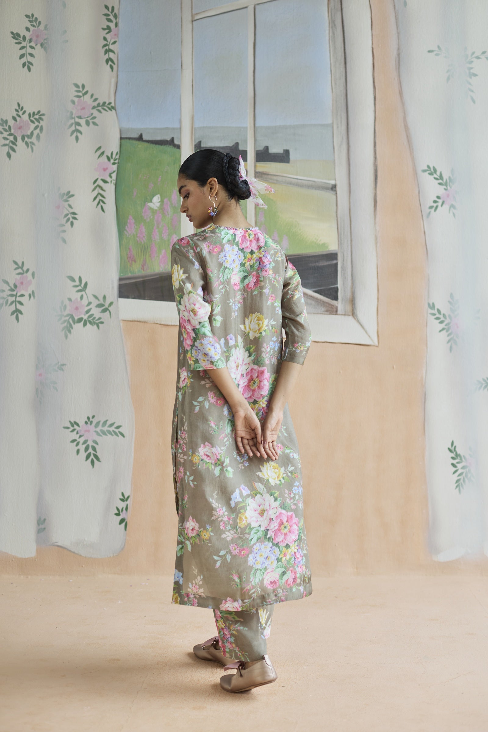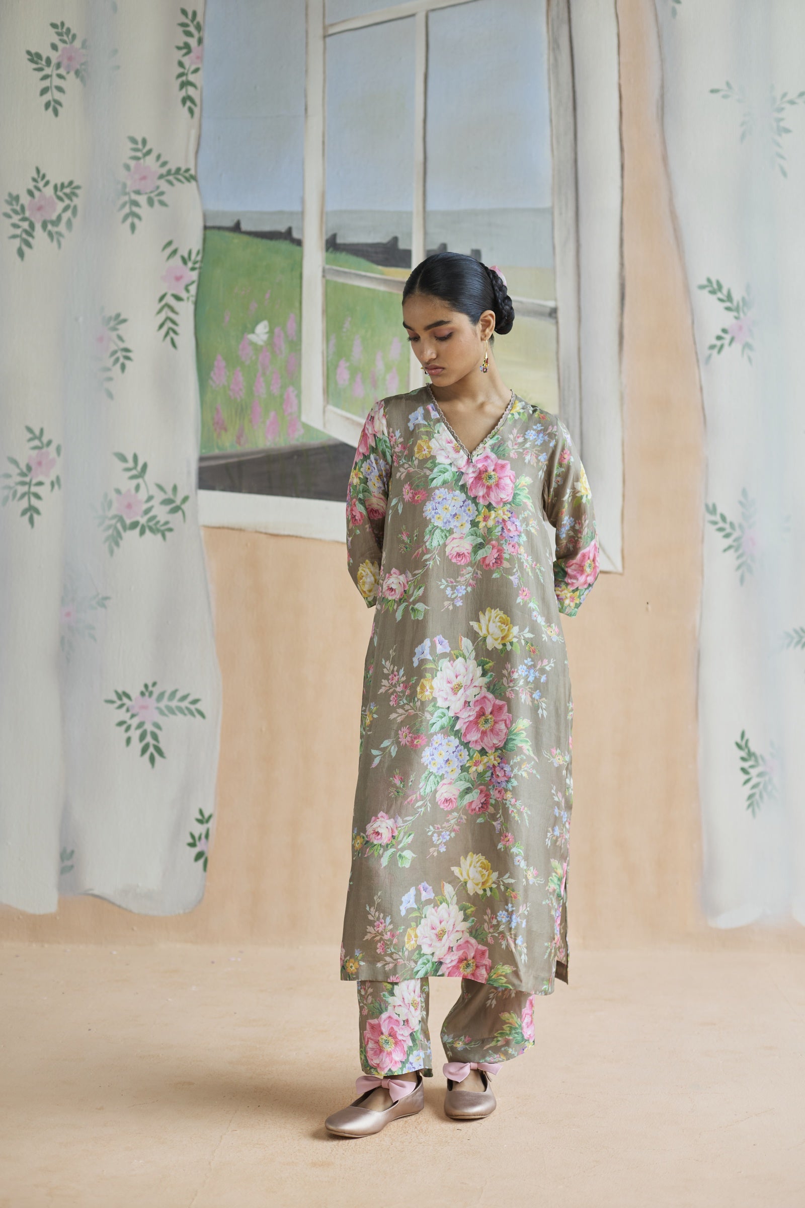 The Roses on an Earthy Brown Base Long Kurta Set in bamboo silk makes a bold statement, allowing the romantic rose print to come alive with richness and depth. The roses command presence, lending the ensemble an artful grandeur while maintaining quiet sophistication. The silhouette features a relaxed fit that flows effortlessly, ensuring comfort without compromise. Its ease of movement, paired with tailored refinement, allows the outfit to transition seamlessly from day to evening. The model is 5 feet 7 inches tall and is wearing a size Small. Kurta length is 42 inches, and pant length is 36 inches.