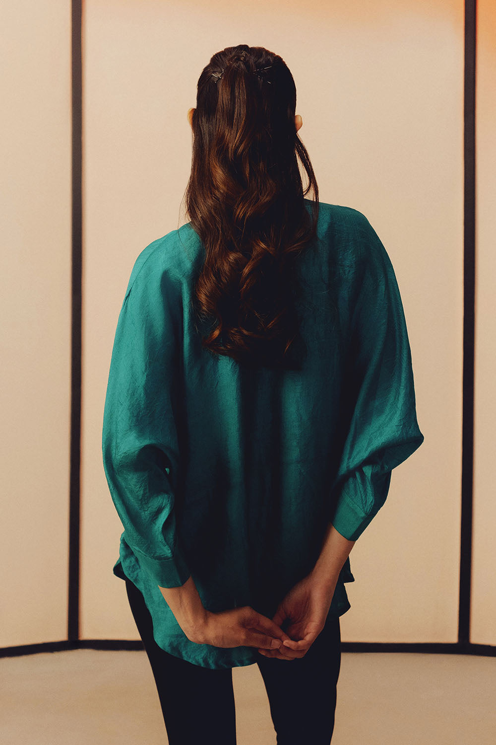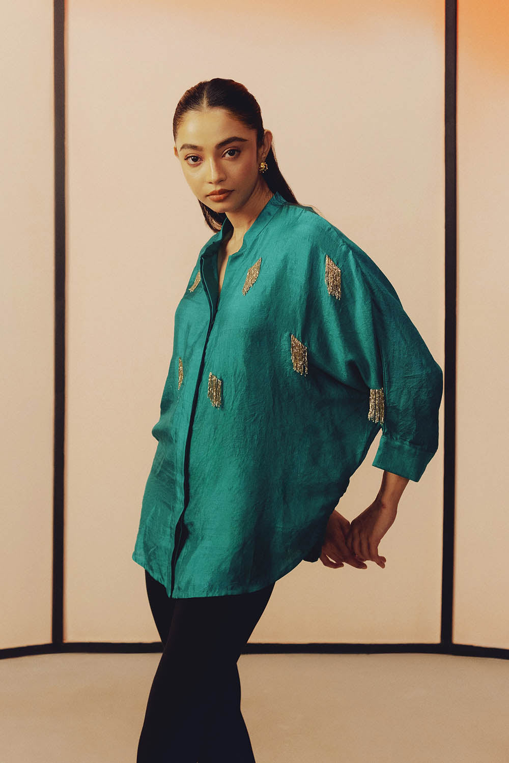 The handwoven mulberry silk dress features intricate mettalic glass bead embroidery, designed in classic batwing fit silhouette.