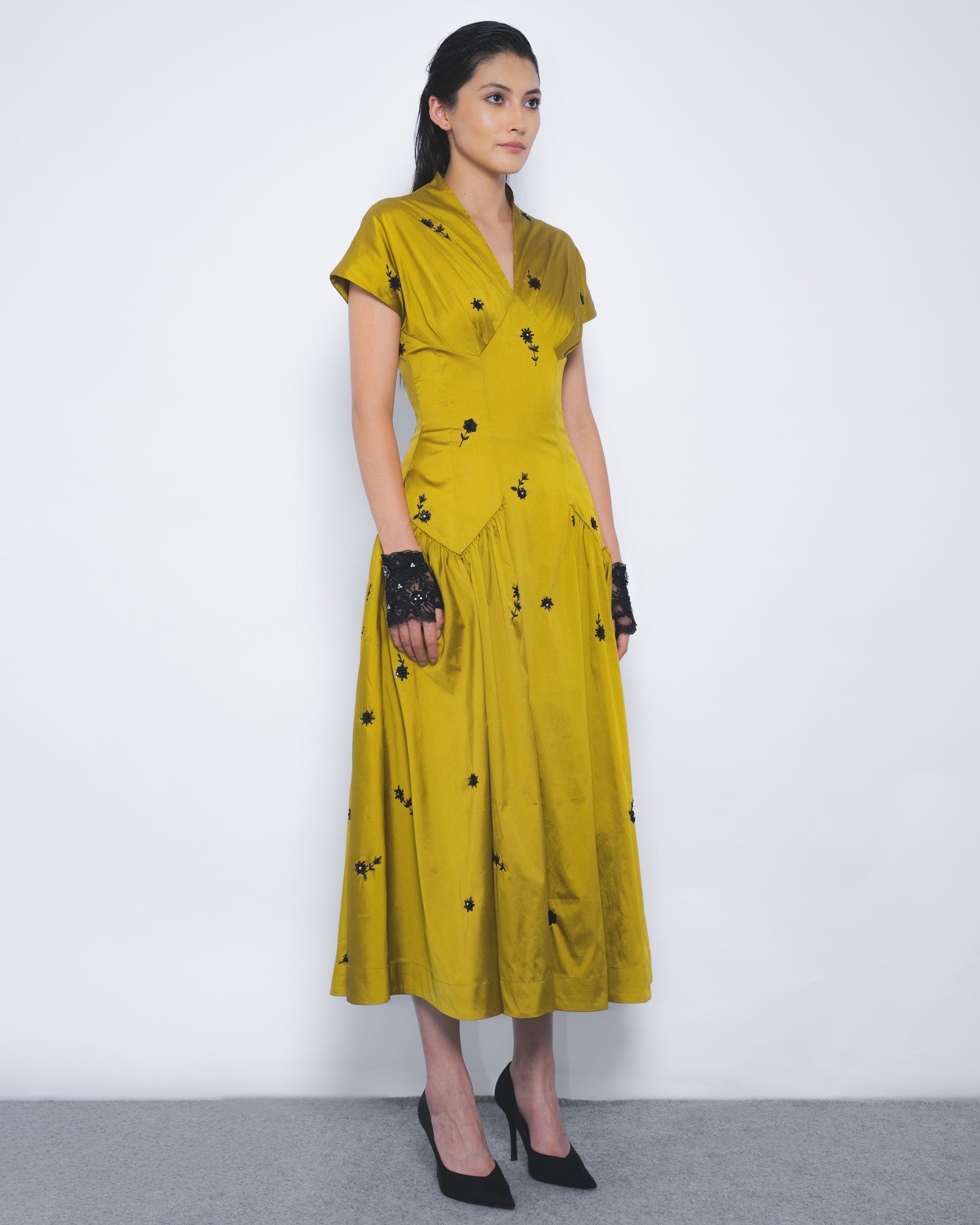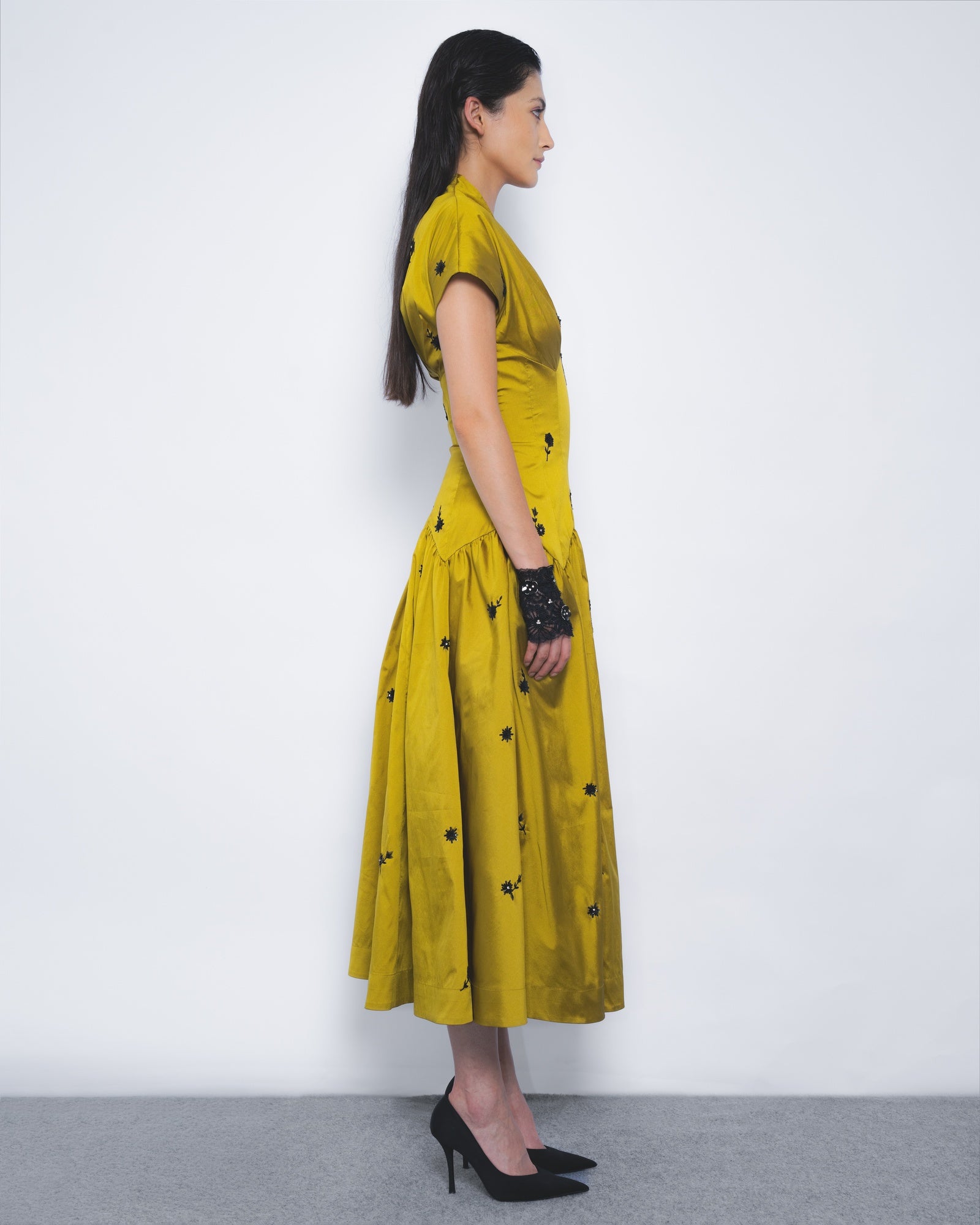 Delicate floral motifs, embroidered with beads and sequins on taffeta, create a richly visual and tactile surface. Designed in a fit-and-flare calf-length cut, the garment offers a modern interpretation of a classic evening silhouette.
