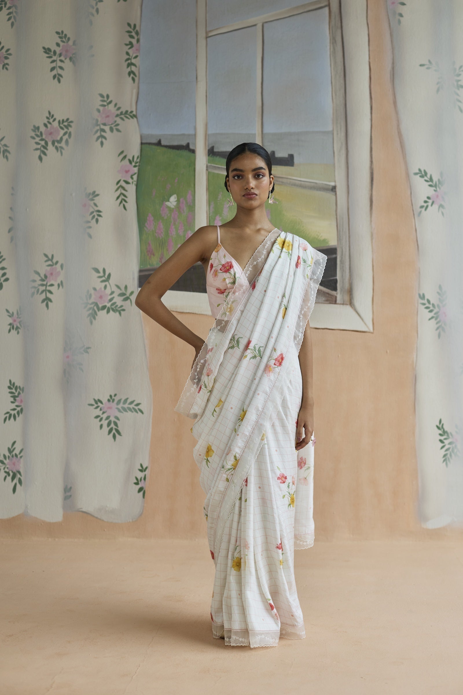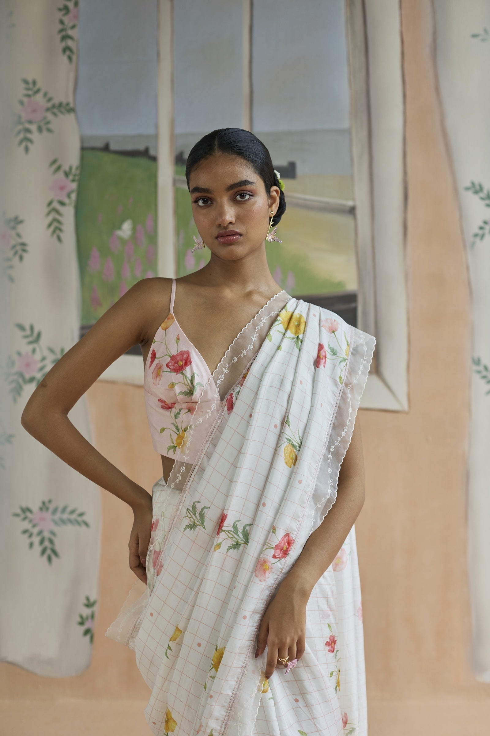 Off-white checks in handwoven mulberry silk captures the essence of understated elegance, offering timeless versatility. The poppy lend a graceful scattering of blooms that bring a gentle rhythm to the fabric, offering a unique identity that is both romantic and refined. Thoughtfully designed and intricately finished embroidered, scalloped edge introduce texture, movement, and definition—elevating the sari from simply beautiful to exceptionally crafted. The naturally lustrous silk drapes with effortless fluidity, making it the perfect union of tradition and modern detailing.