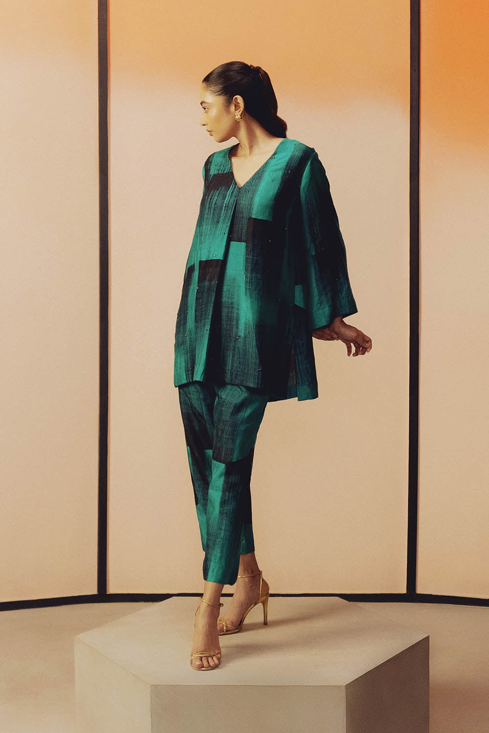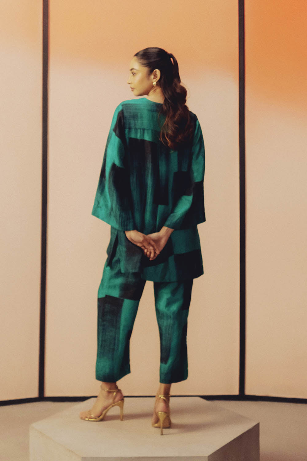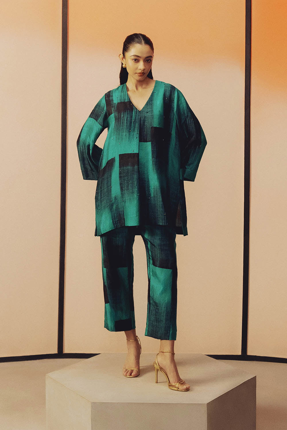 This handwoven mulberry silk V-neck short kurta set features a hand painted print accentuated with intricate glass beadwork detailing. Designed in classic A- line silhouette, it is paired with narrow, ankle length pants featuring pockets.