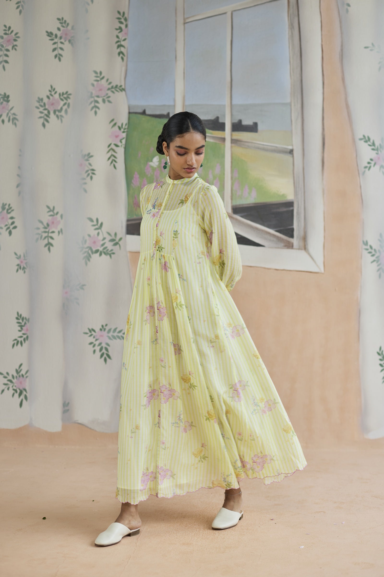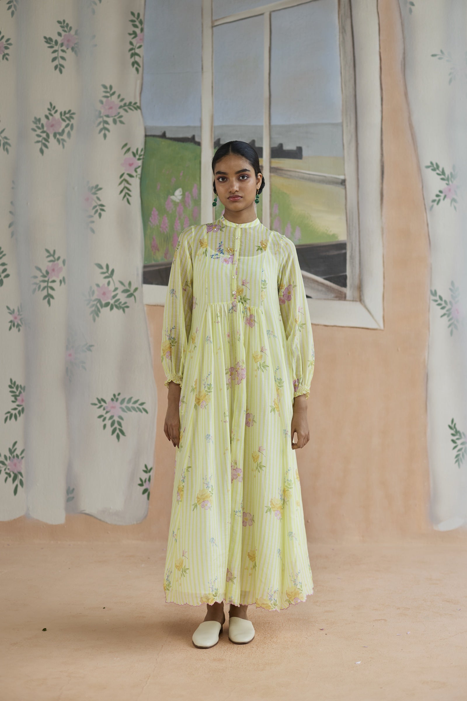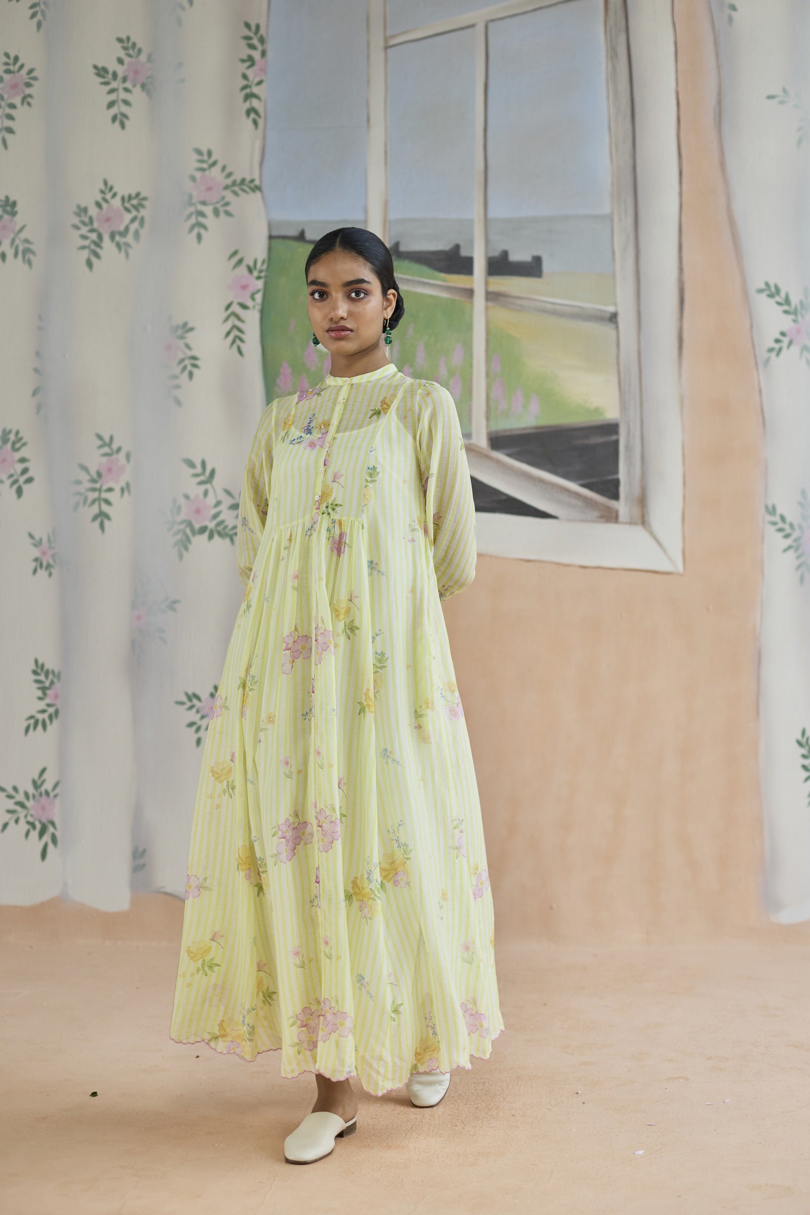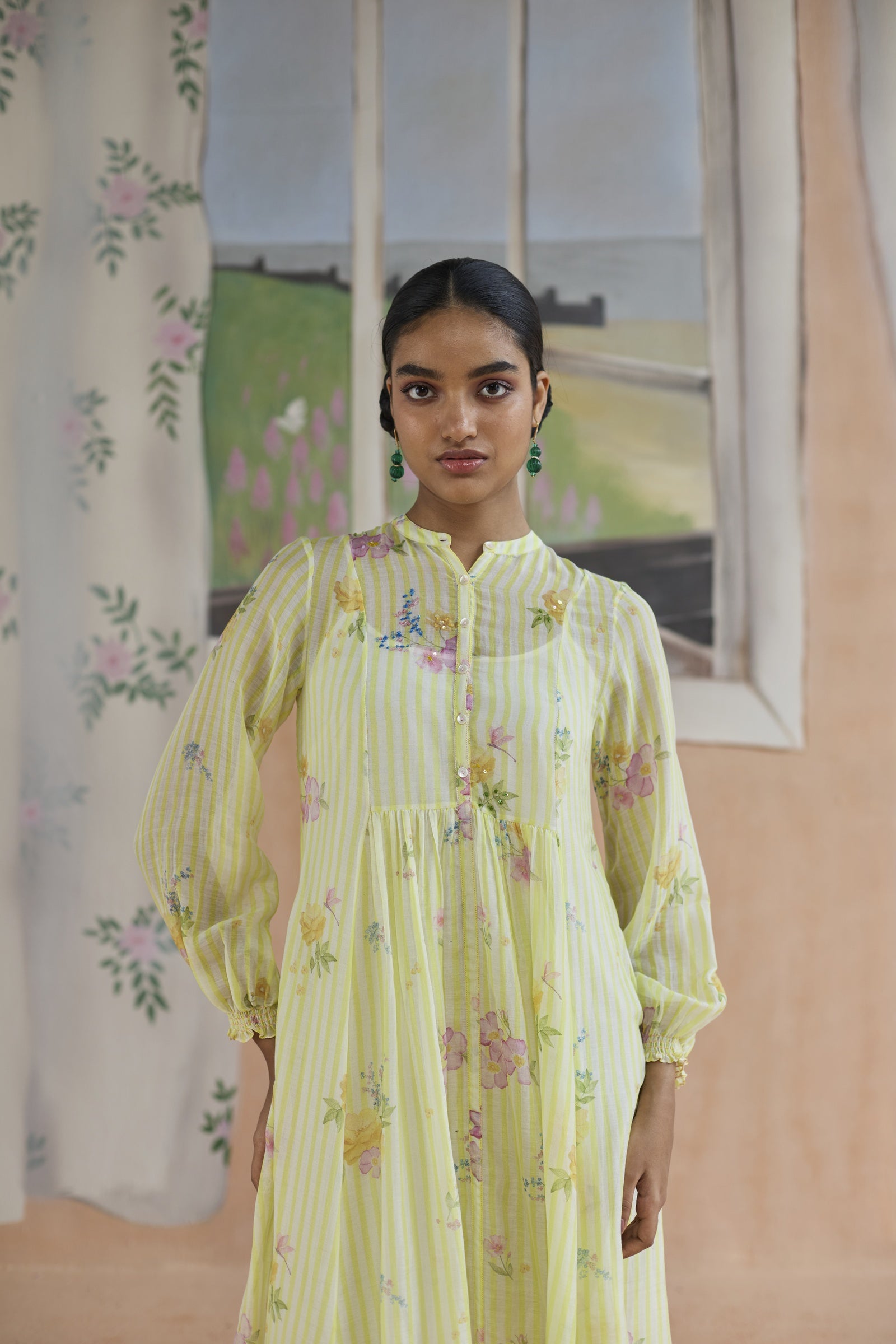 The Yellow Wildflower Dress in silk-cotton is a study in luminous elegance, where colour, print, and form come together with refined subtlety. Yellow stripes infuse the dress with distinct vibrancy, creating perfect harmony with the fabric’s soft sheen. The relaxed fit drapes gracefully, offering both fluidity and comfort, while scalloped edges trace the garment with a gentle, wave-like rhythm. The model is 5 feet 7 inches tall and is wearing a size Small. Dress length is XX inches.