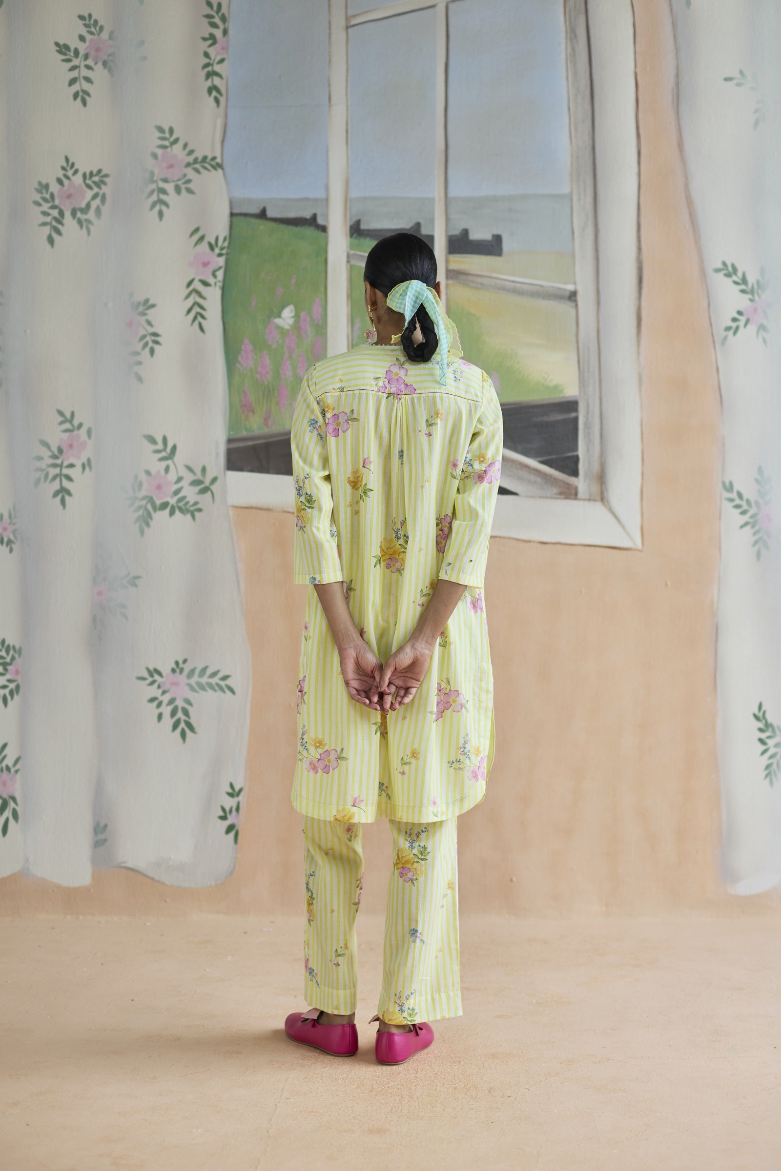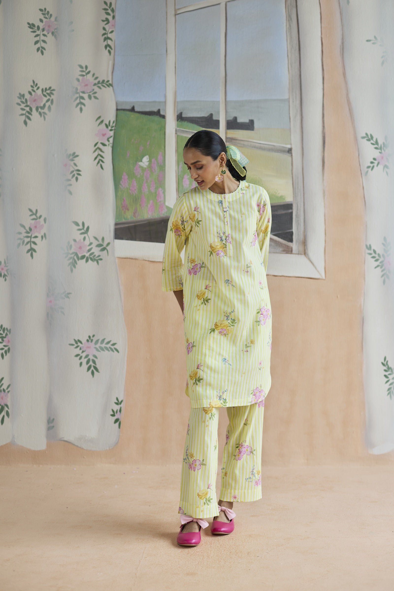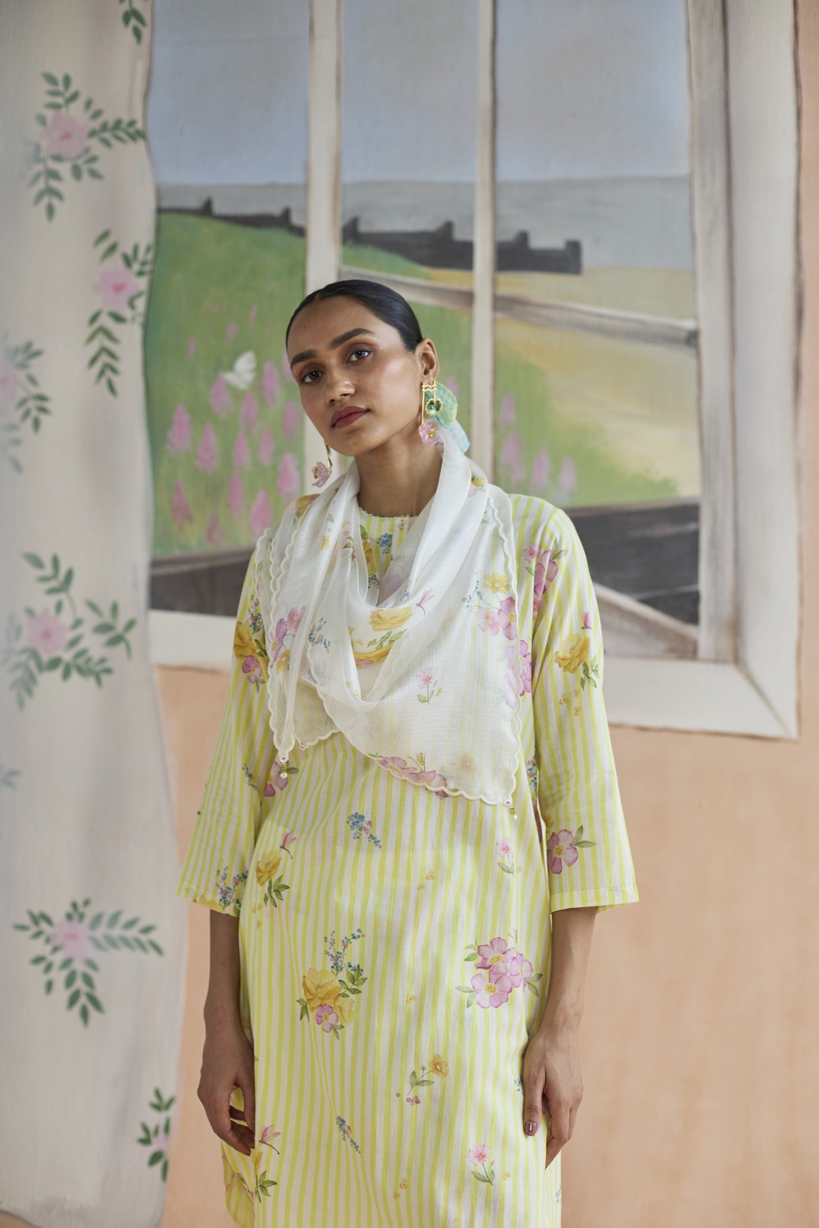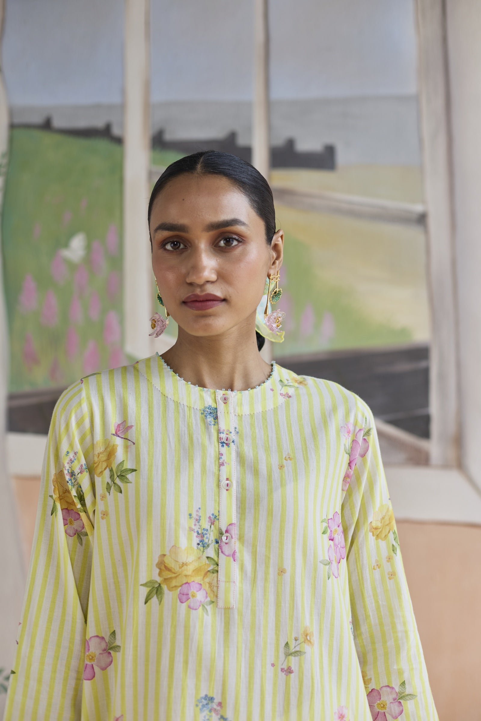 The yellow stripes carry delicate floral motifs that come alive against their luminous backdrop—an unexpected detail that transforms the design into something striking. The stripes act as a design language of their own, their linear rhythm balancing the softness of the blooms and introducing structure without rigidity. Crafted from 100% cotton in a relaxed fit, the fabric lends both grace and form to the silhouette, while meticulous hand-finishing adds a touch of individuality. The set also features pockets for added convenience. The model is 5 feet 7 inches tall and is wearing a size Small. Kurta length is 38 inches, and pant length is 36 inches.