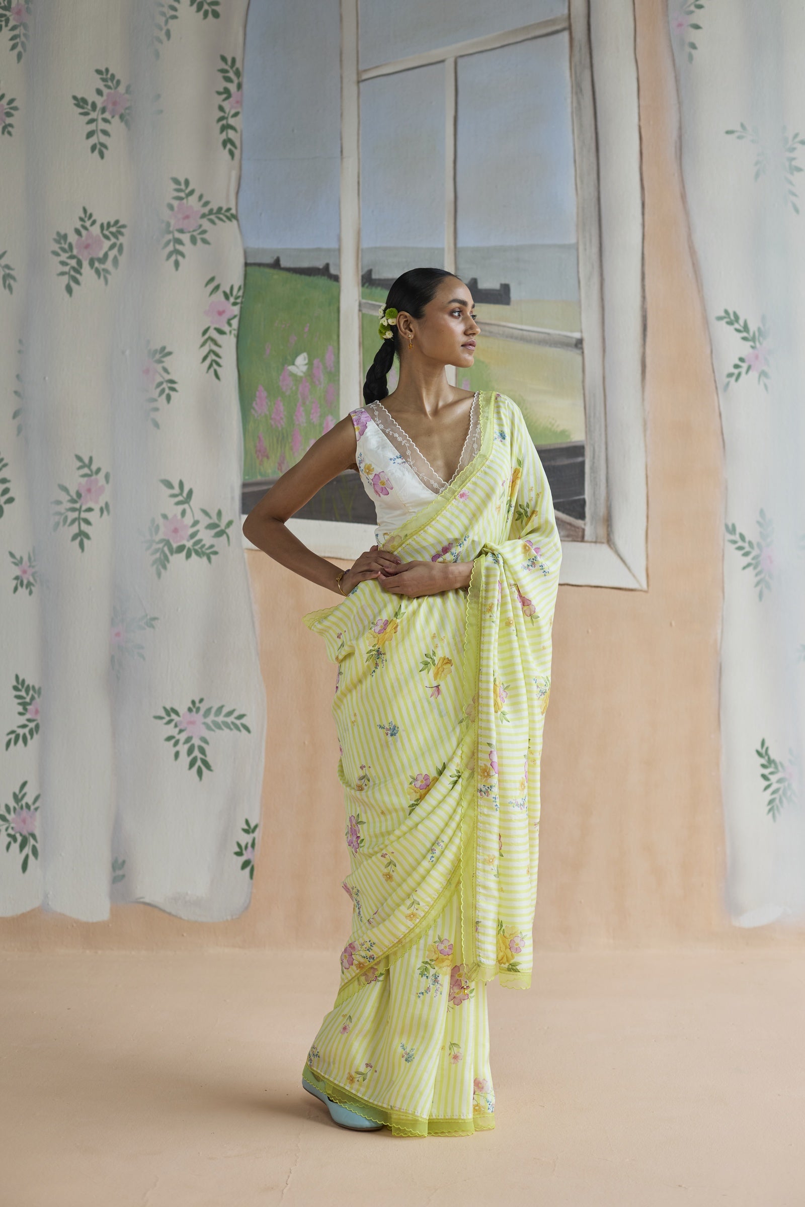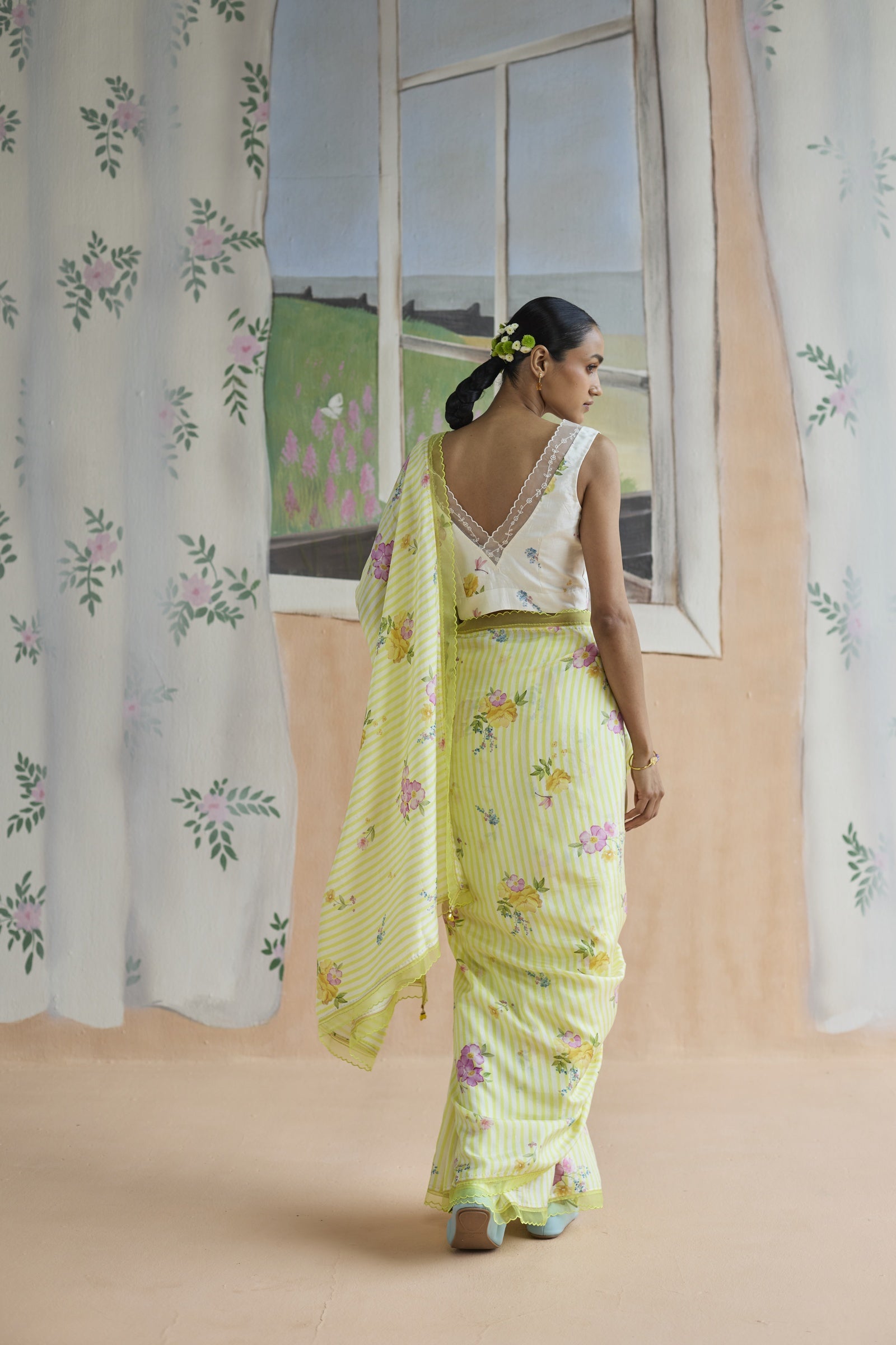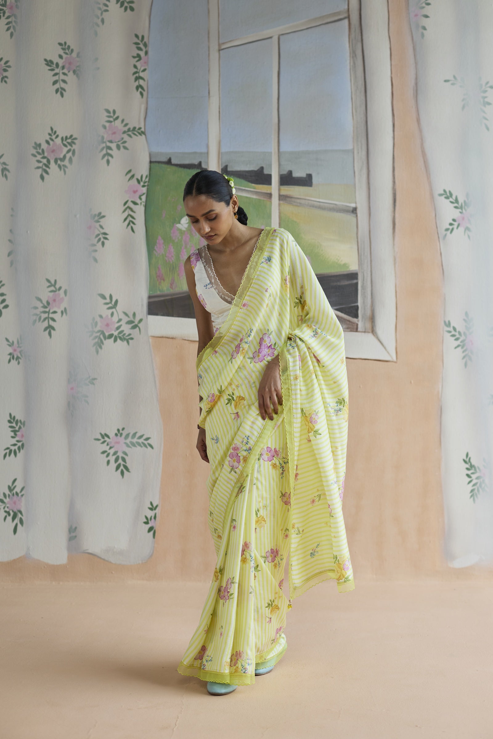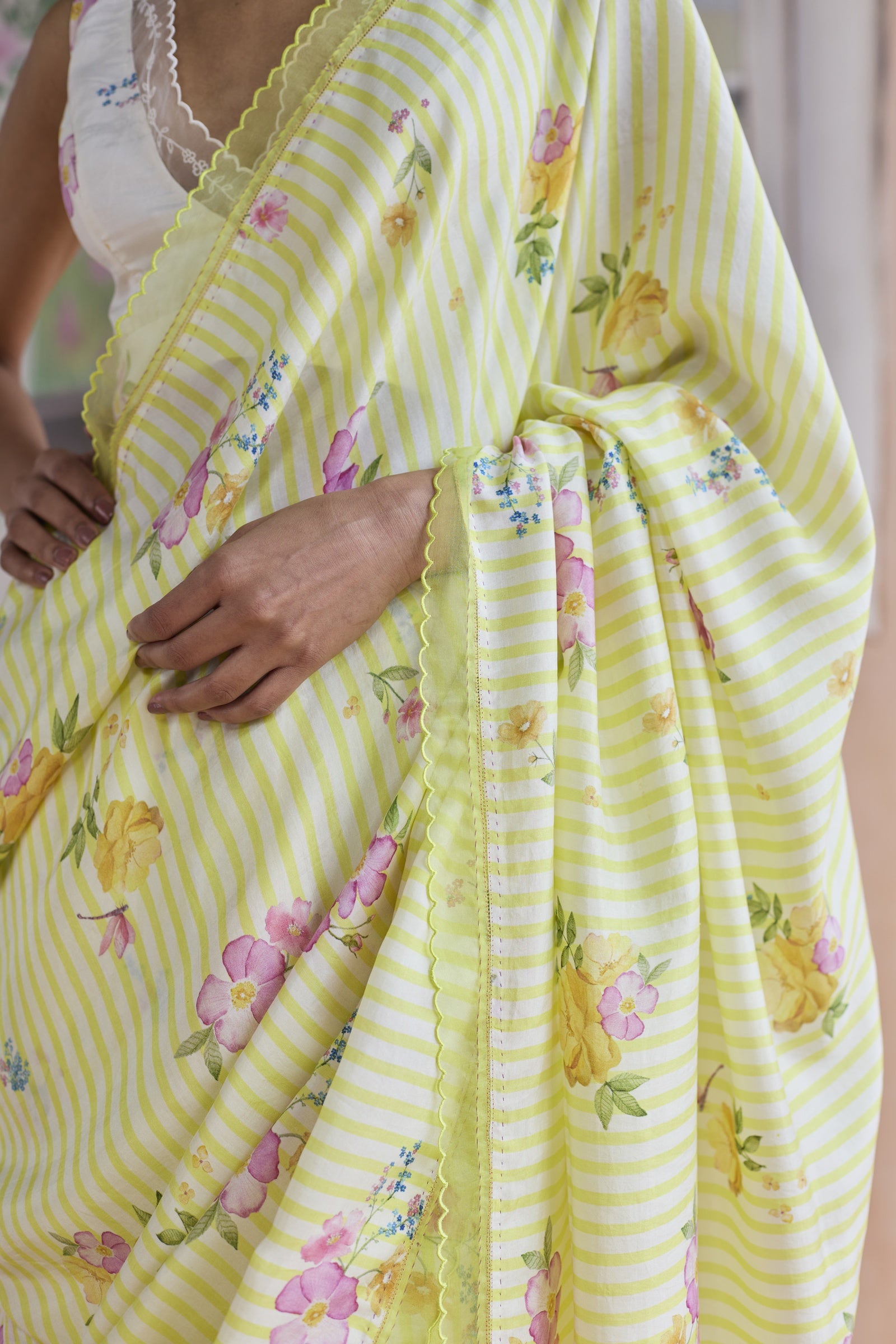 Yellow stripe sari in handwoven mulberry silk is joyful yet composed, and a radiant expression of contemporary elegance rooted in craft. The off-white floral print blouse lends a soft contrast that brings textural and visual interplay to the look. Thoughtfully designed and intricately finished embroidered, scalloped edge introduce texture, movement, and definition—elevating the sari from simply beautiful to exceptionally crafted. The naturally lustrous silk drapes with effortless fluidity, making it the perfect union of tradition and modern detailing.