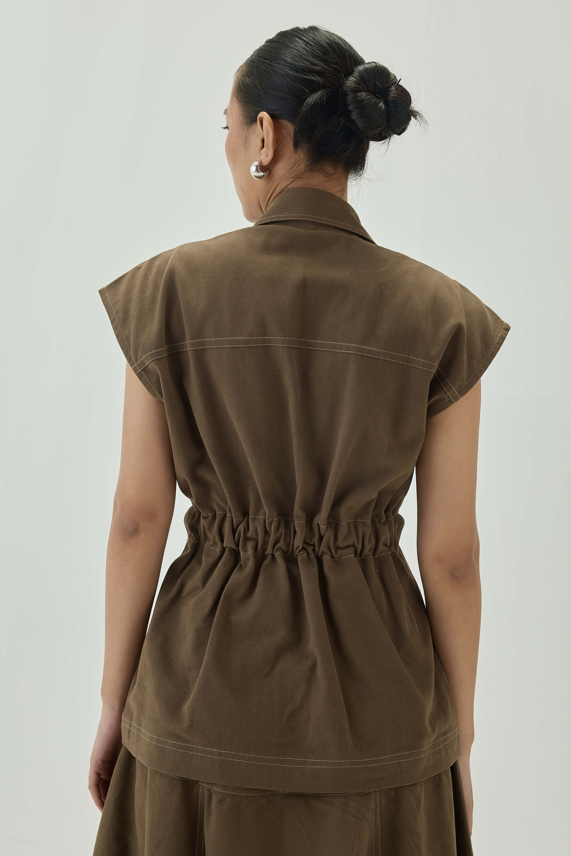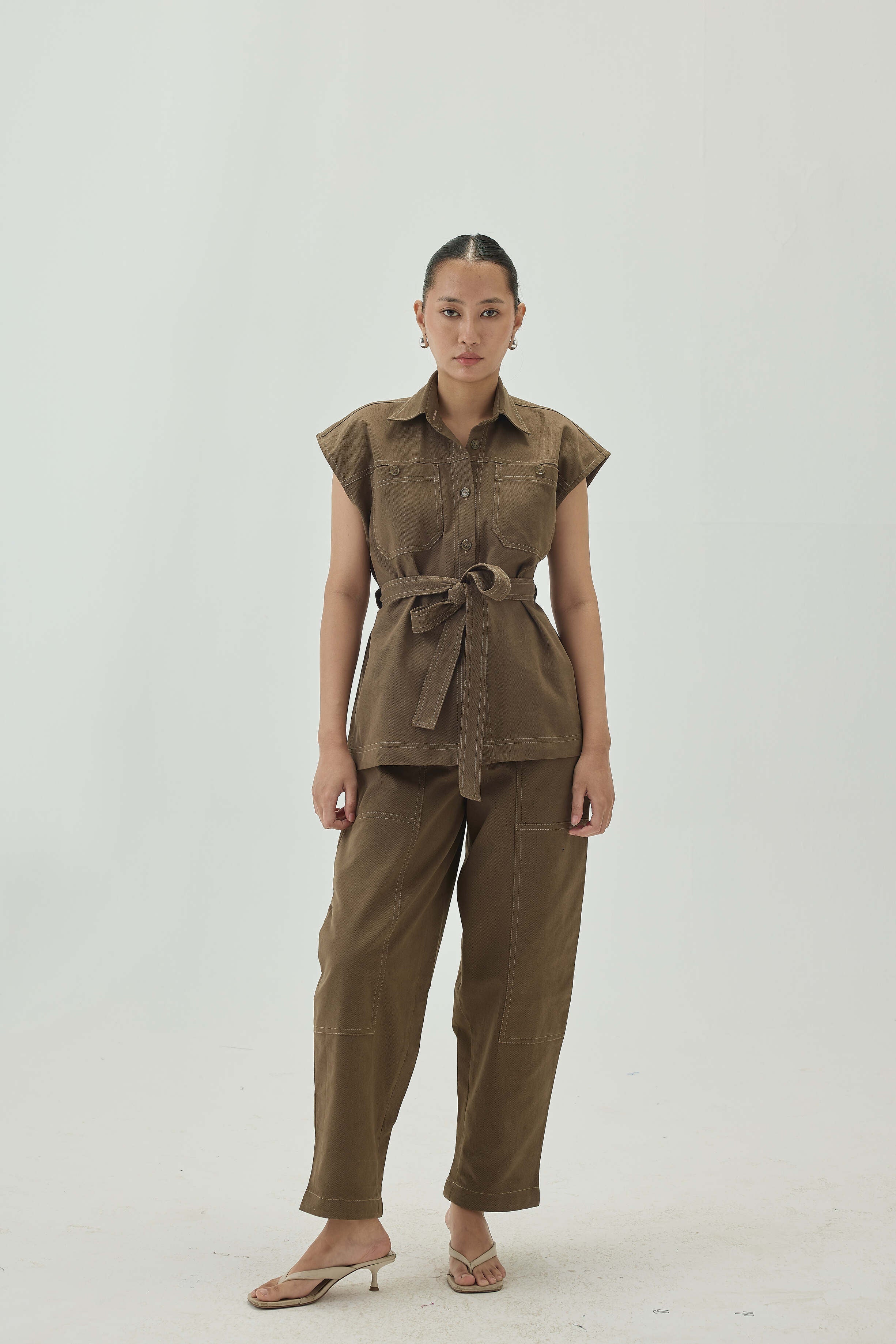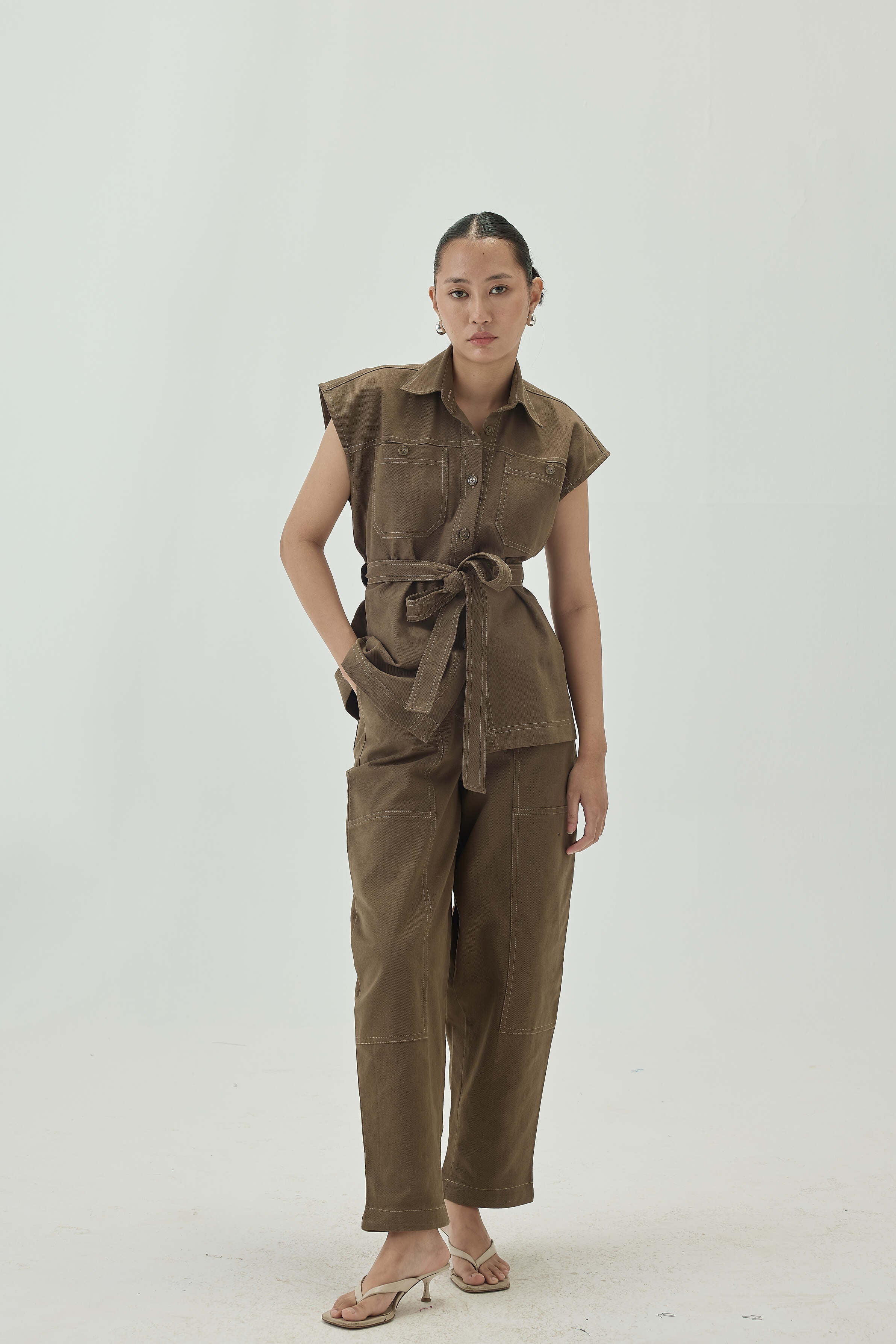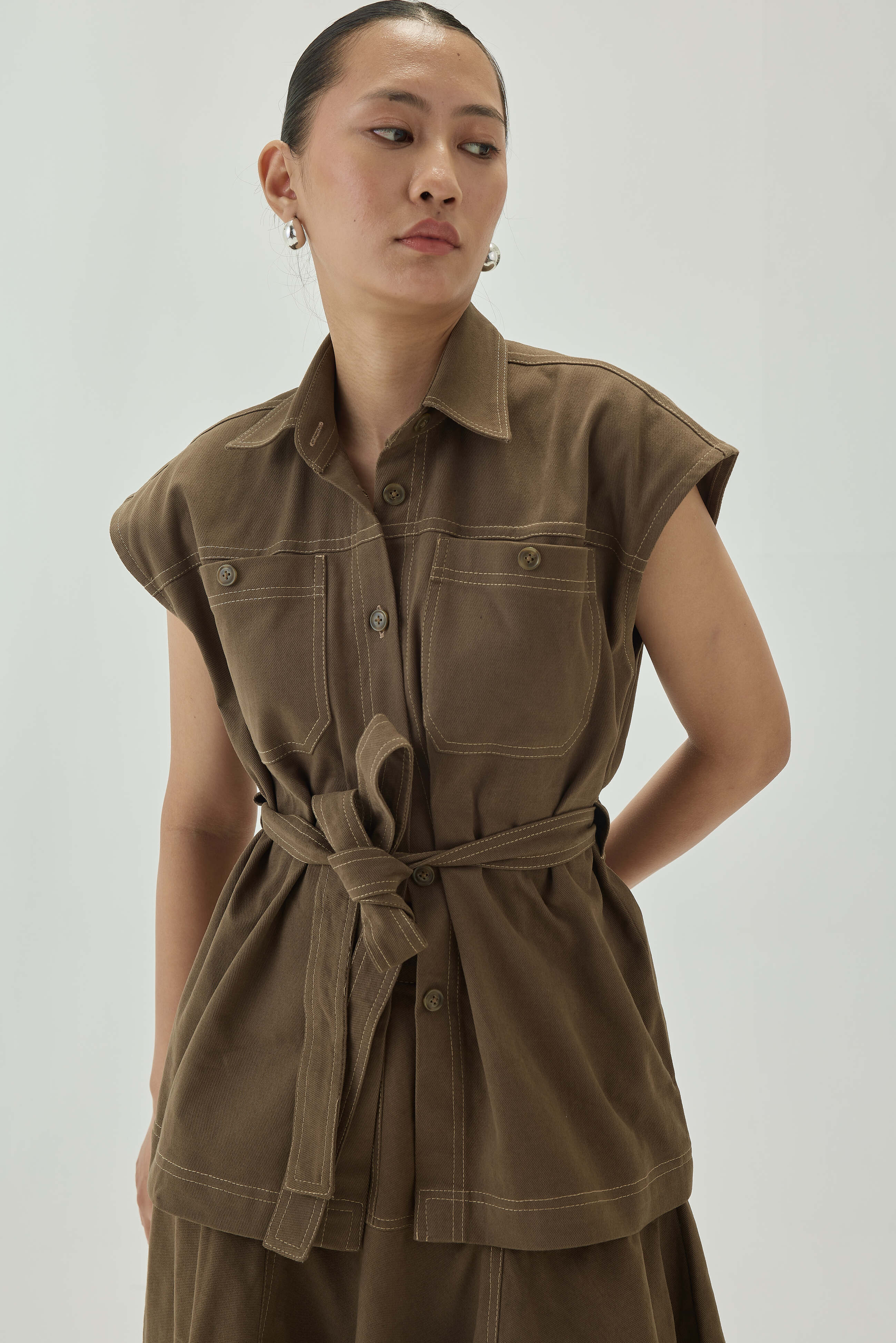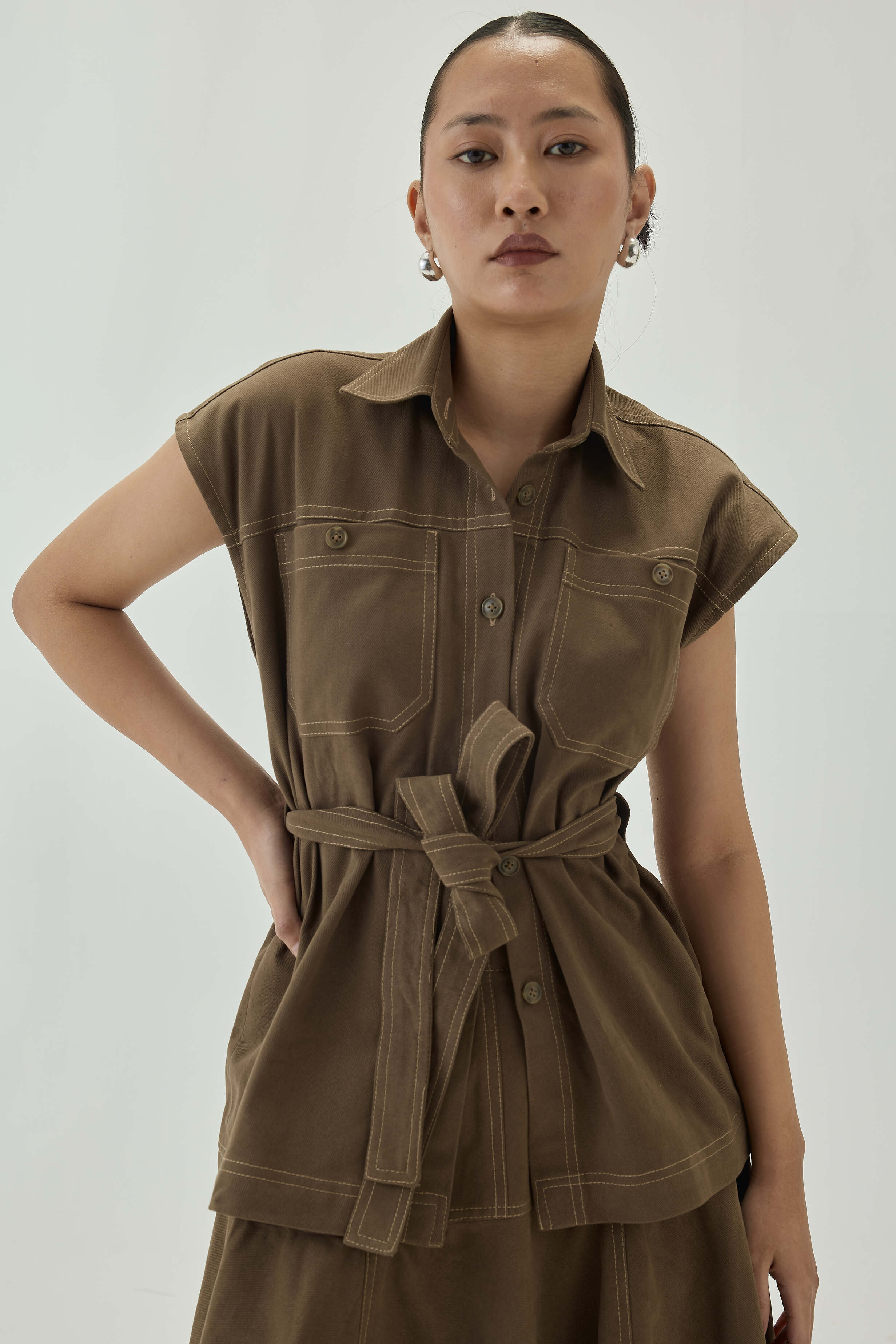 Green sleeveless shacket with a collared neckline, front button closure, contrast stitching, flap pockets, and a belted waist for a defined fit;