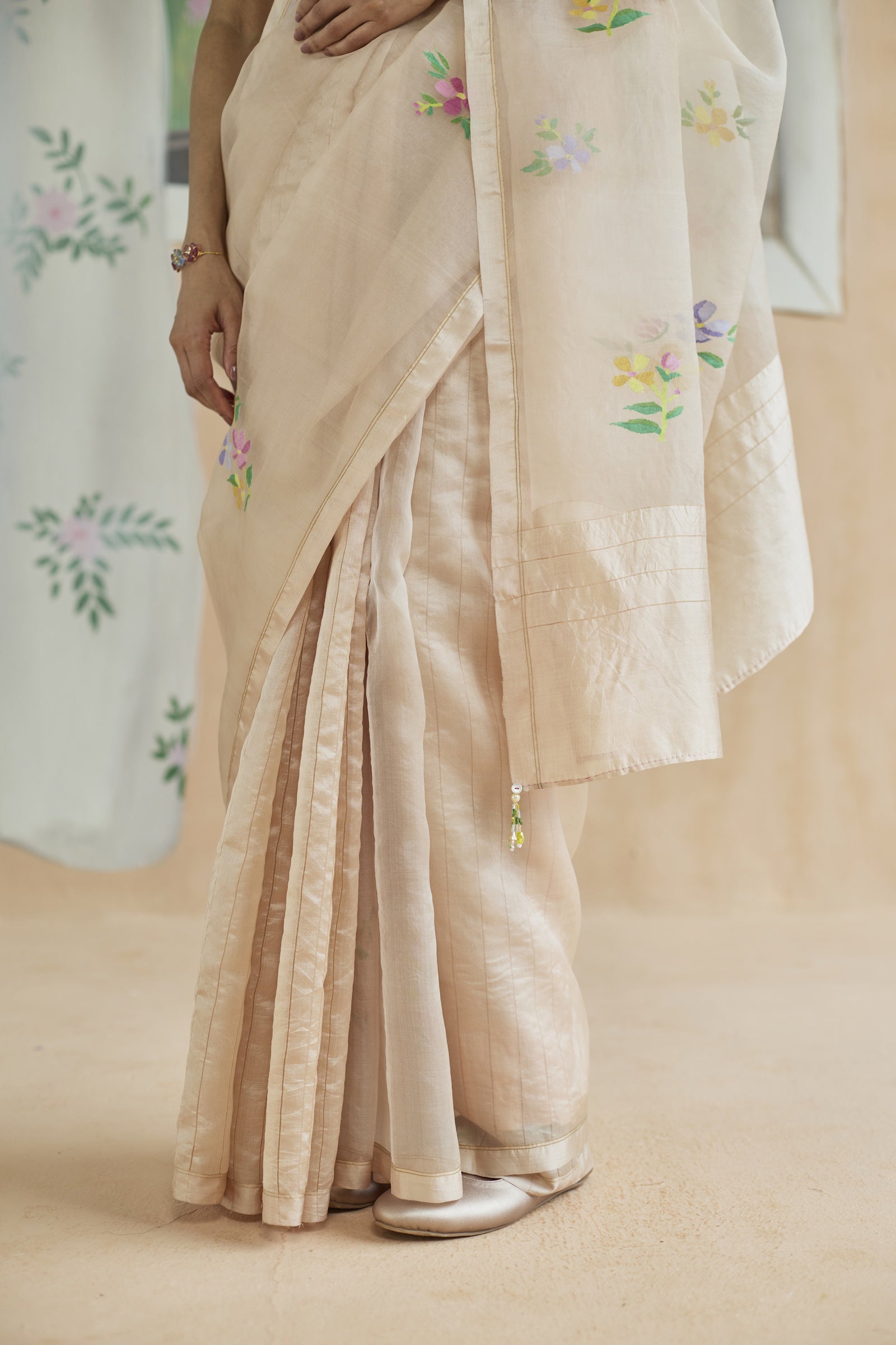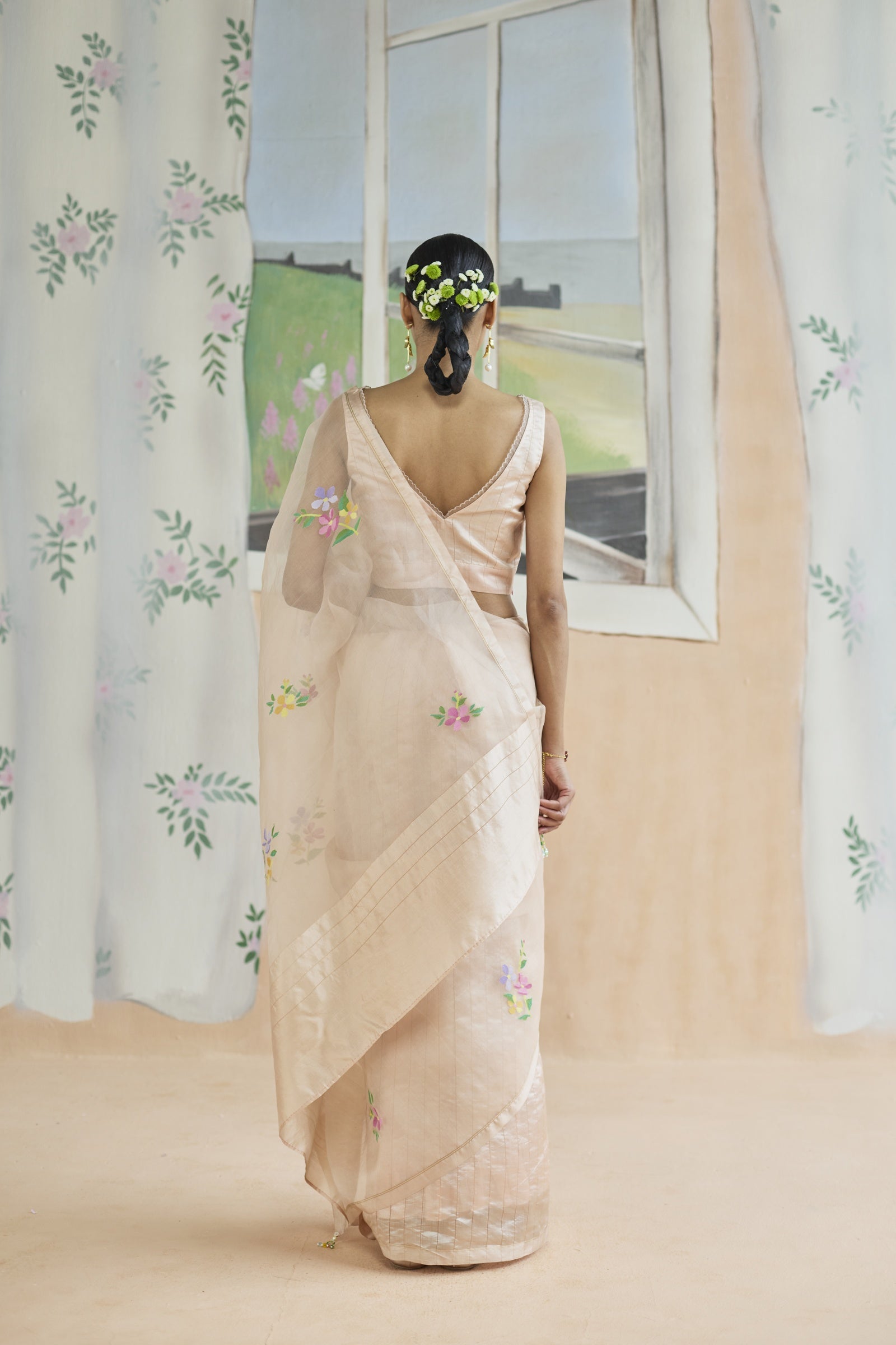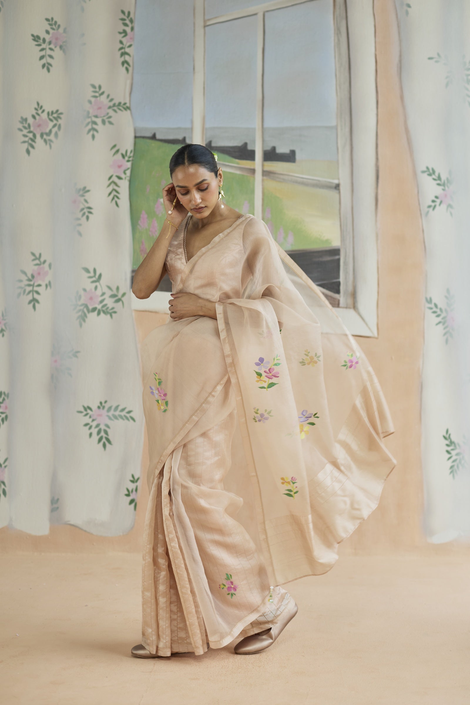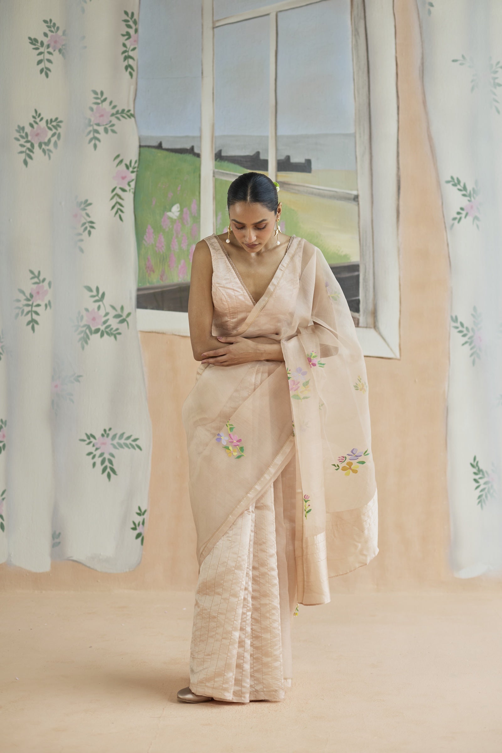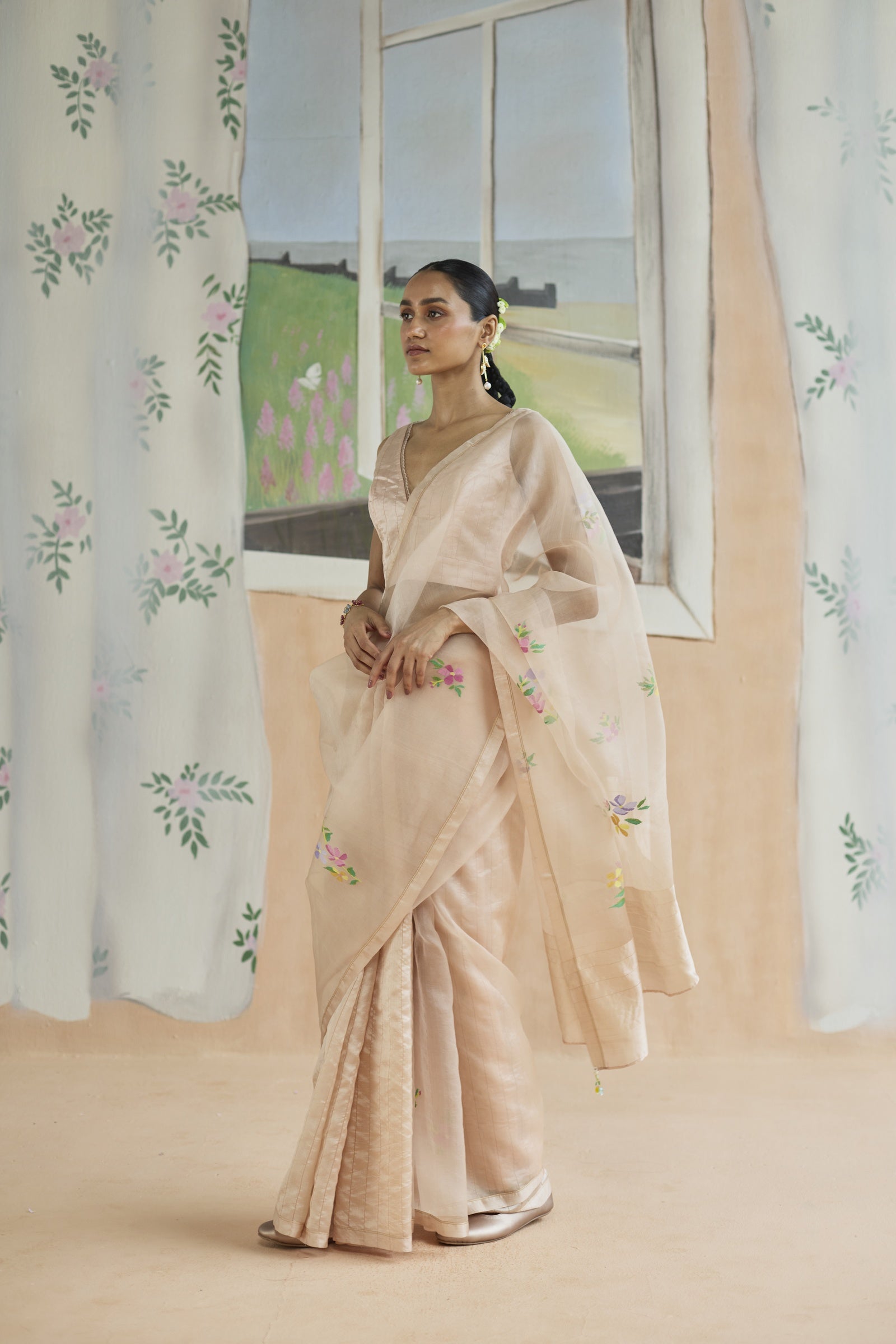 The exclusive peach jamdani sari in handwoven silk and organza has a distinct interpretation of florals. Peach colour gives this piece a distinct individuality — soft yet striking, refined yet unmistakably unique. The peach colour is a result of extraordinary patience and precision. Each piece is one-of-a-kind and meticulously crafted over weeks, weaving motifs into works of art by master artisans. The peach jamdani sari creates an ethereal texture — feather-light, sheer, and luminous with motifs that appear to float on the surface. This is an epitome of elegance and heritage in your wardrobe.