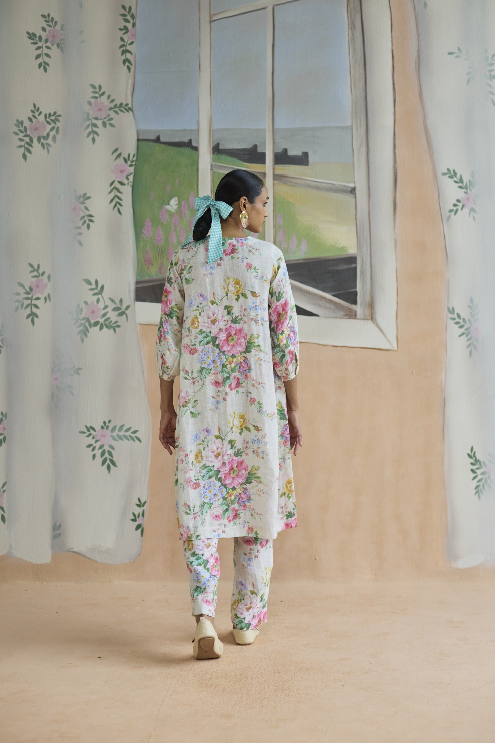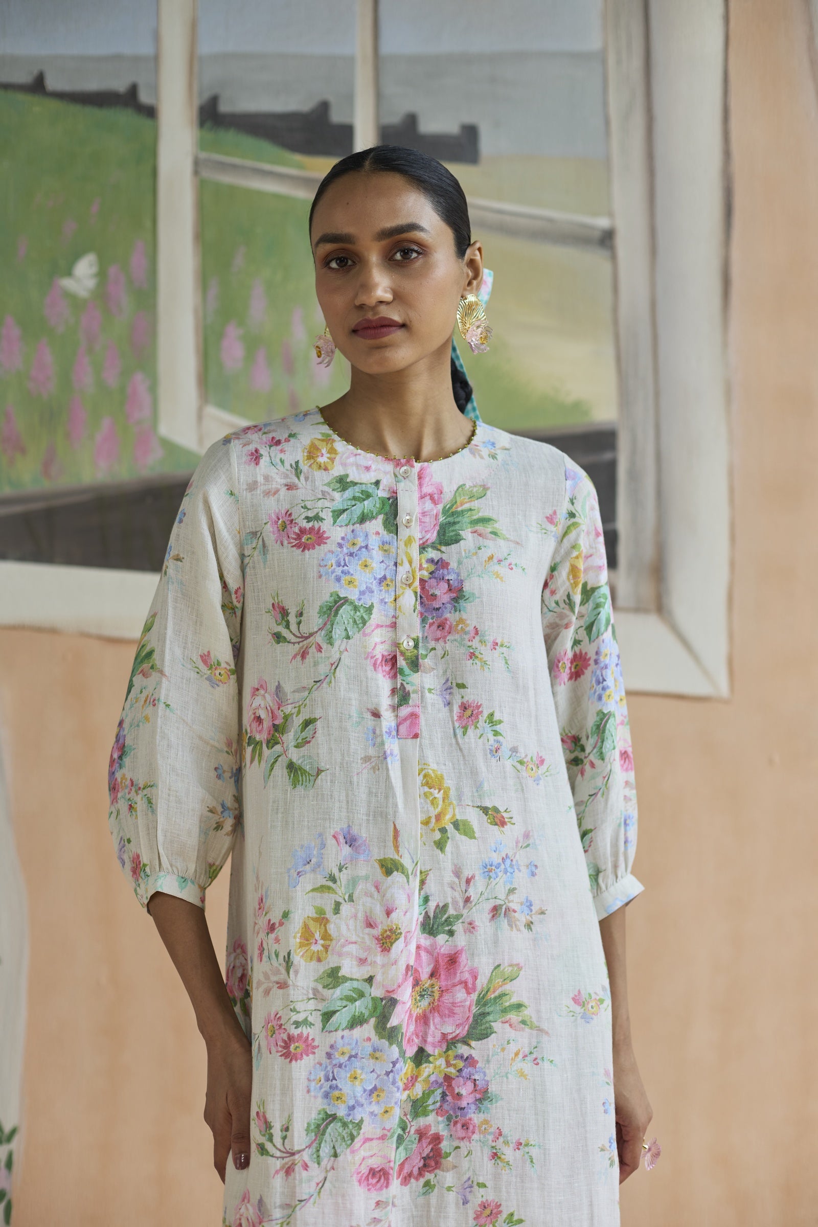 Off-white floral bouquet mid kurta set in 100% linen is a portrait of understated elegance, with a silhouette that balances refinement and ease. The bold, gathered blossoms create a statement of presence and femininity, with an artistry that feels timeless and contemporary. This comfort-first silhouette is elevated by its poised proportions. A relaxed fit and crafted from linen, the fabric lends grace and form to the silhouette. Meticulous hand-finishing adds a touch of individuality. Pockets for convenience.