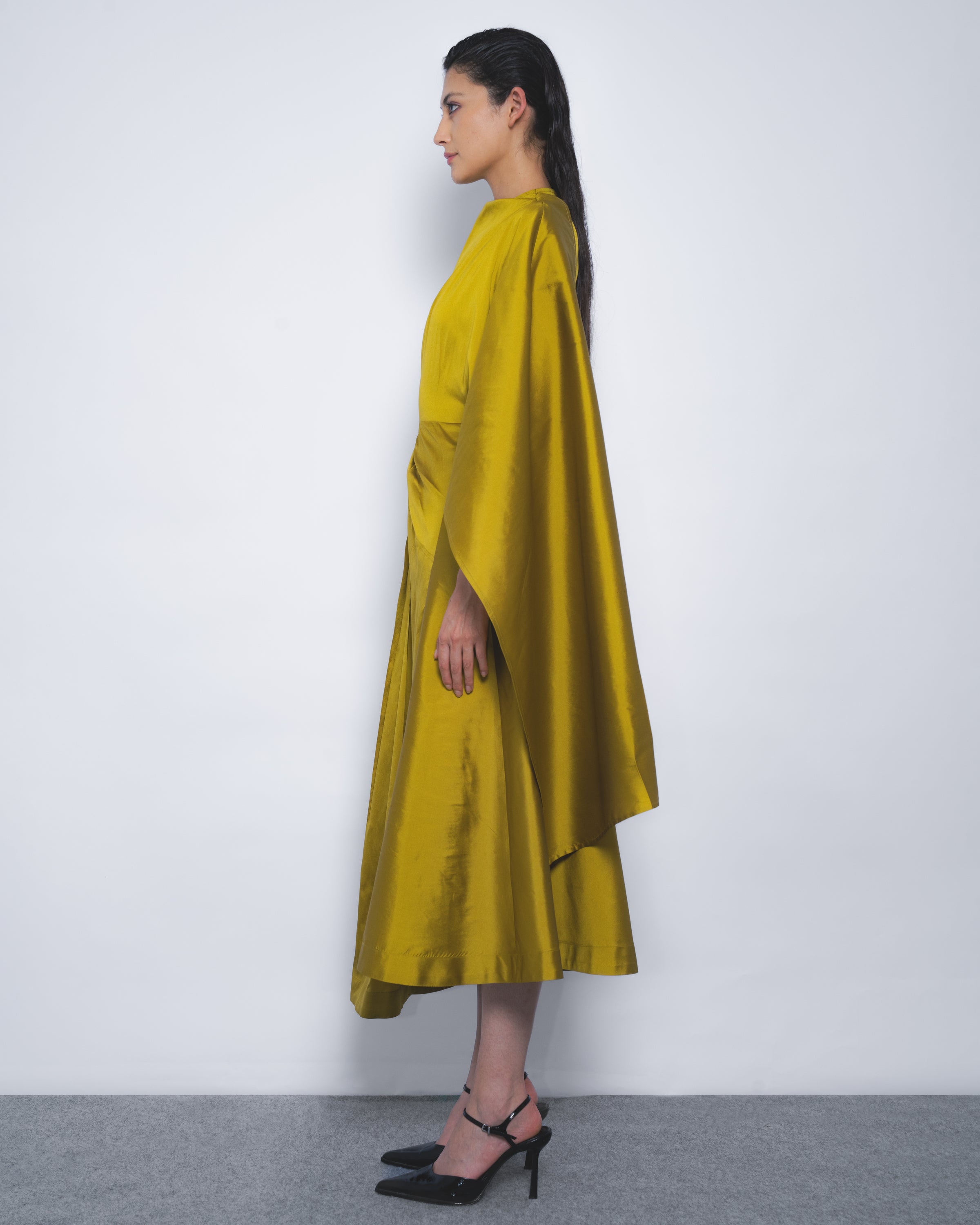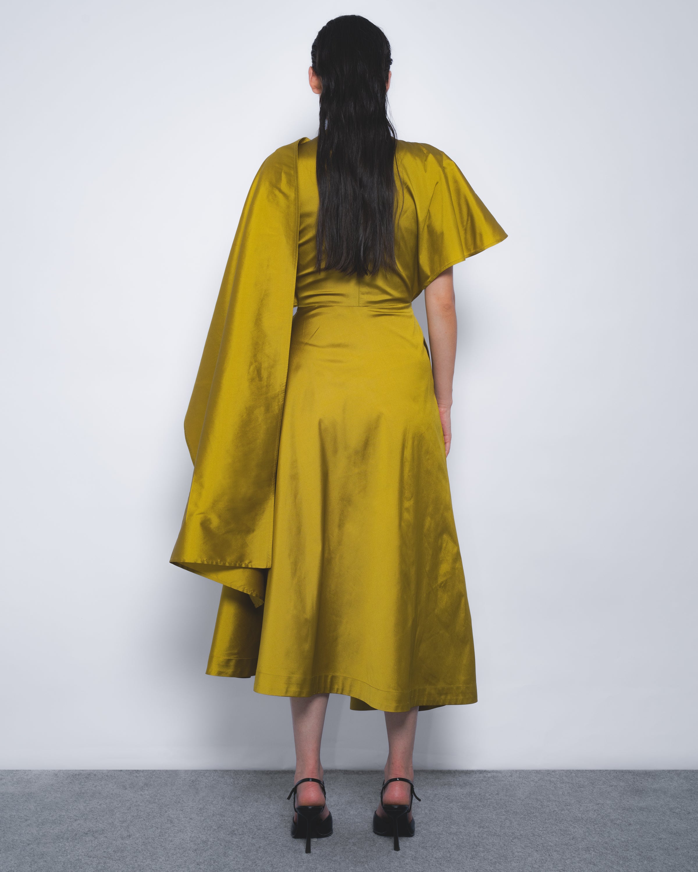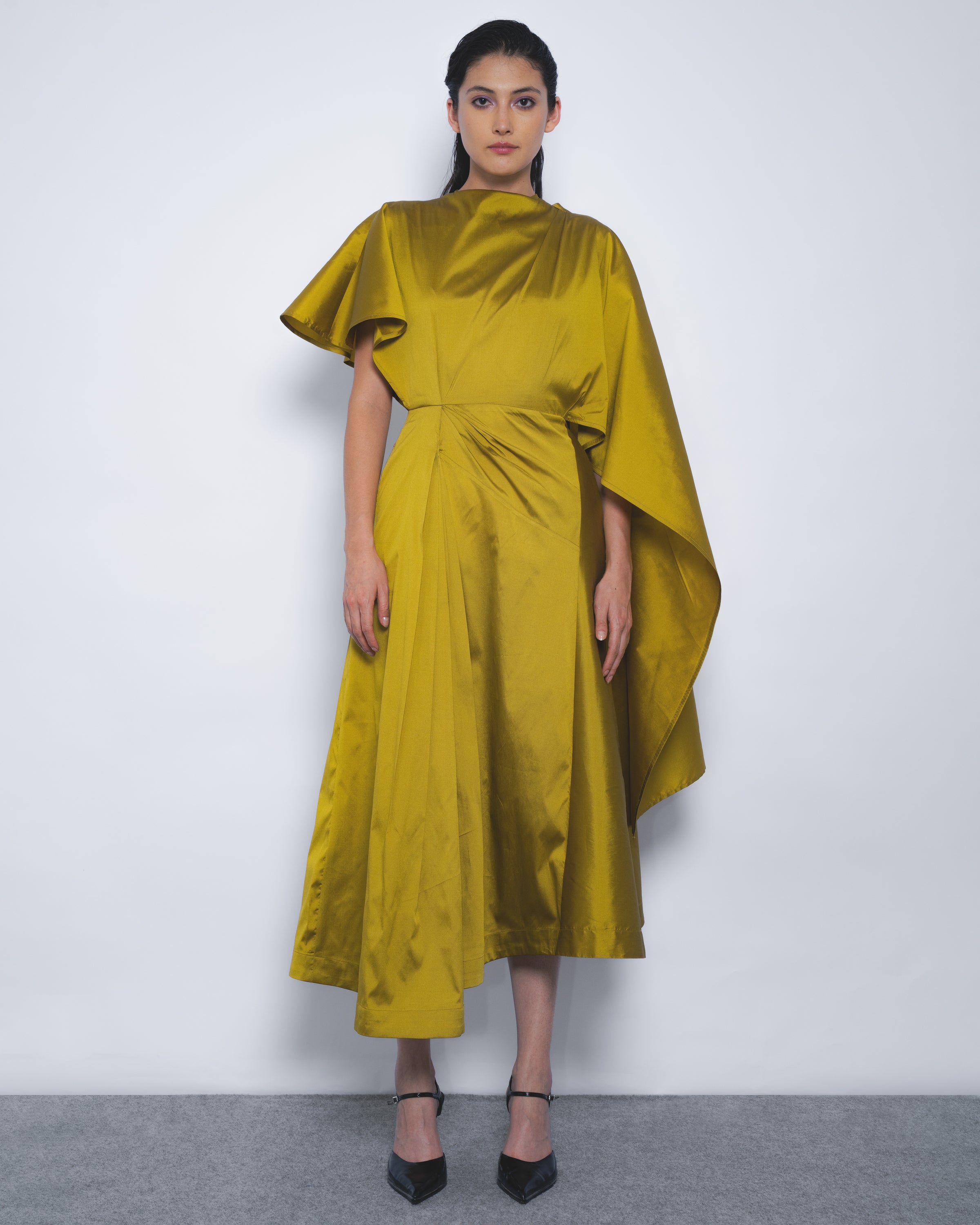 Crafted in lustrous taffeta, this cocktail dress embodies elegance and timelessness with a touch of drama. It explores the interplay of structure, fluidity, symmetry, and tailored construction, delicately hand-pleated and draped to create a silhouette that is both refined and boldly modern.