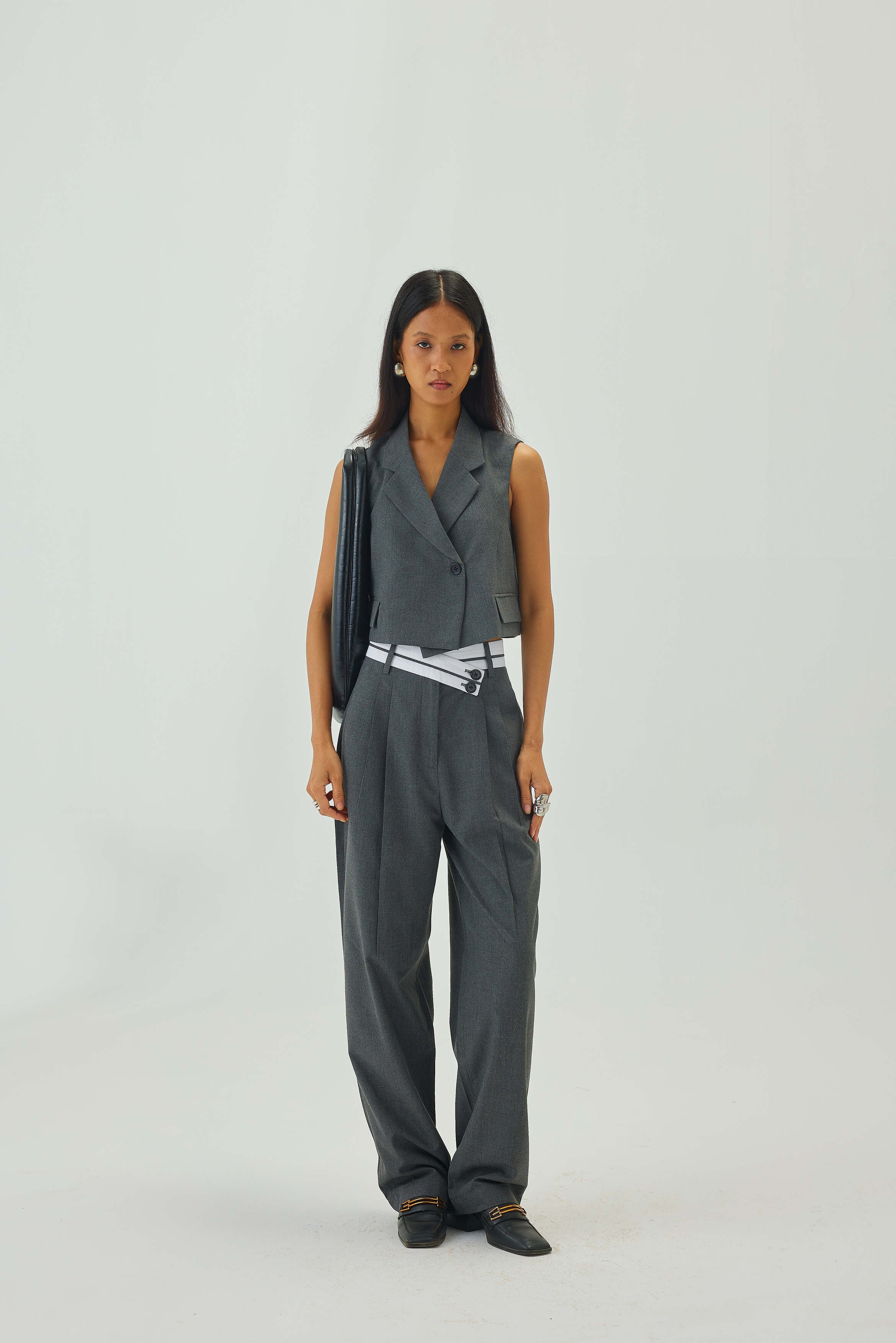 High-waist wide-leg pants featuring a cross-closure waist and contrast belt detail; the model is 5'8" and wearing size XS, and the product will be dispatched in 3–4 days with a 7-day return/exchange policy.