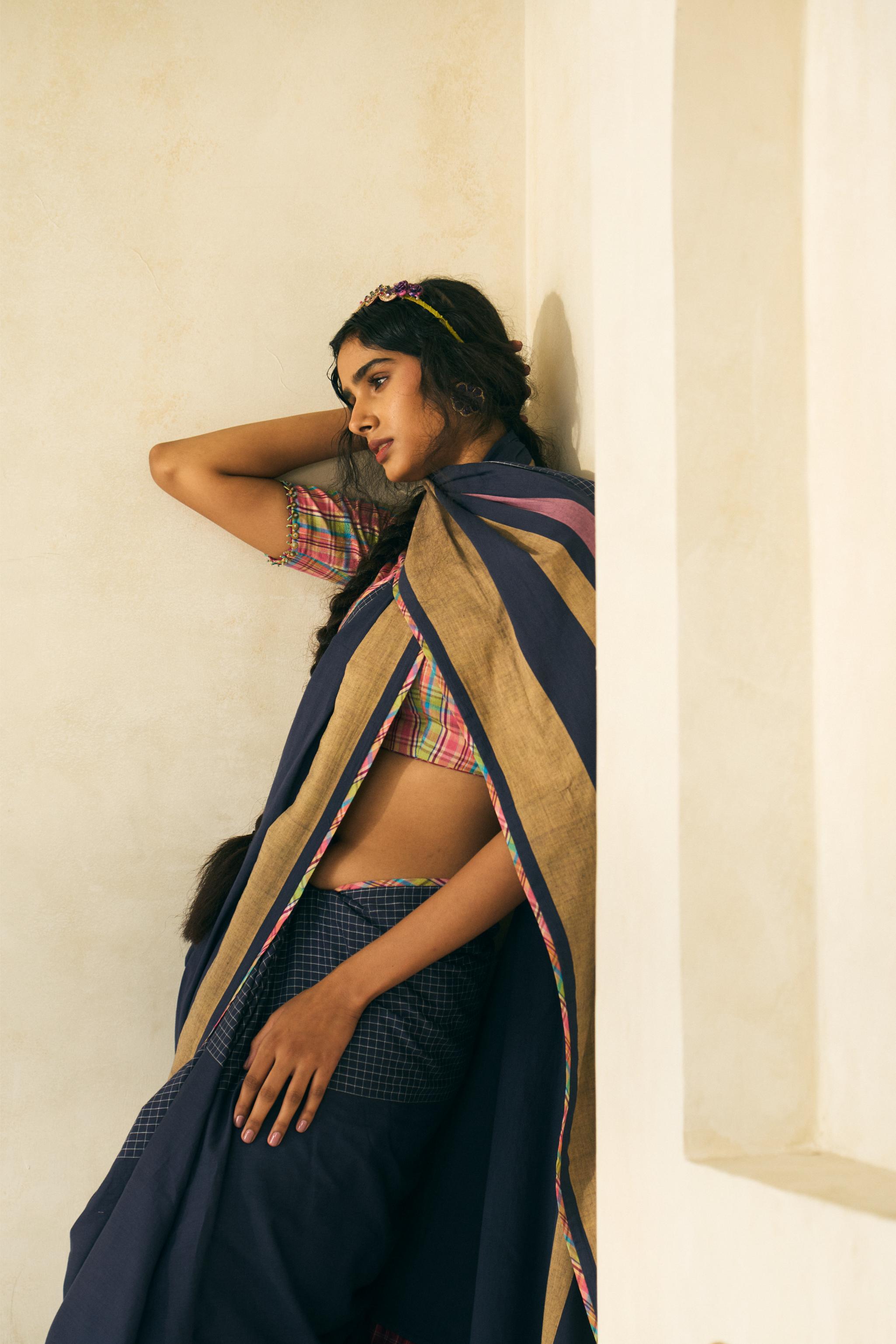 This sophisticated V-neck blouse features fitted short sleeves, a convenient back zip closure, and exquisite hand beading, expertly crafted in handwoven yarn-dyed Bengal cotton with charming punch-pink checks and lined with artisanal hand block-printed fabric for a perfect fusion of traditional craftsmanship and refined elegance.