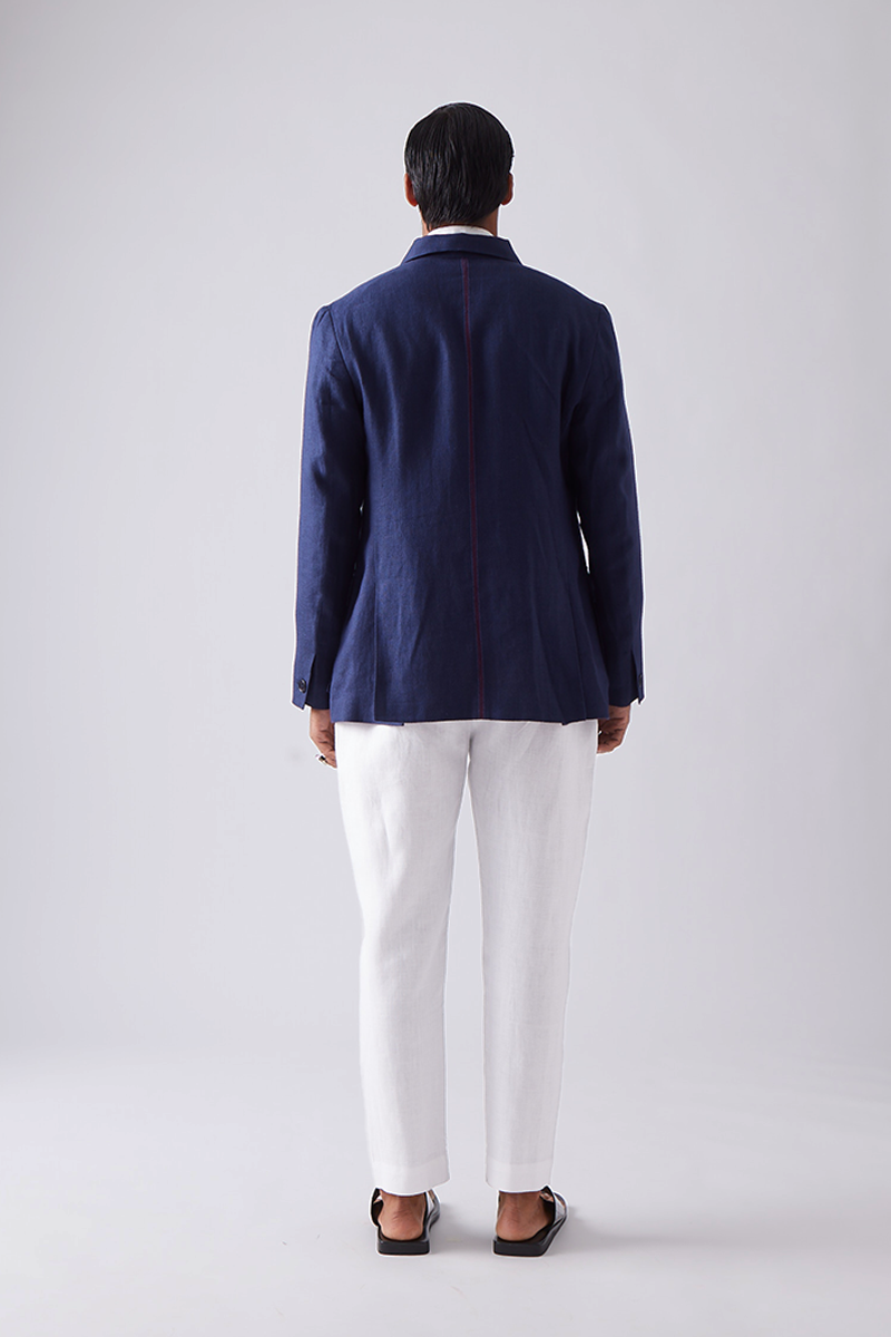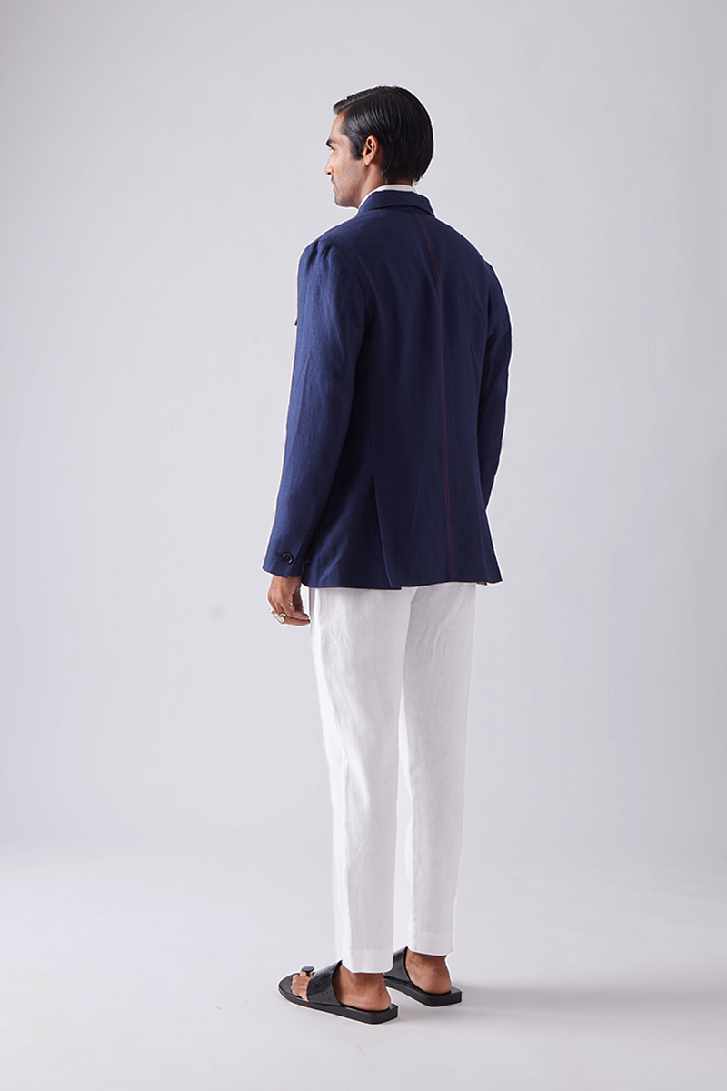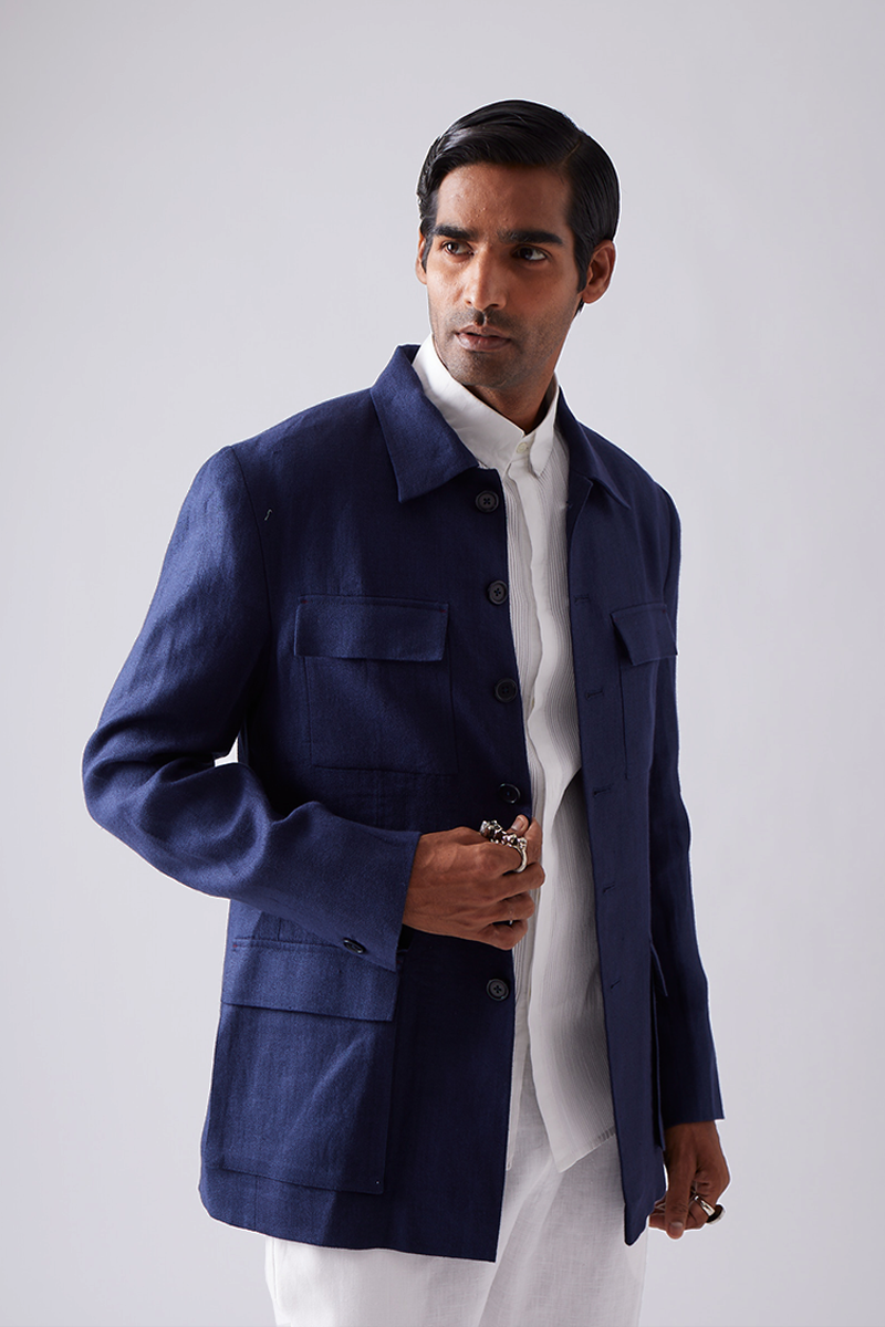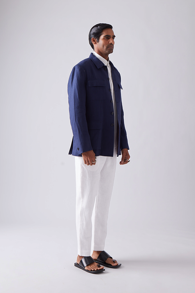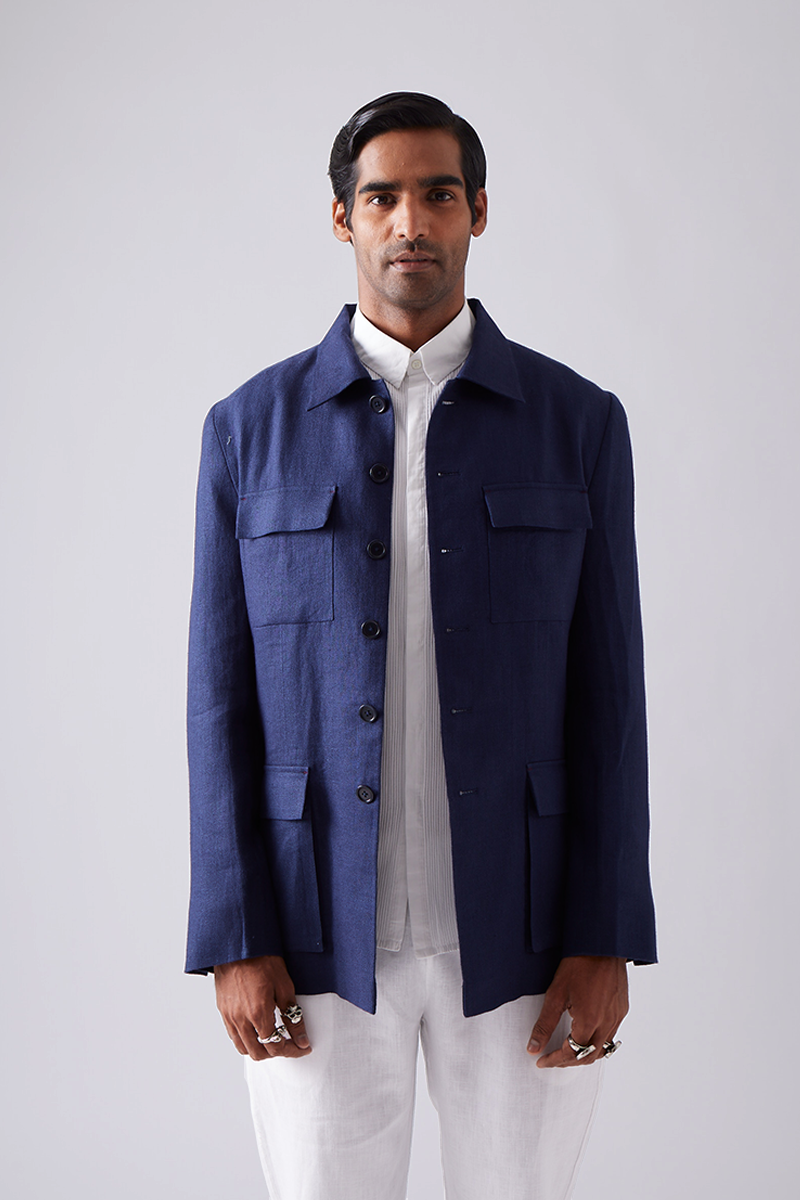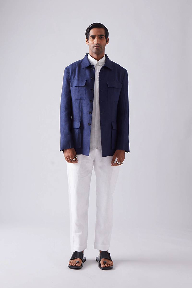 Our Aleesar jacket features a shirt collar and four patch pockets, highlighted with our signature selvedge at the center back; the bottoms shown are for shoot purposes only and are priced separately.