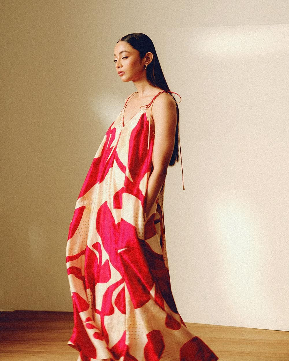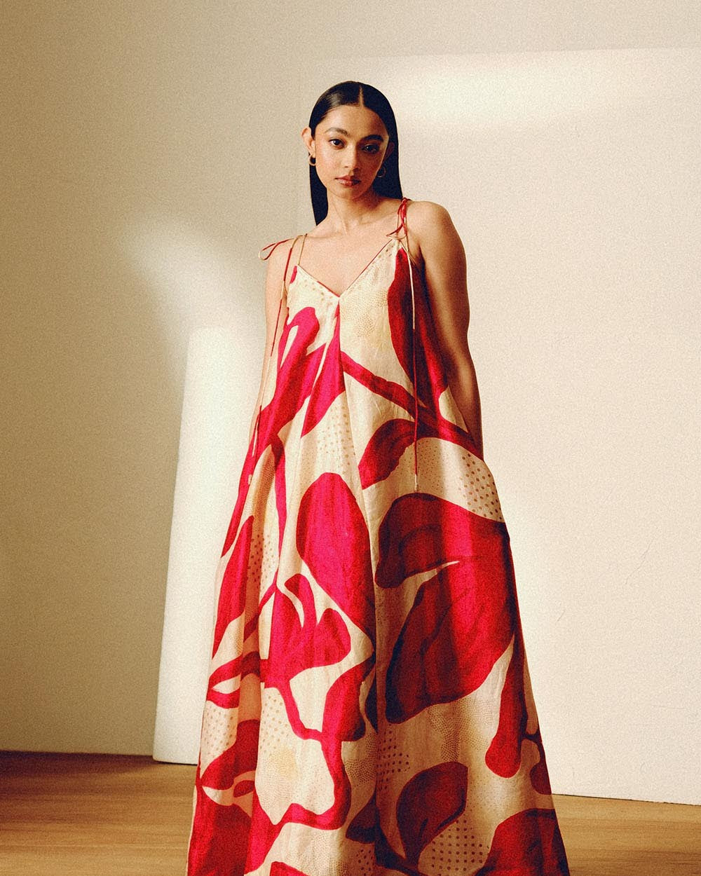 This statement maxi slip dress in handwoven and hand-painted mulberry silk creates ethereal movement with its flowing silhouette. The distinctive shoulder cord tie-up detail adds customizable structure to the diaphanous fabric. Each piece highlights the exceptional quality of artisanal silk craftsmanship, from meticulous handweaving to the subtle variations in the hand-painted patterns.