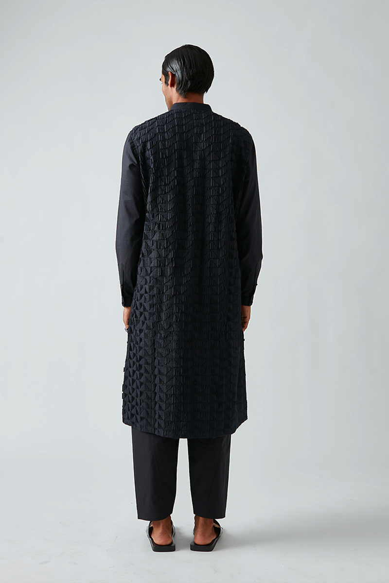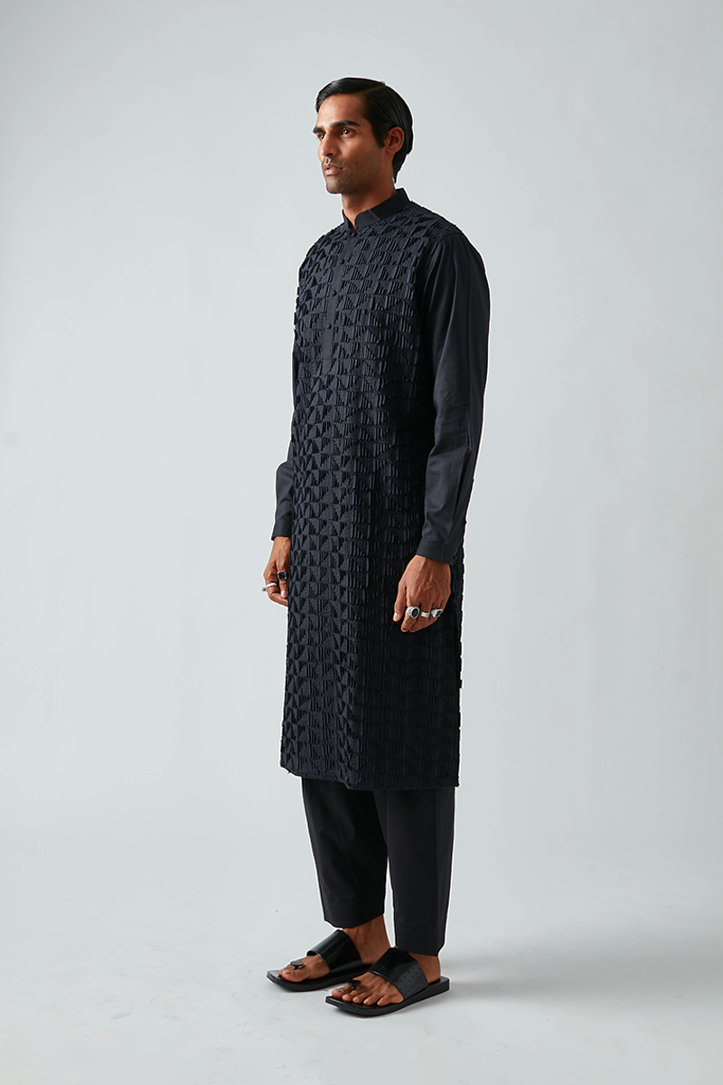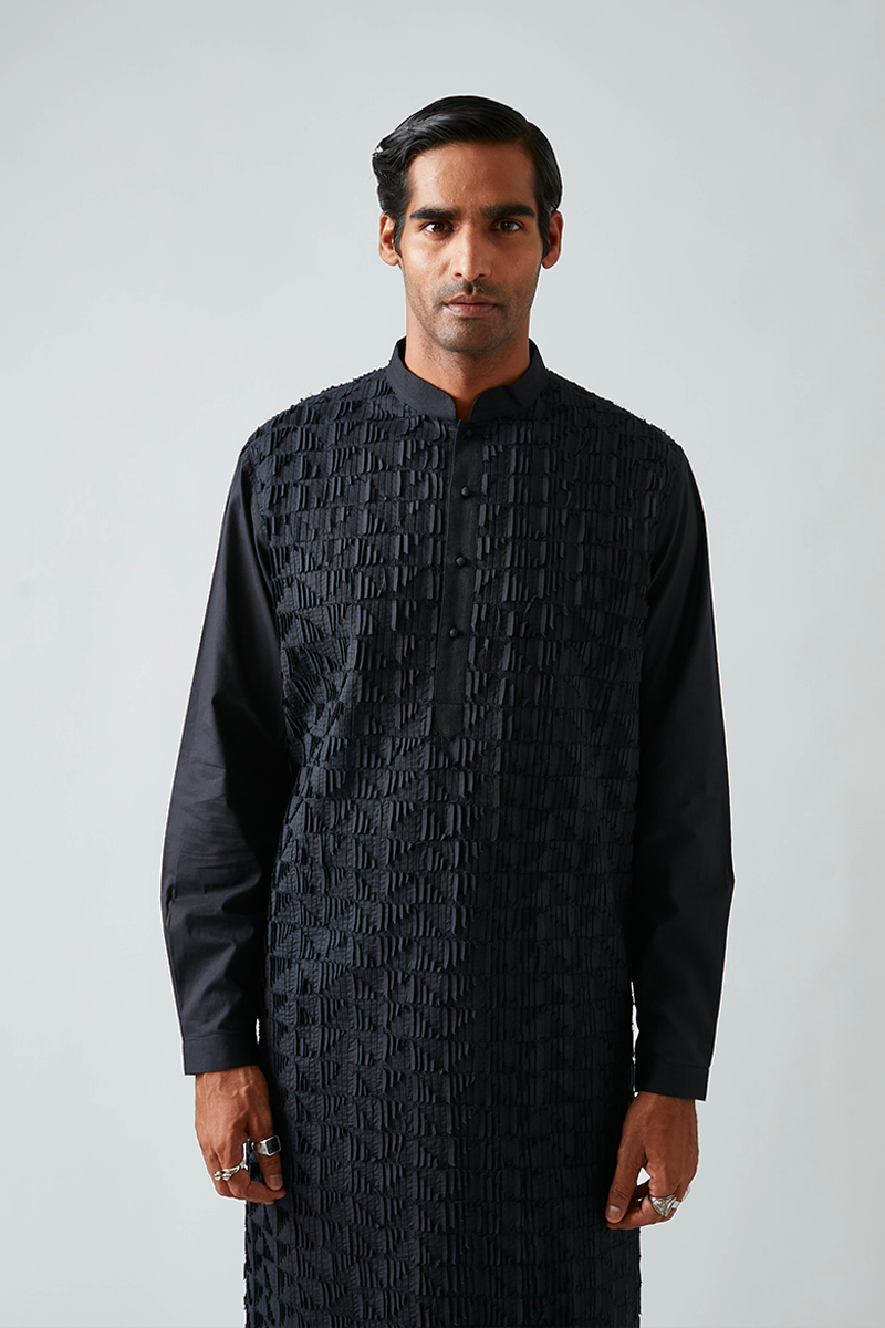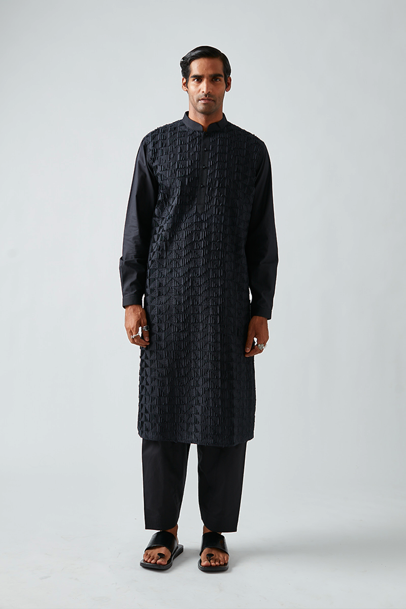 Our kurta features a 3D texture called Triangle Louvre and comes paired with churidaar pants, designed with a band collar, a four-button placket, cuffed sleeves, and finished with handmade matar (pea) buttons. The fine pleats of our signature pintuck collection are meticulously crafted by hand on single-needle machines, with subtle variations that enhance the handmade quality of the piece. The salwar pants shown are for shoot purposes only and are priced separately.