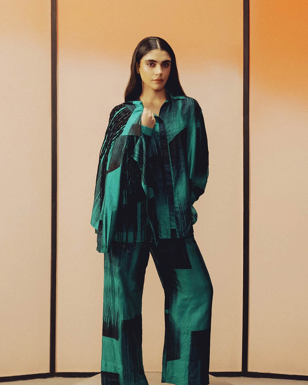 Crafted in handwoven mulberry silk, this jacket with a lapel collar features a hand -painted print adorned with glass beadwork. It showcases handcrafted cord detailing at the front and the back and has a classic relaxed-fit silhouette.