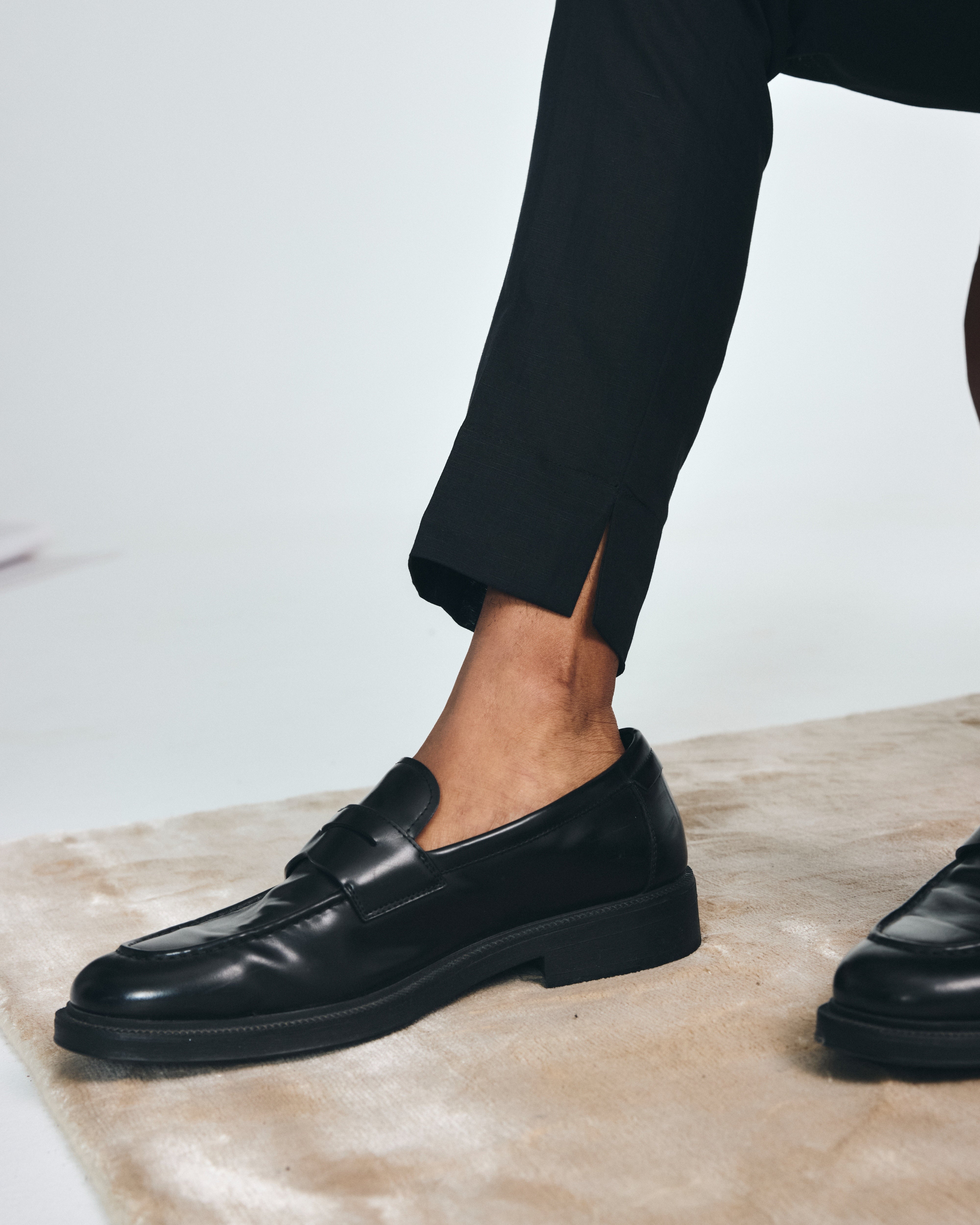 The black trouser-style pajama features an elasticated back, a zip and fly front closure, two hip pockets, and an ankle slit, making the slim fit comfortable and easy to slip in and out o