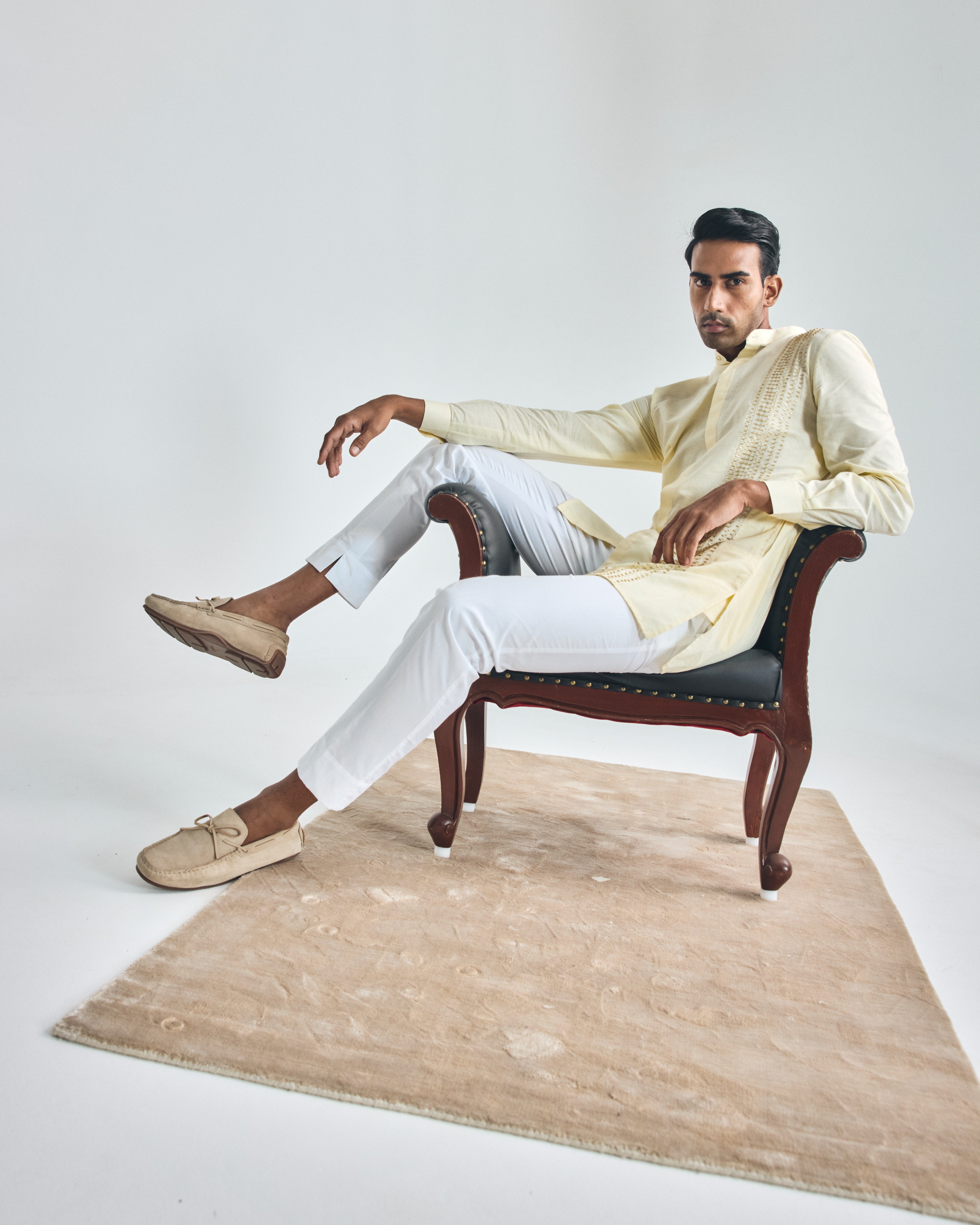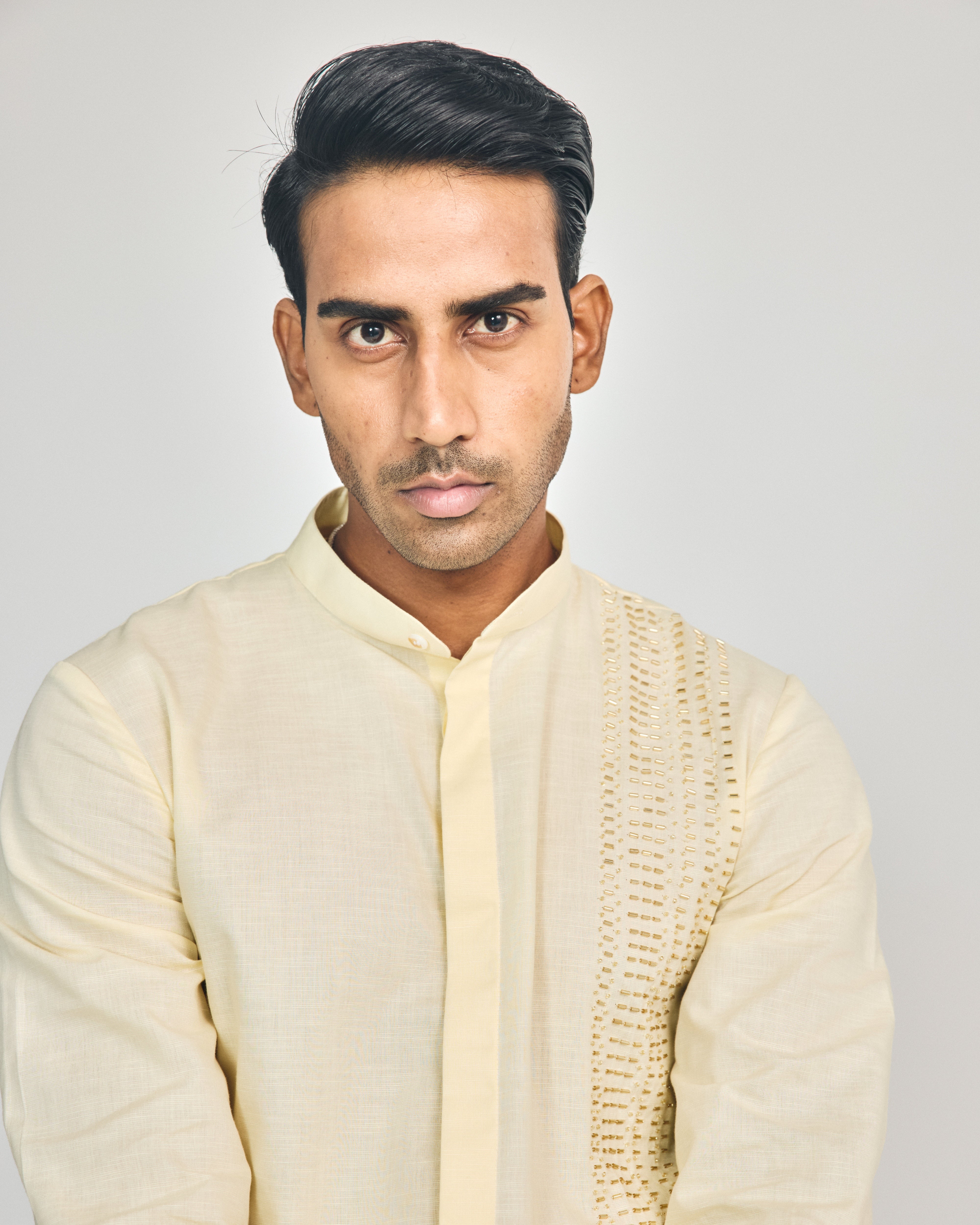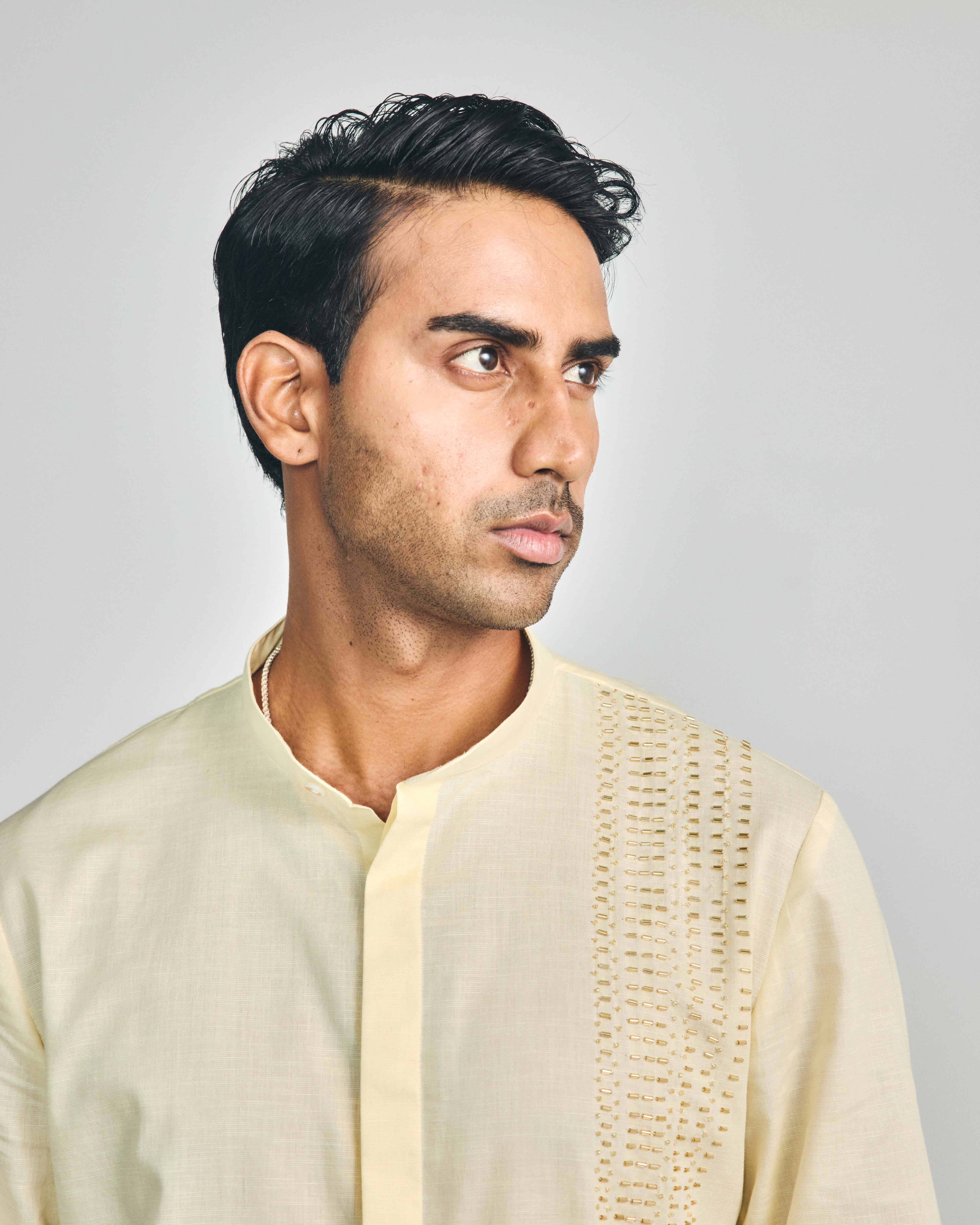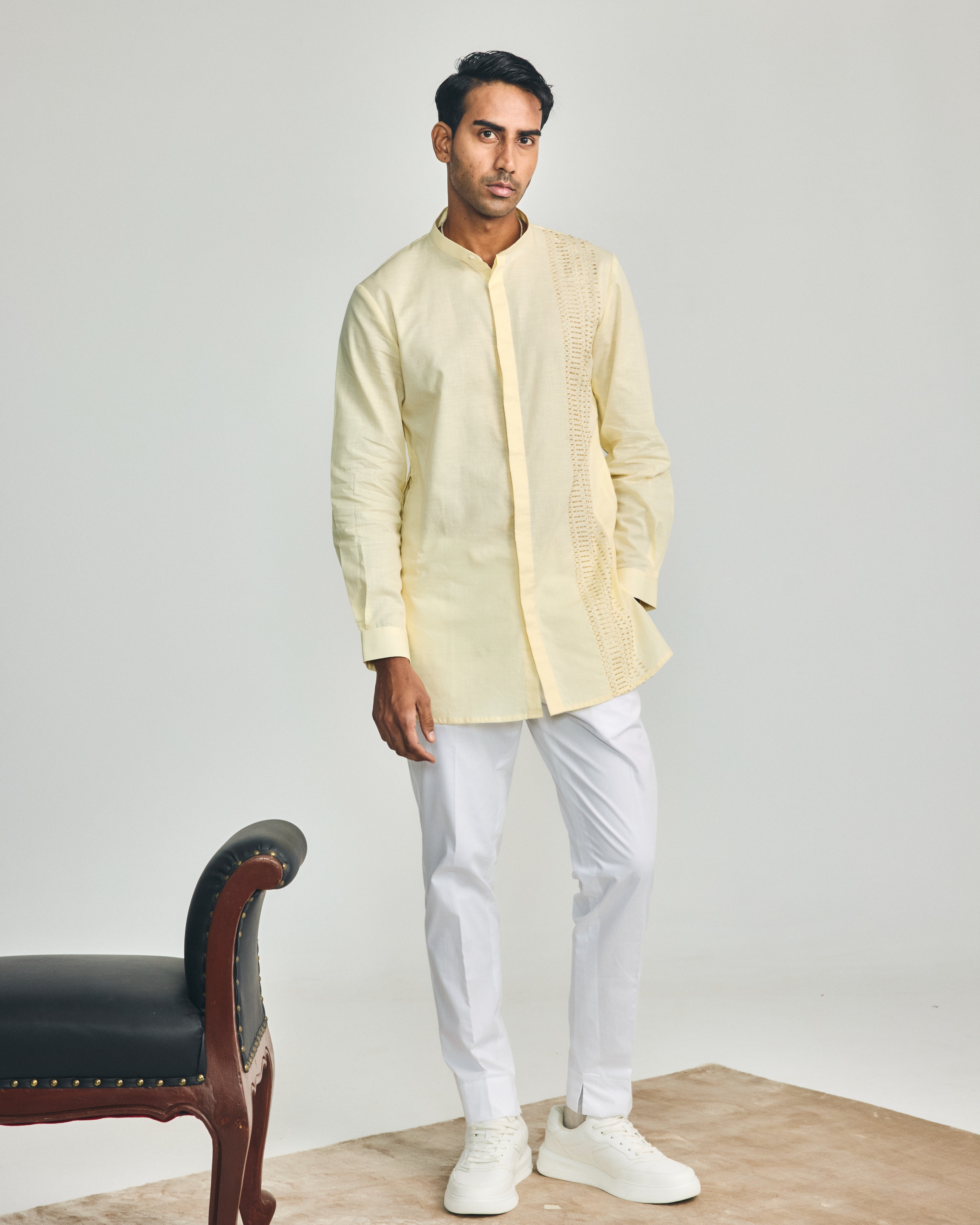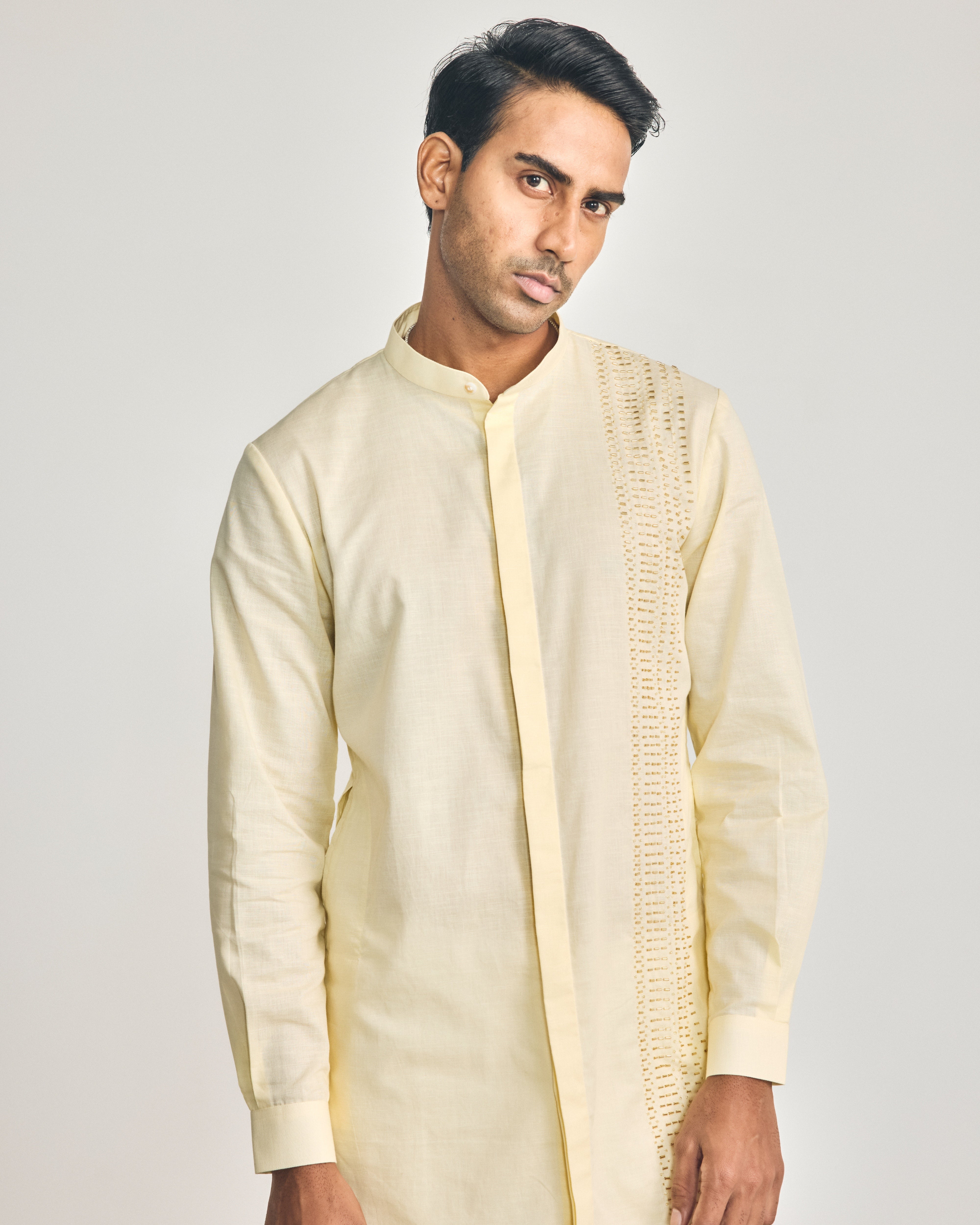 This butter yellow cotton-linen, shirt-style short kurta features a mandarin collar, cuffed sleeves, two hip pockets, a concealed placket, and is enhanced with hand-embroidered cutdana on the left panel. It includes one component, and the kurta length is 32”. This listing is for the kurta only, which can be paired with our signature trouser-style pajama or wide-leg pajama.