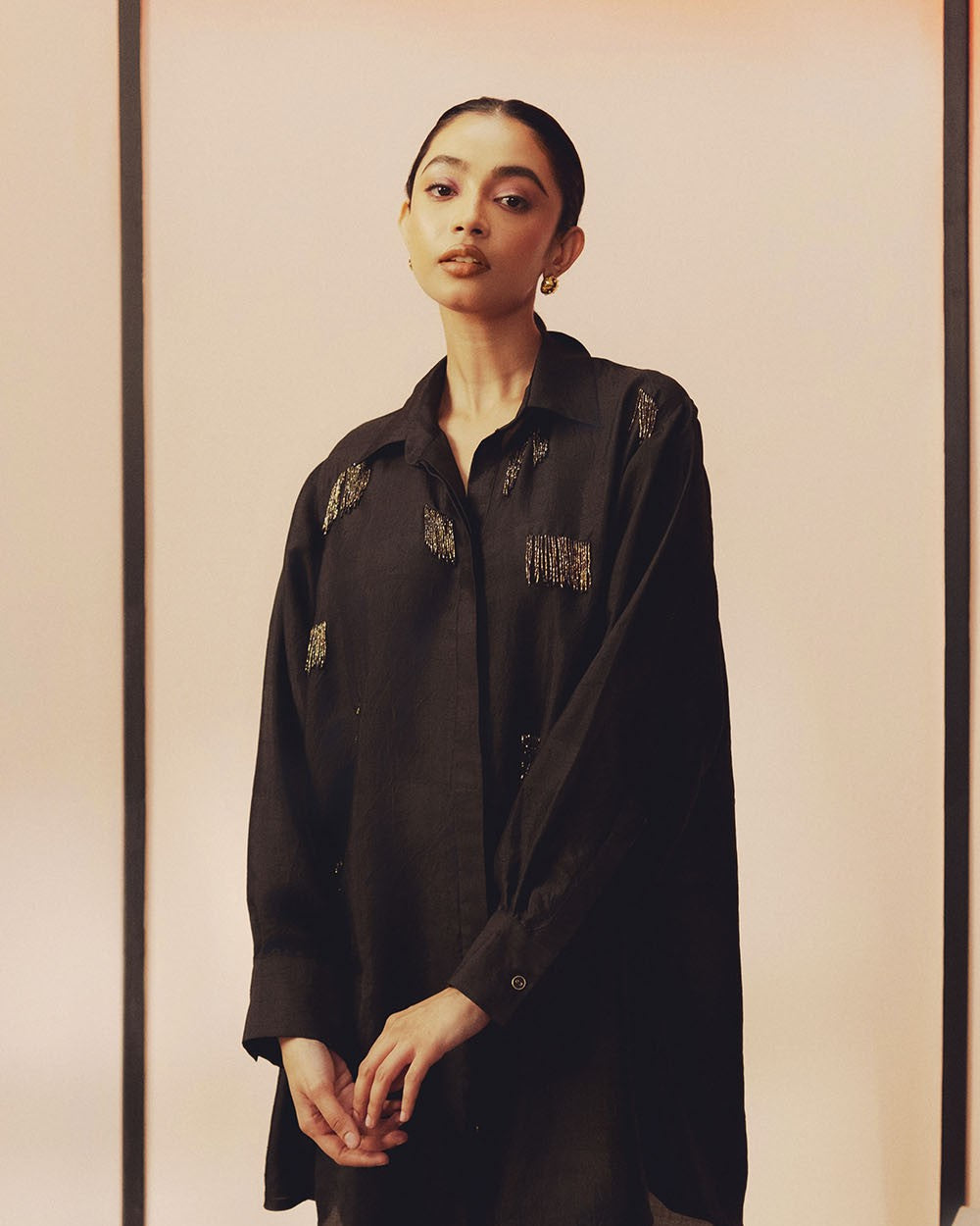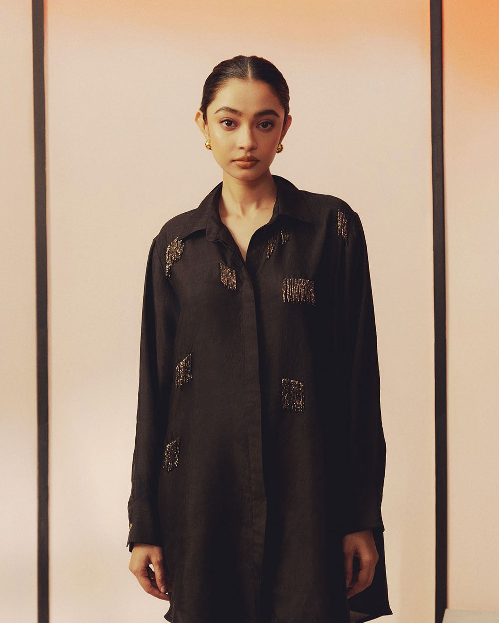 The handwoven mulberry silk dress features intricate metallic glass bead embroidery, designed in classic a batwing-fit silhouette.