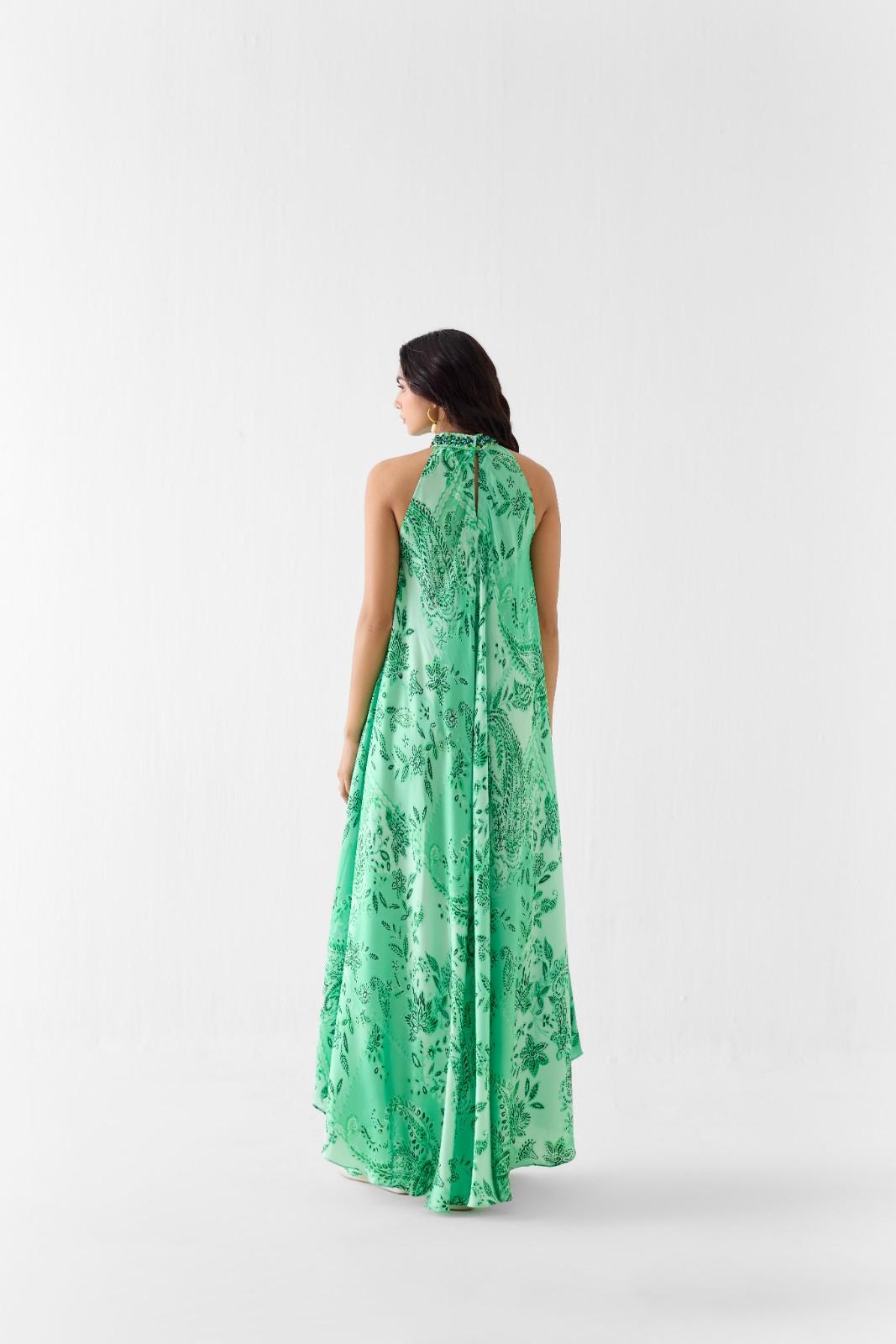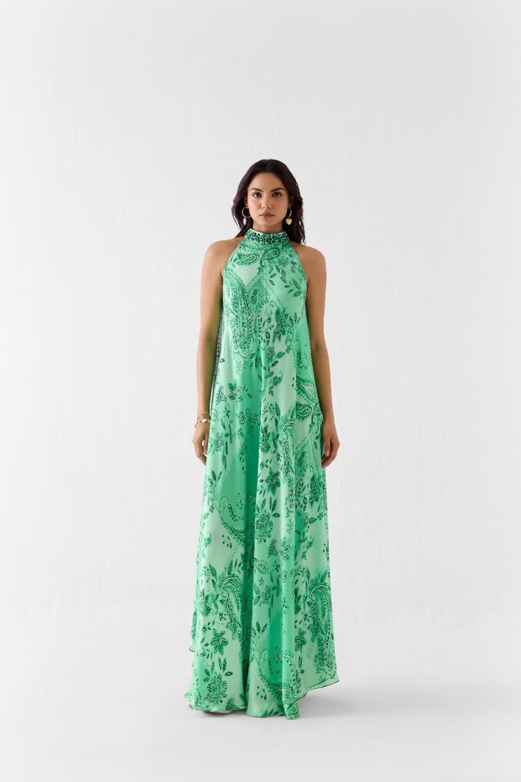 The Buta Halter Dress is crafted from our stunning vegan silk fabric and is a trans-seasonal statement piece, printed in a buta/paisley motif inspired by the heritage of Jaipur, featuring a floor-length flowy silhouette with halter sleeves and an embroidered stone and bead collar, finished with a back hook closure, perfect to style with heels for an elegant look, while the model is wearing a size S.