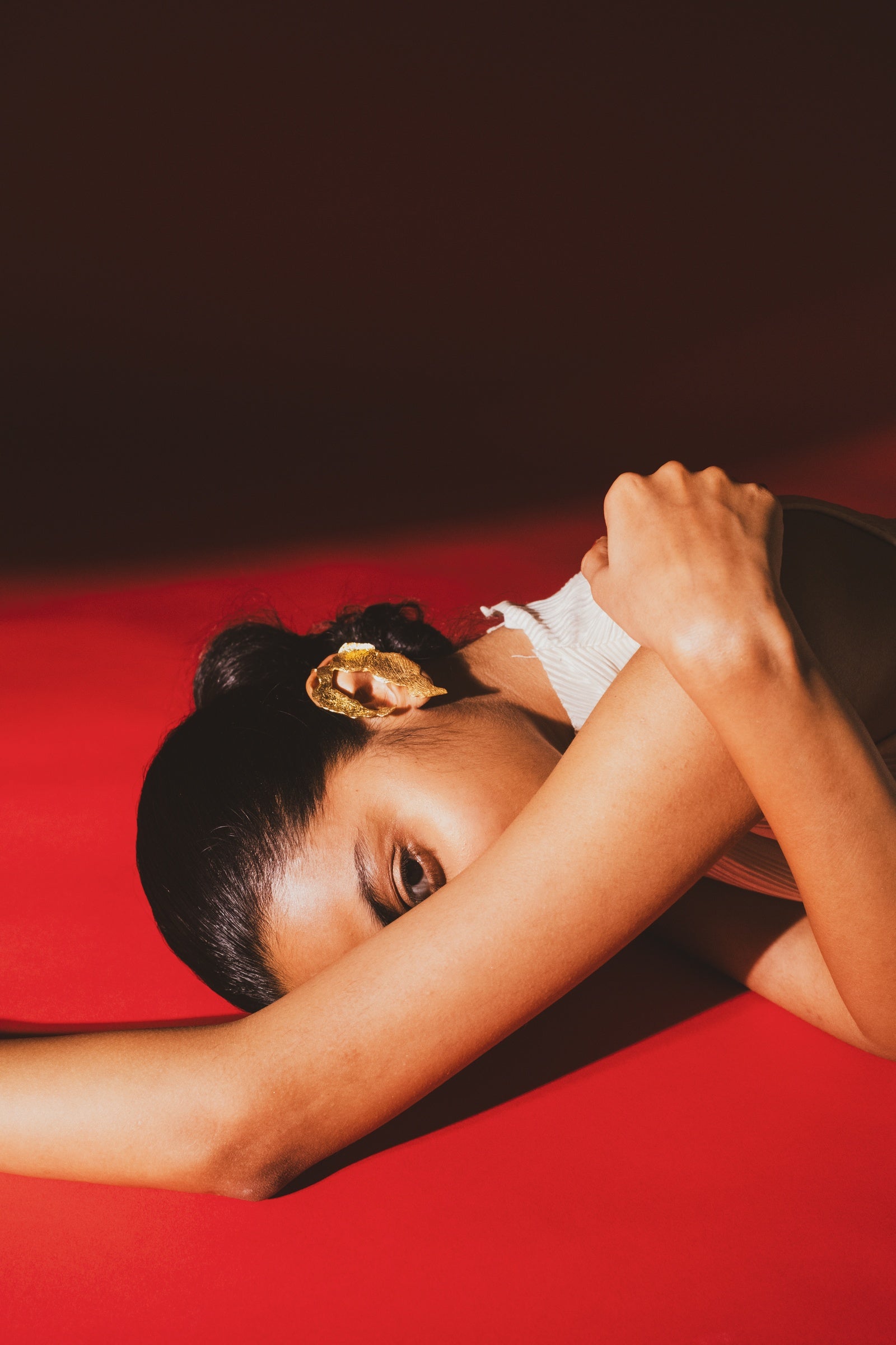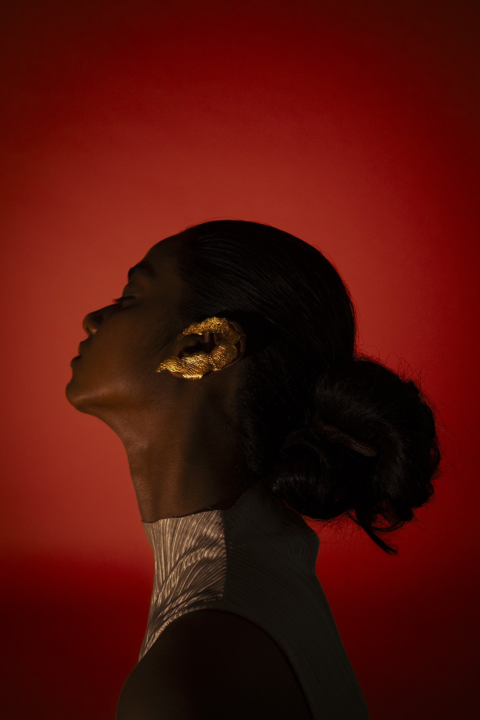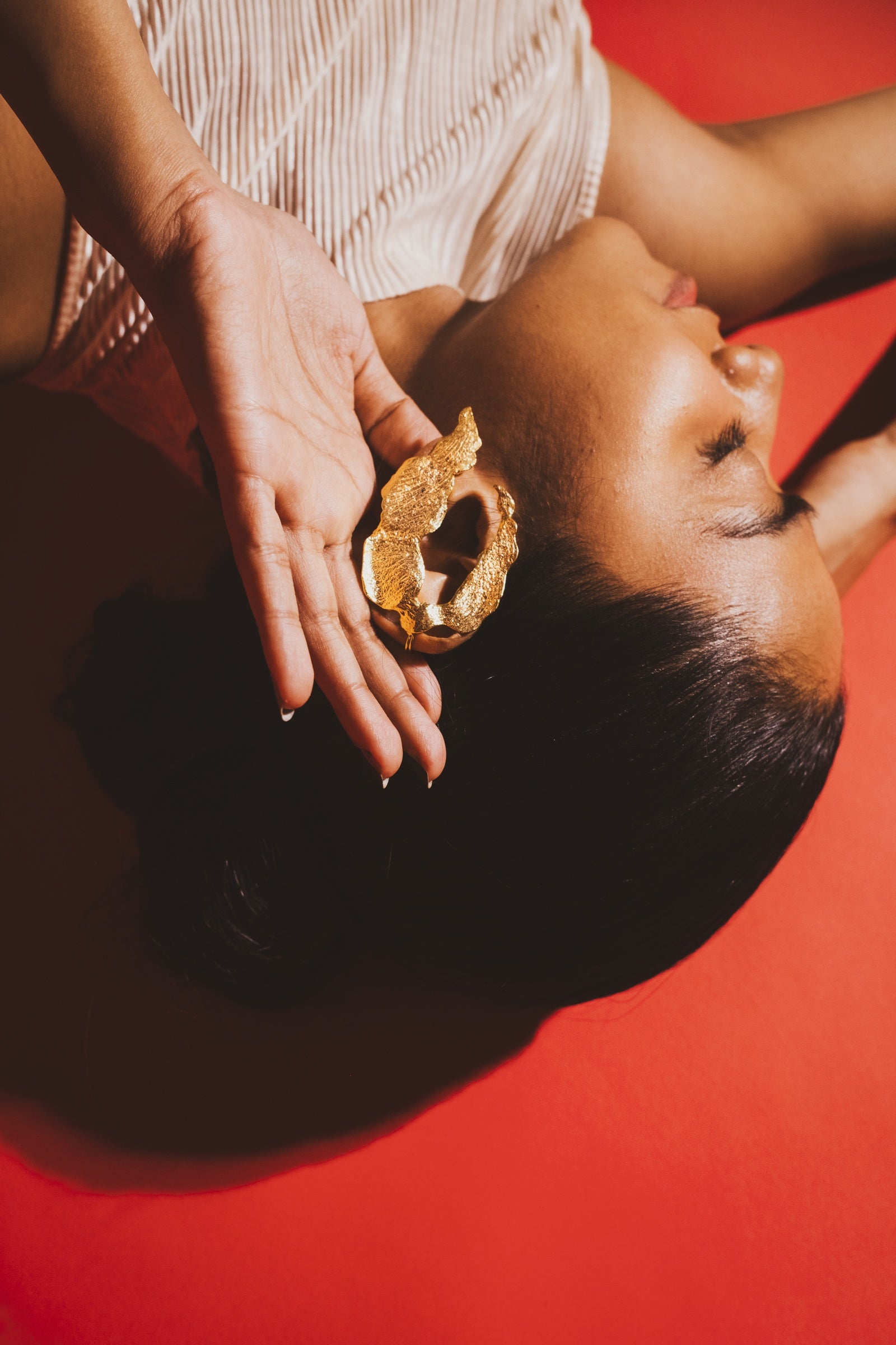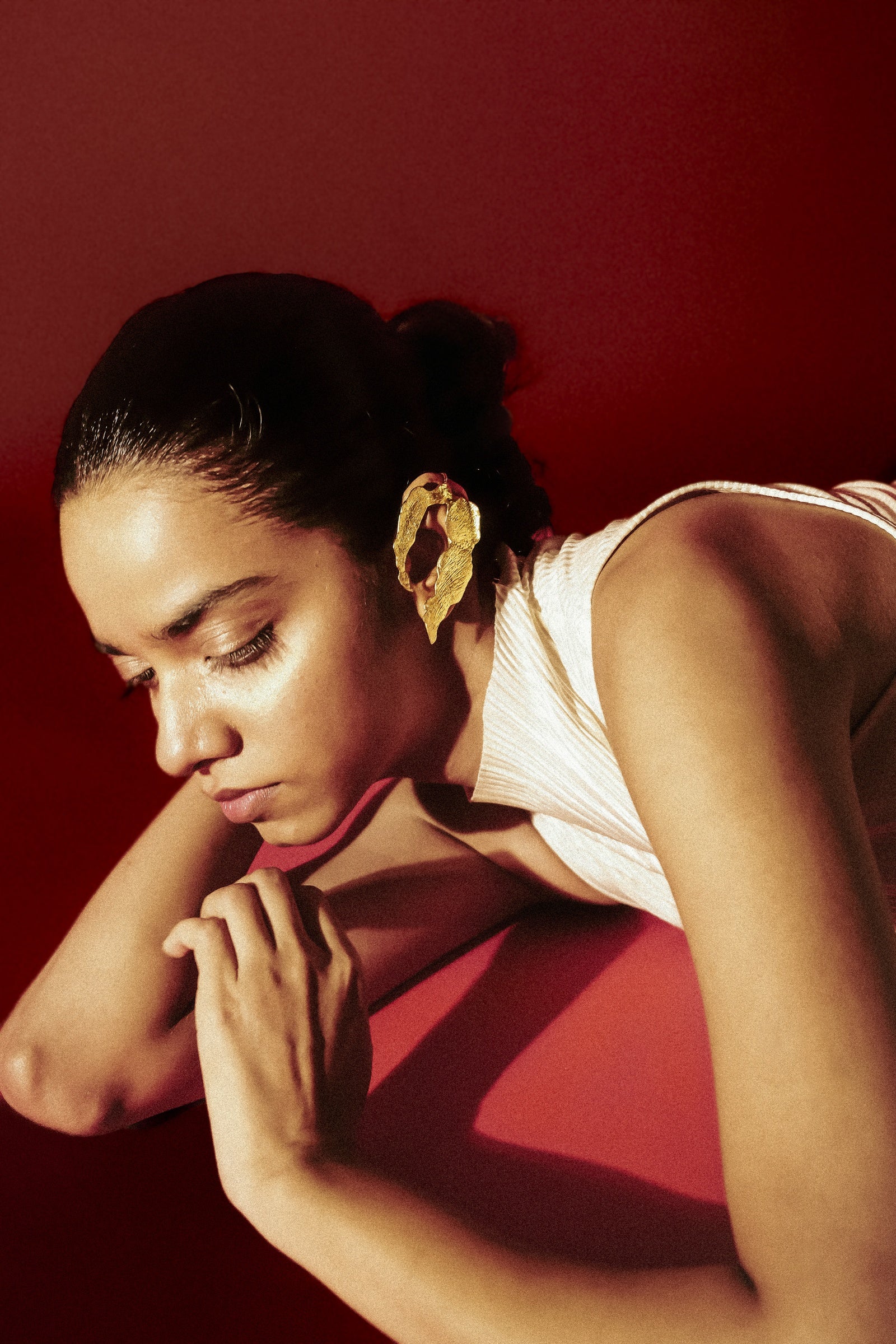 Sculptural mismatched earrings in textured gold feature organic, petal-like forms that play with light and asymmetry to create a bold, artful statement, handcrafted in brass with 18kt gold plating and E-coating