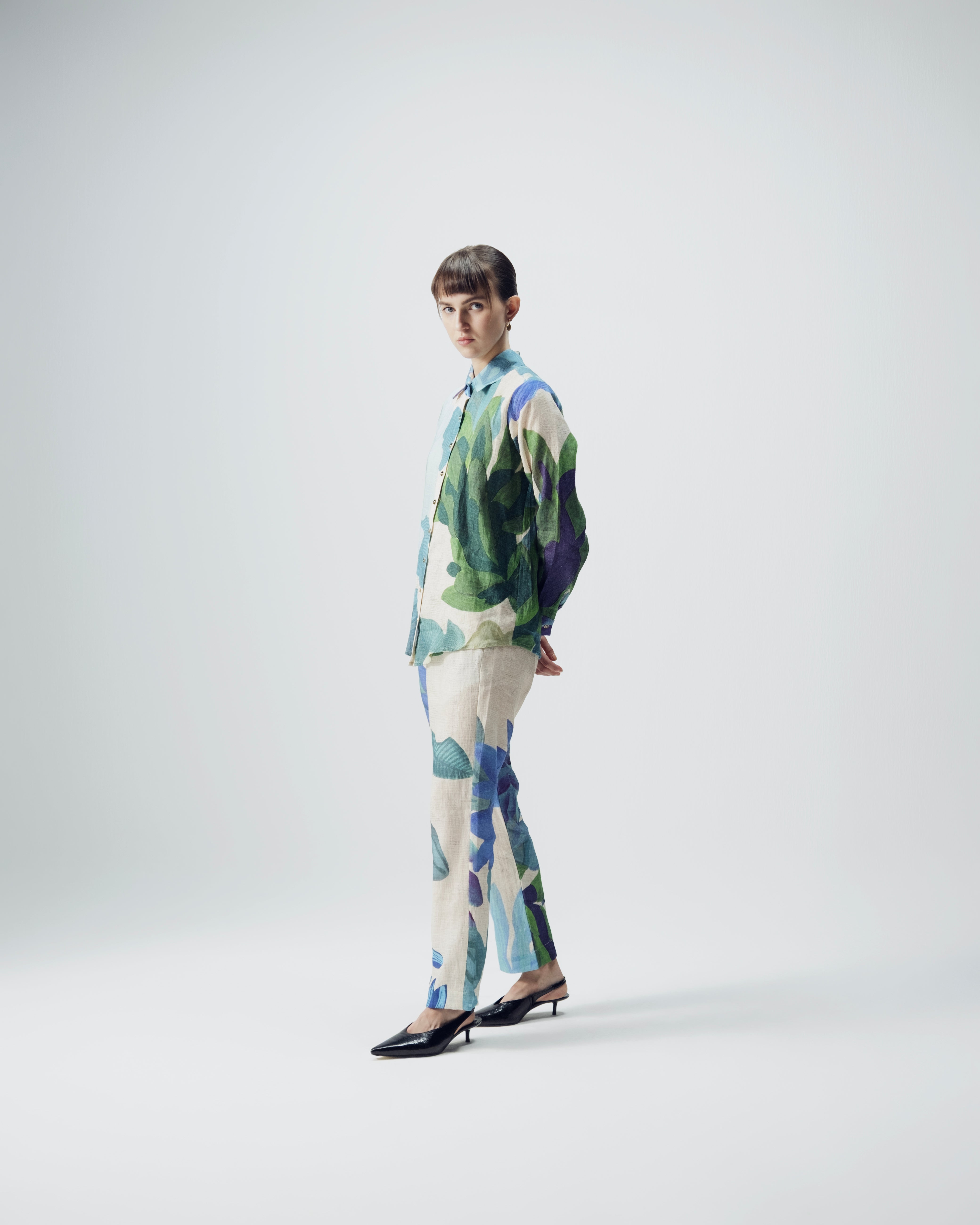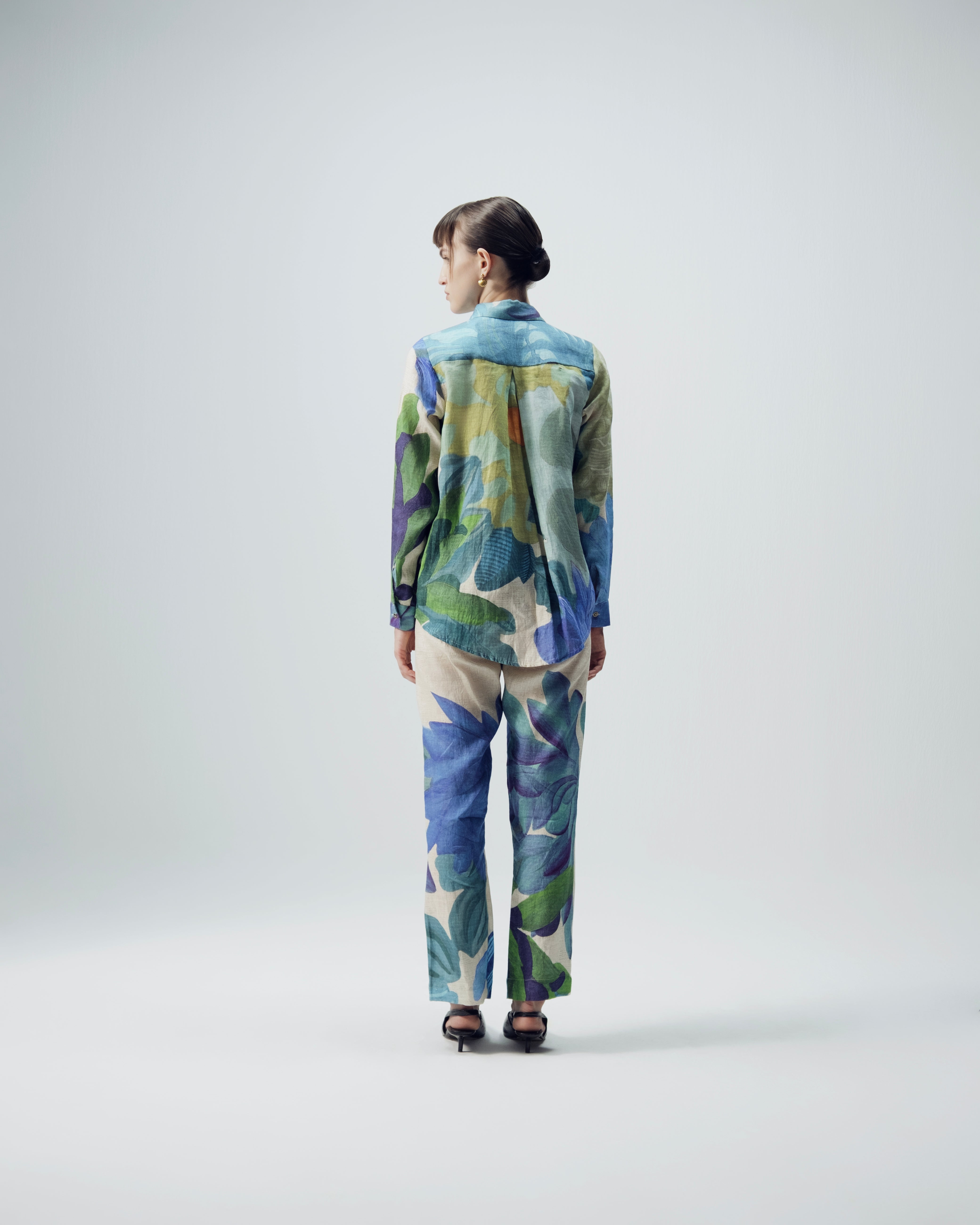 This coordinated shirt-and-trouser set features a bold, painterly botanical print in calming shades of blue, teal, green, and soft lilac, with oversized leaf motifs and abstract organic shapes that create a hand-painted, artistic effect; crafted from lightweight, breathable fabric, the relaxed straight-cut shirt with a classic collar pairs effortlessly with straight-leg trousers, allowing the set to be worn together for a polished, statement look or styled separately for versatile, contemporary elegance.