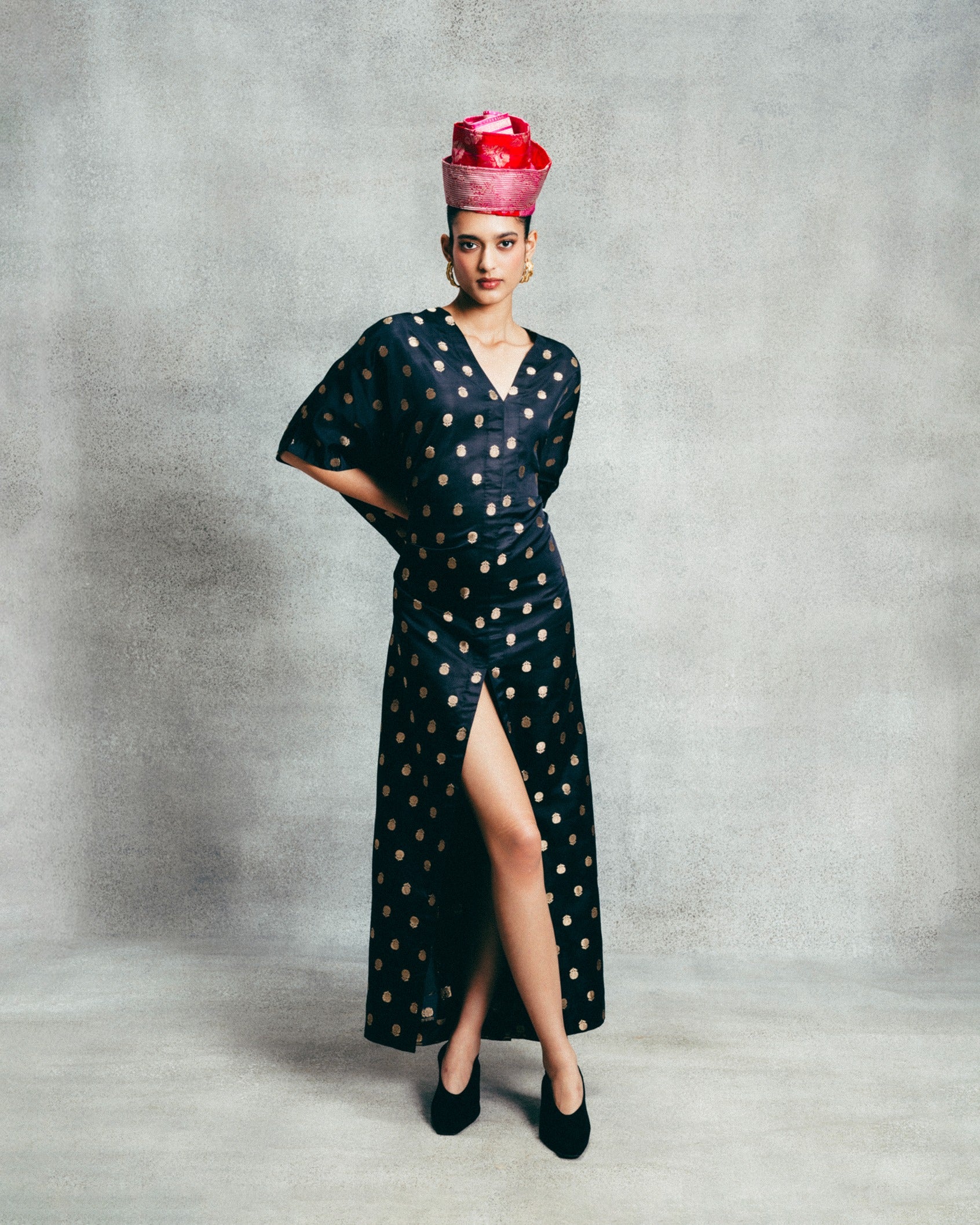 Crafted using the finest silks, Ekaya introduces one of its boldest new expressions yet, the Banarasi kaftan. This ebony kaftan is handwoven in Cutwork Banarasi technique and crafted in satin-silk. Cut in a fluid global silhouette, it features a deep V-neckline, kimono sleeves, and deep front slit. Designed for styling, this kaftan adapts to how you wear it, from day to evening, across settings and moods. It's made for the global woman with an Indian soul.