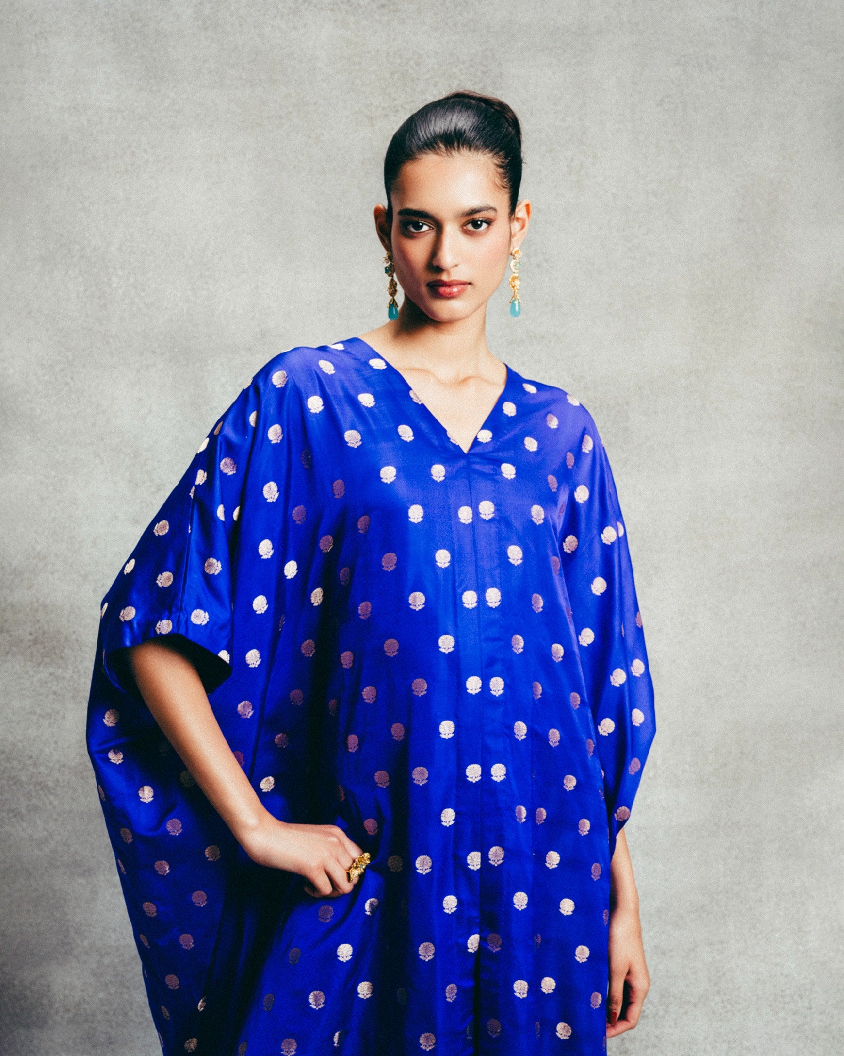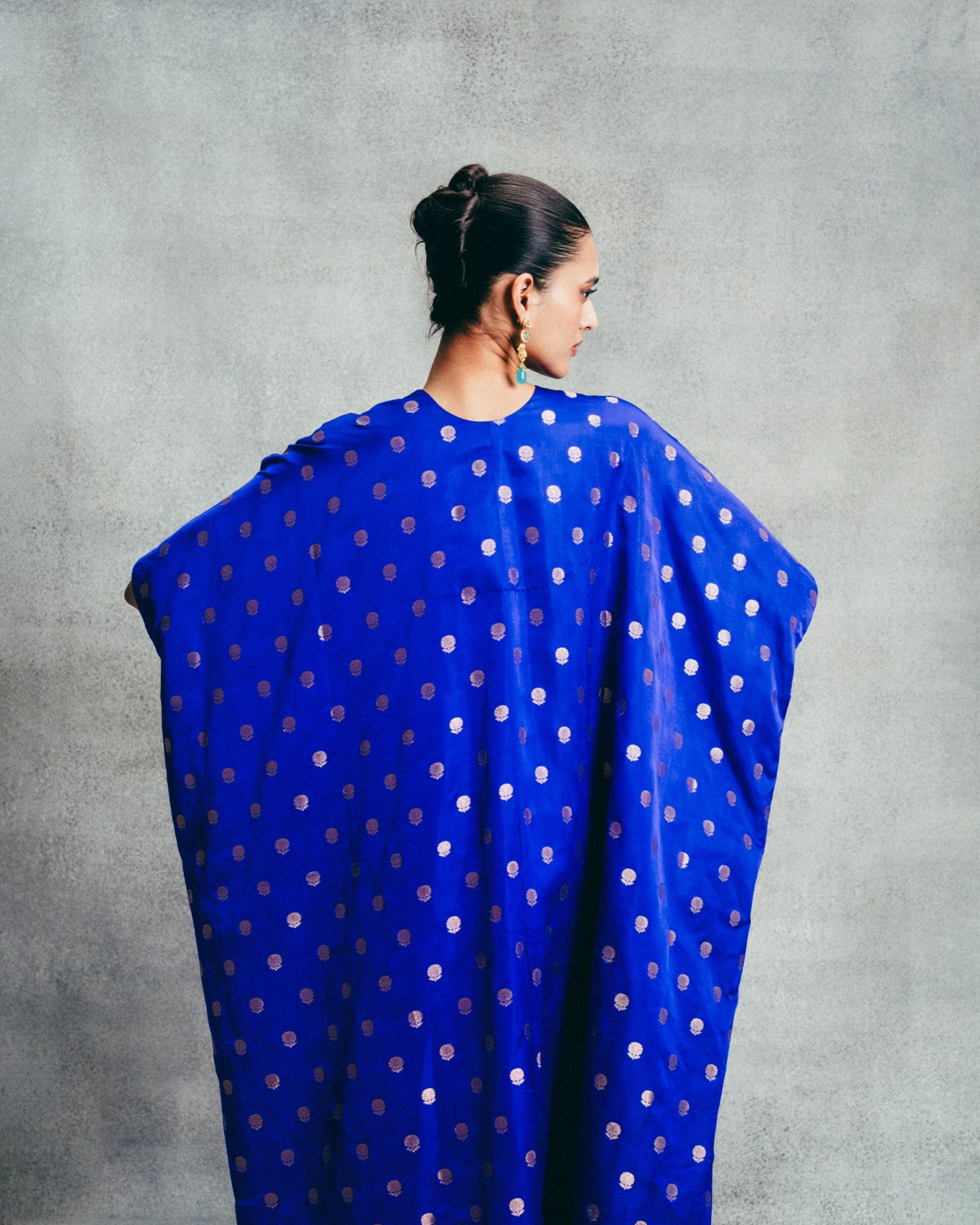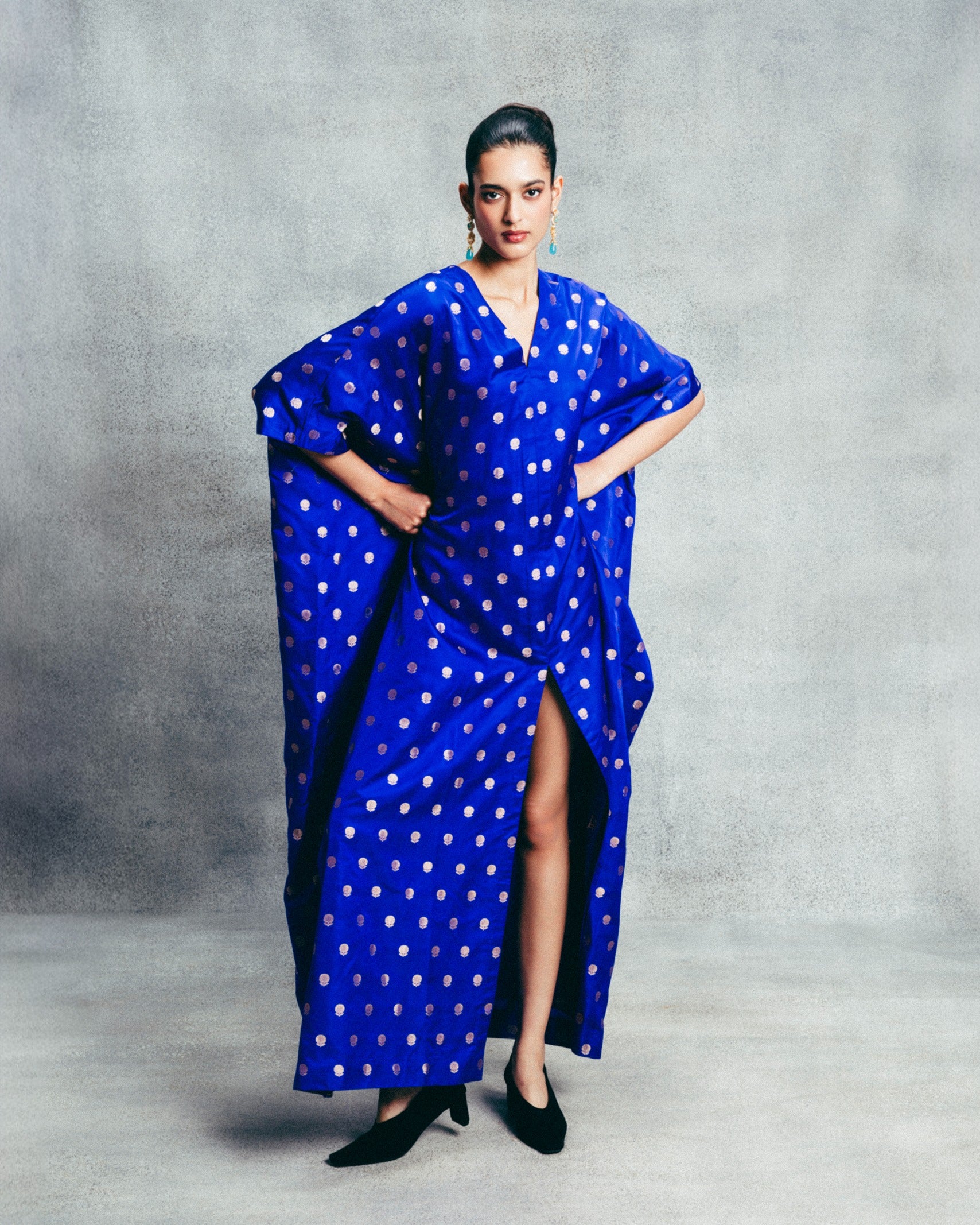 Crafted using the finest silks, Ekaya introduces one of its boldest new expressions yet, the Banarasi kaftan. This elcetric blue kaftan is handwoven in Cutwork Banarasi technique and crafted in satin-silk. Cut in a fluid global silhouette, it features a V-neckline, kimono sleeves and deep front slit. Designed for styling, this kaftan adapts to how you wear it, from day to evening, across settings and moods. It's made for the global woman with an Indian soul.