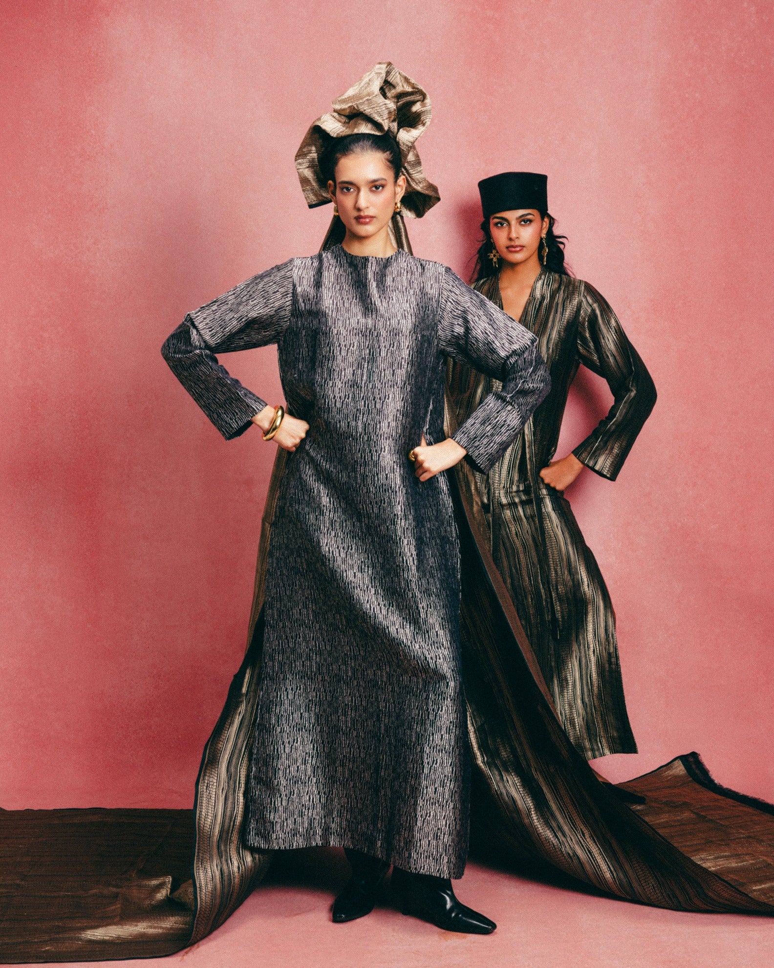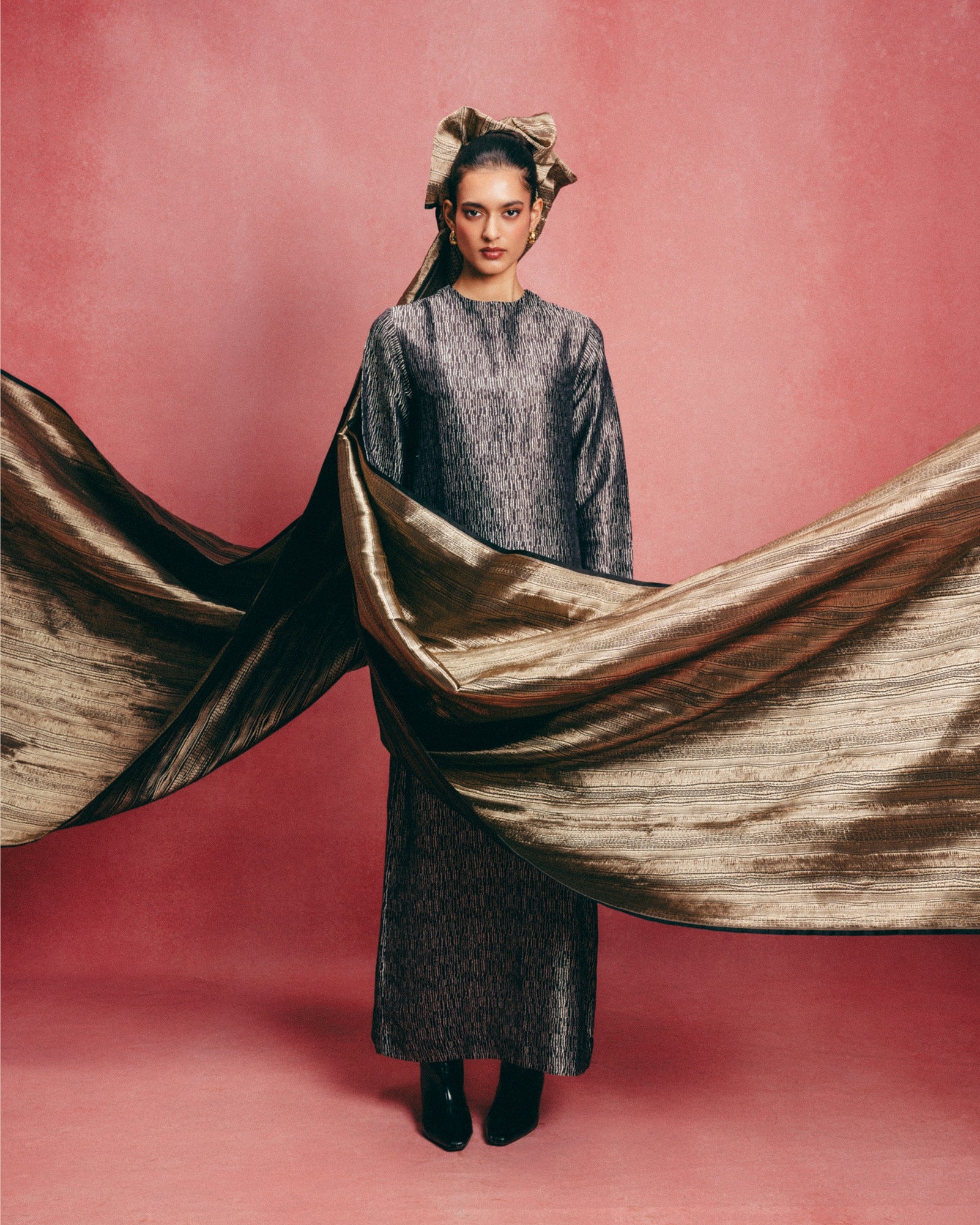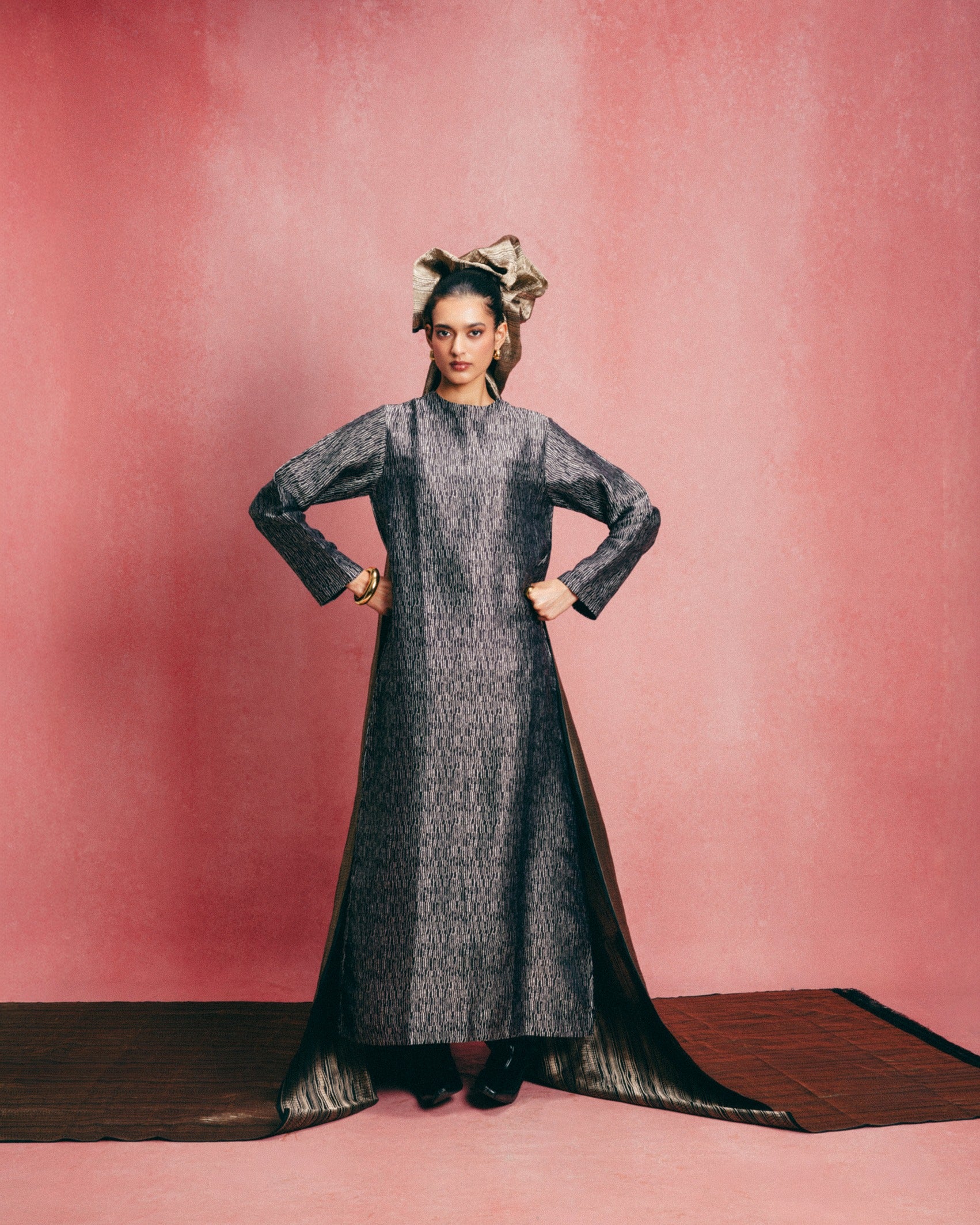 Crafted using the finest silks, Ekaya introduces one of its boldest new expressions yet, the Banarasi kaftan. This jet black kaftan is handwoven in Banarasi Emboss technqiue and crafted in pure silk. Cut in a fluid, global silhouette, it features side slits that feel both effortless and elevated. Designed for styling, this kaftan adapts to how you wear it, from day to evening, across settings and moods. It's made for the global woman with an Indian soul.