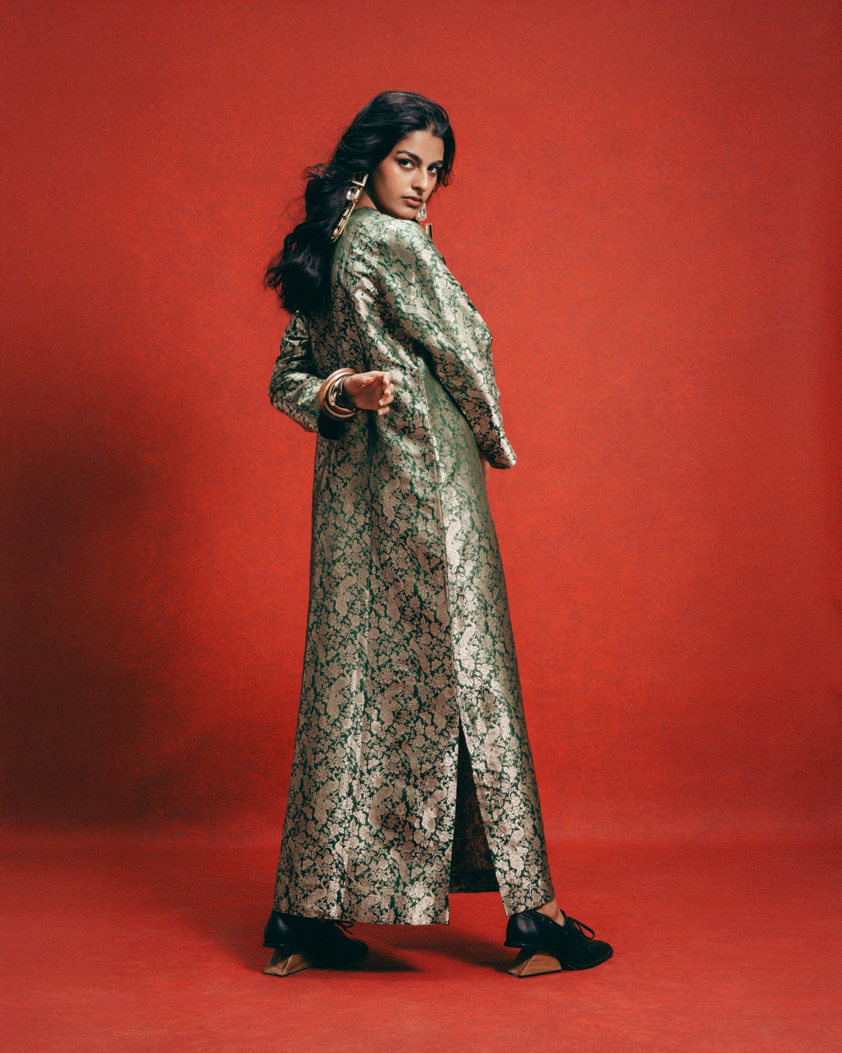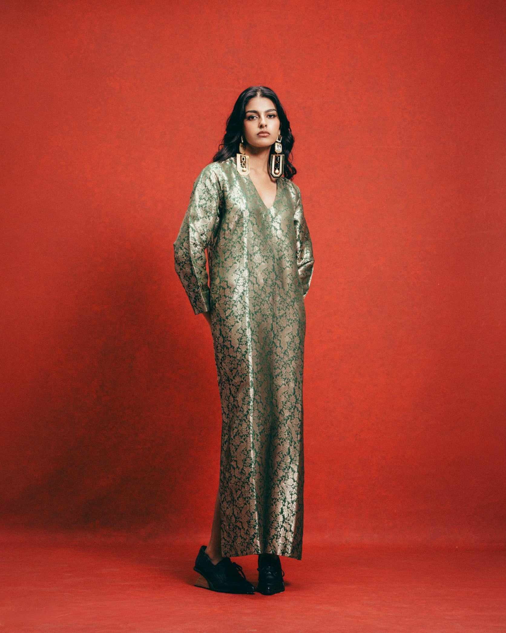 Crafted using the finest silks, Ekaya introduces one of its boldest new expressions yet, the Banarasi kaftan. This olive green kaftan is handwoven in Banarasi Emboss technqiue and crafted in pure silk. Cut in a fluid, global silhouette, it features a V-neckline and side slits that feels elevated. Designed for styling, this kaftan adapts to how you wear it, from day to evening, across settings and moods. It's made for the global woman with an Indian soul.