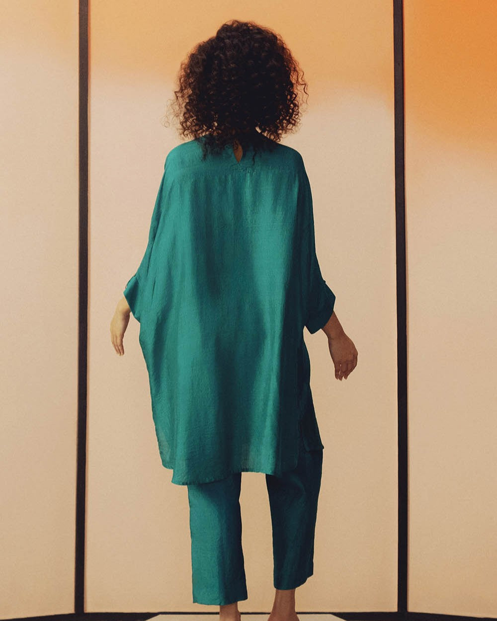 This handwoven mulberry silk tunic set features hand-embroidered pearl detailing on the tunic. Designed in classic relaxed-fit silhouette with a free-size tunic, it is paired with narrow, ankle-length pants featuring an elastic waistband and pockets on both  sides.